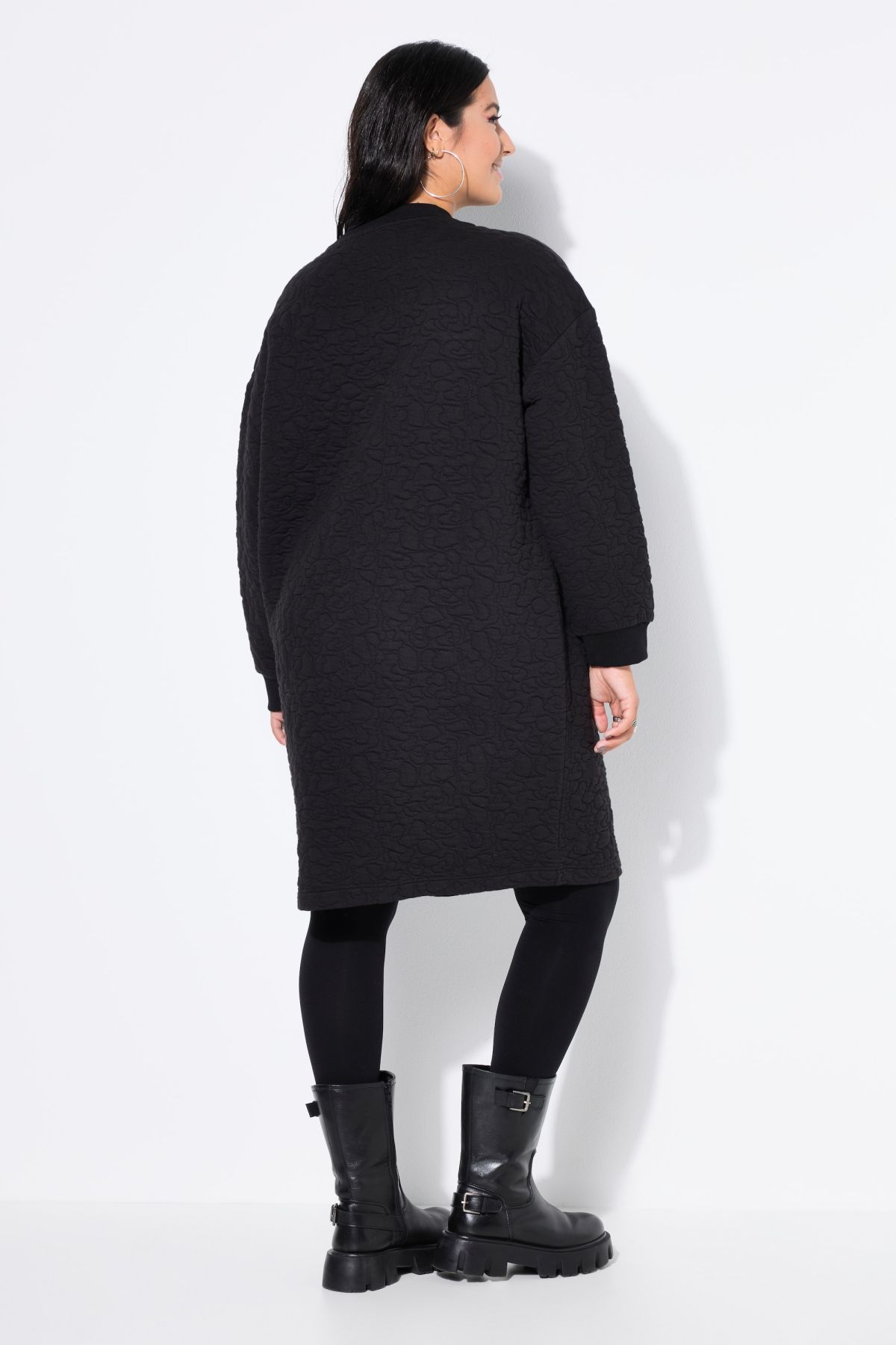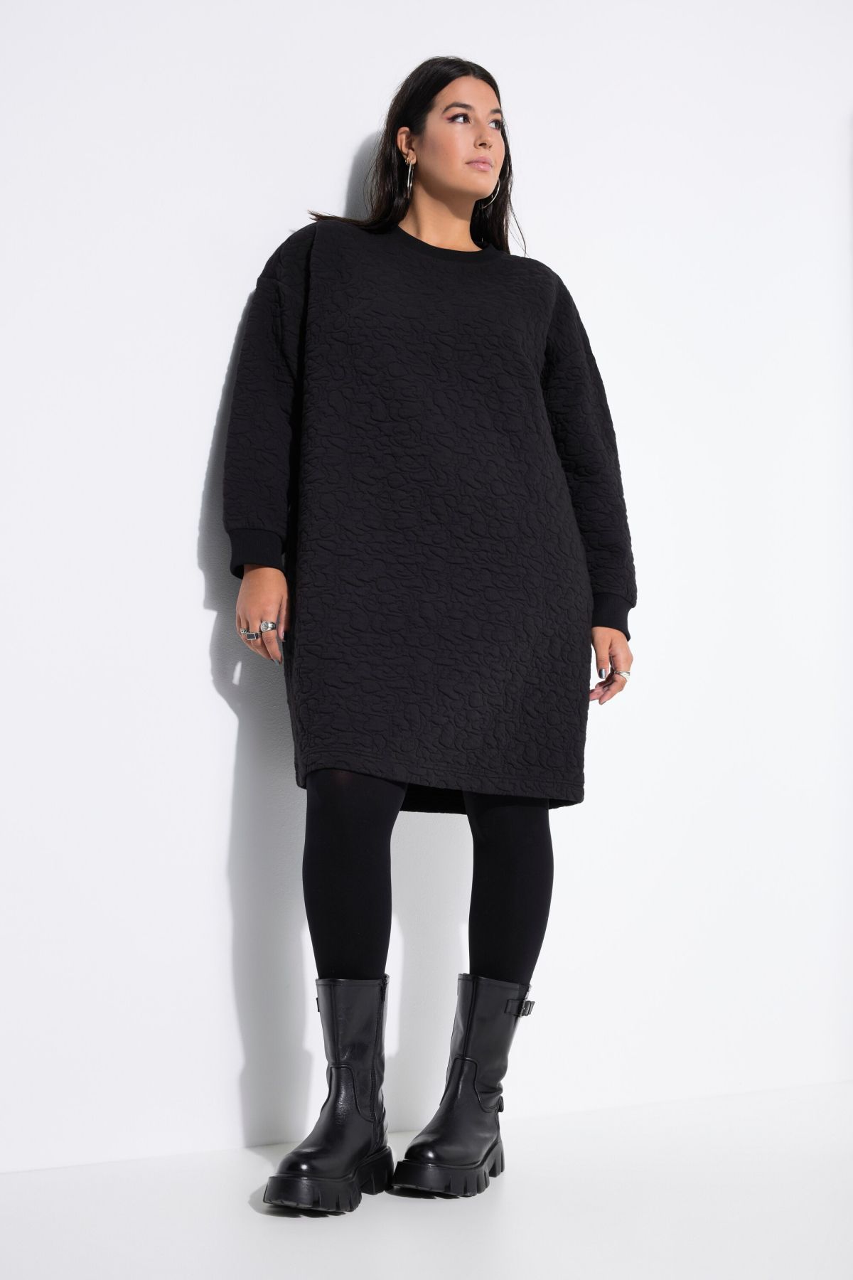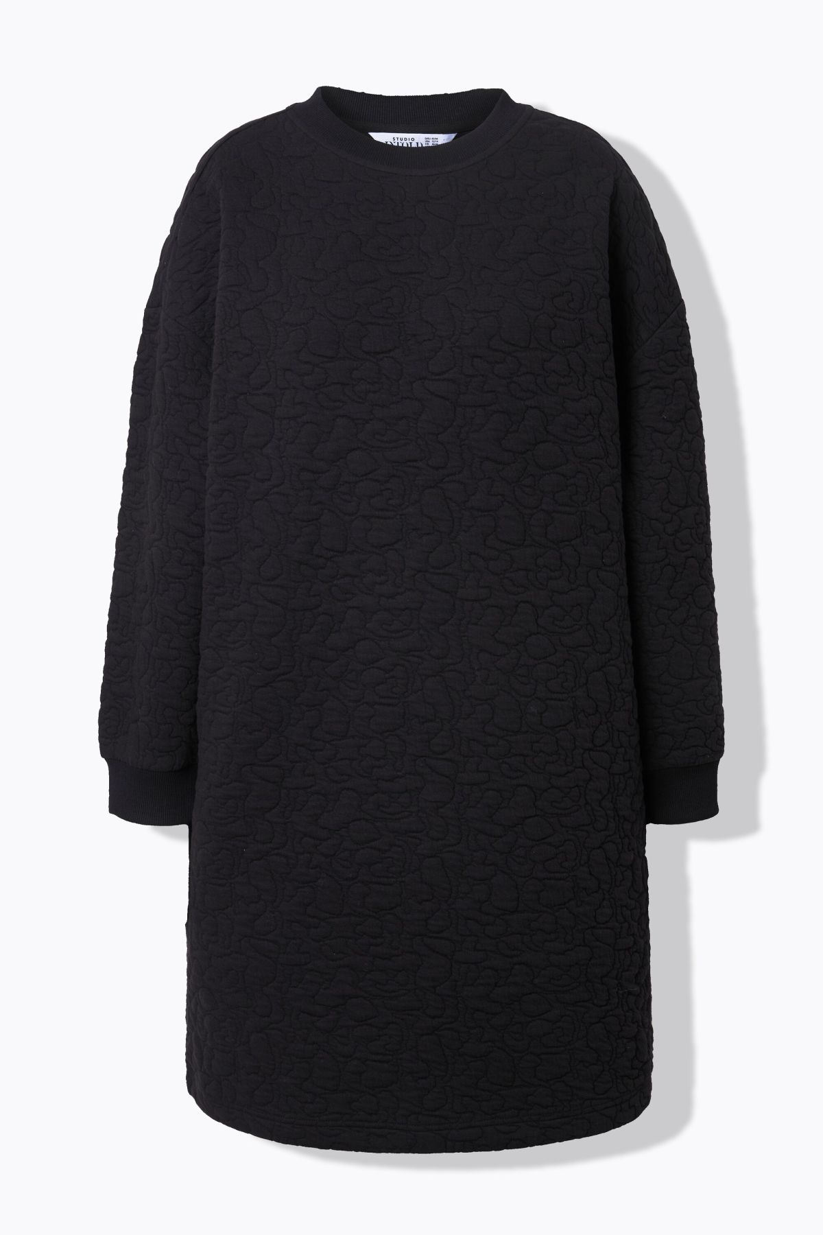 Рокля с леопардов принт и ватиран дизайн тип суитчър. С кръгло деколте и дълги ръкави с еластичен маншет.
