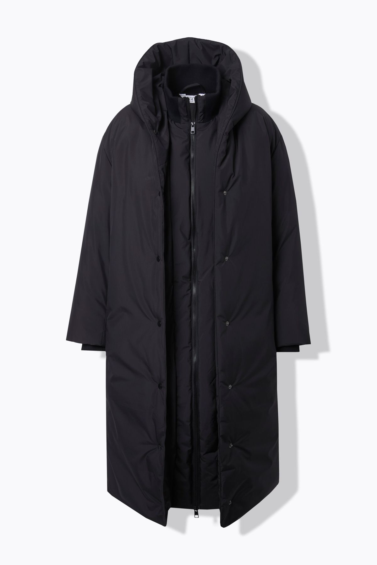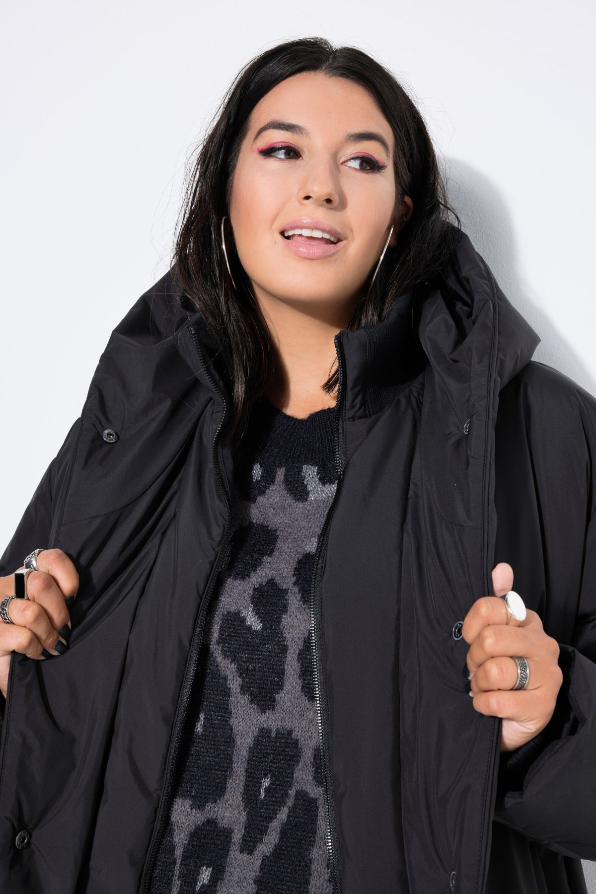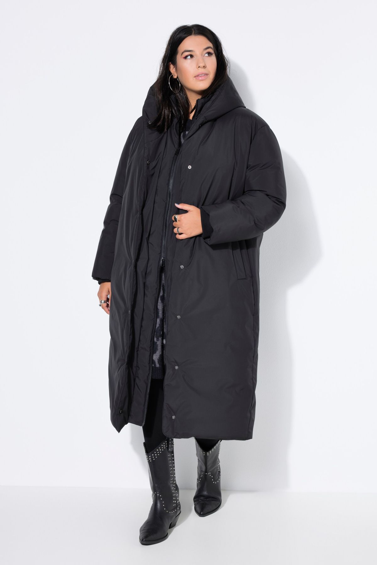 Дълга и голяма яка с качулка, скрит двупосочен цип, 2 джоба, краища на ръкавите с ветроустойчива защита, дължина приблизително 120 см.