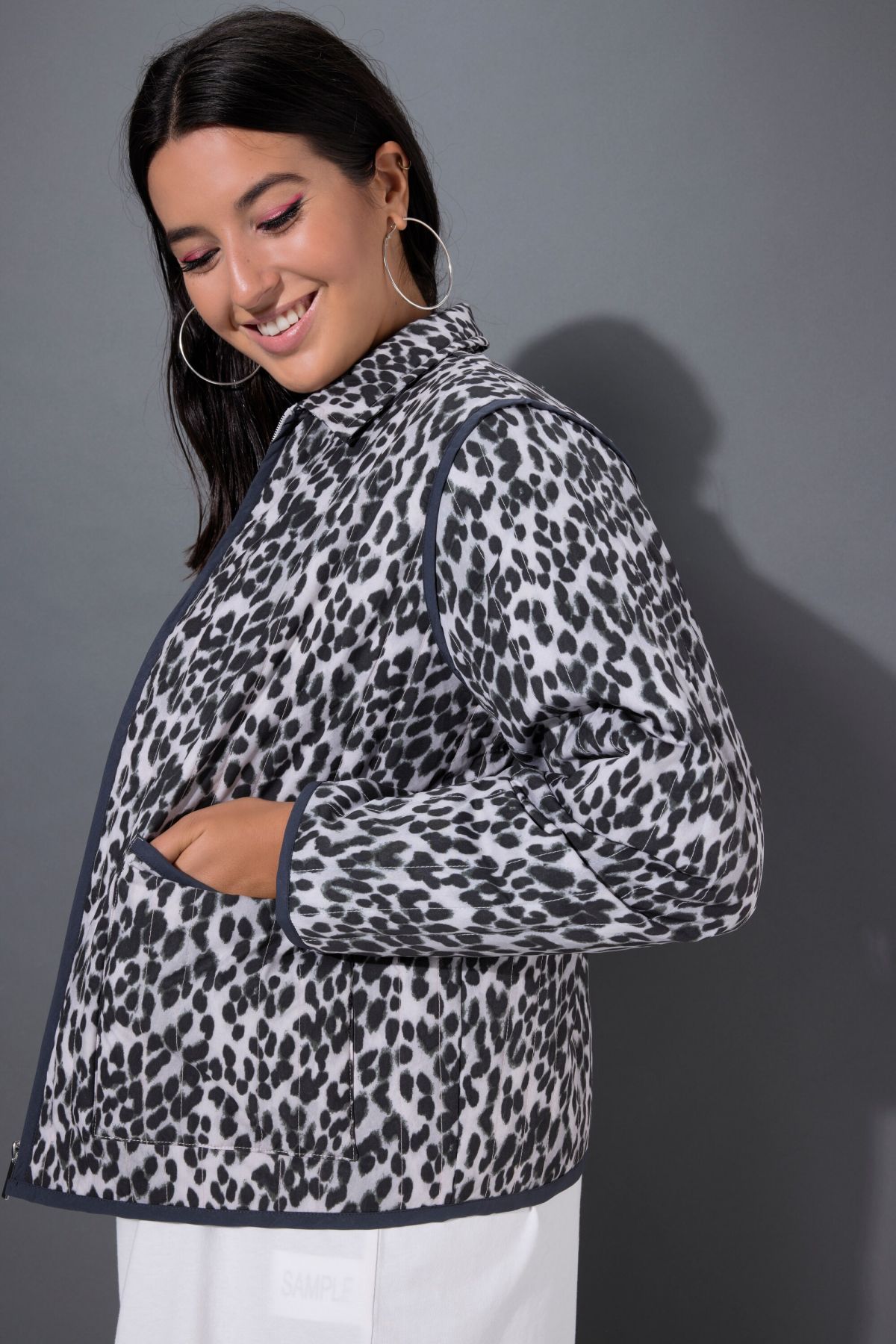Яке късо с леопардов принт с модерна О - форма. Дизайн с цип отпред, яка, странични джобове и дълги ръкави.