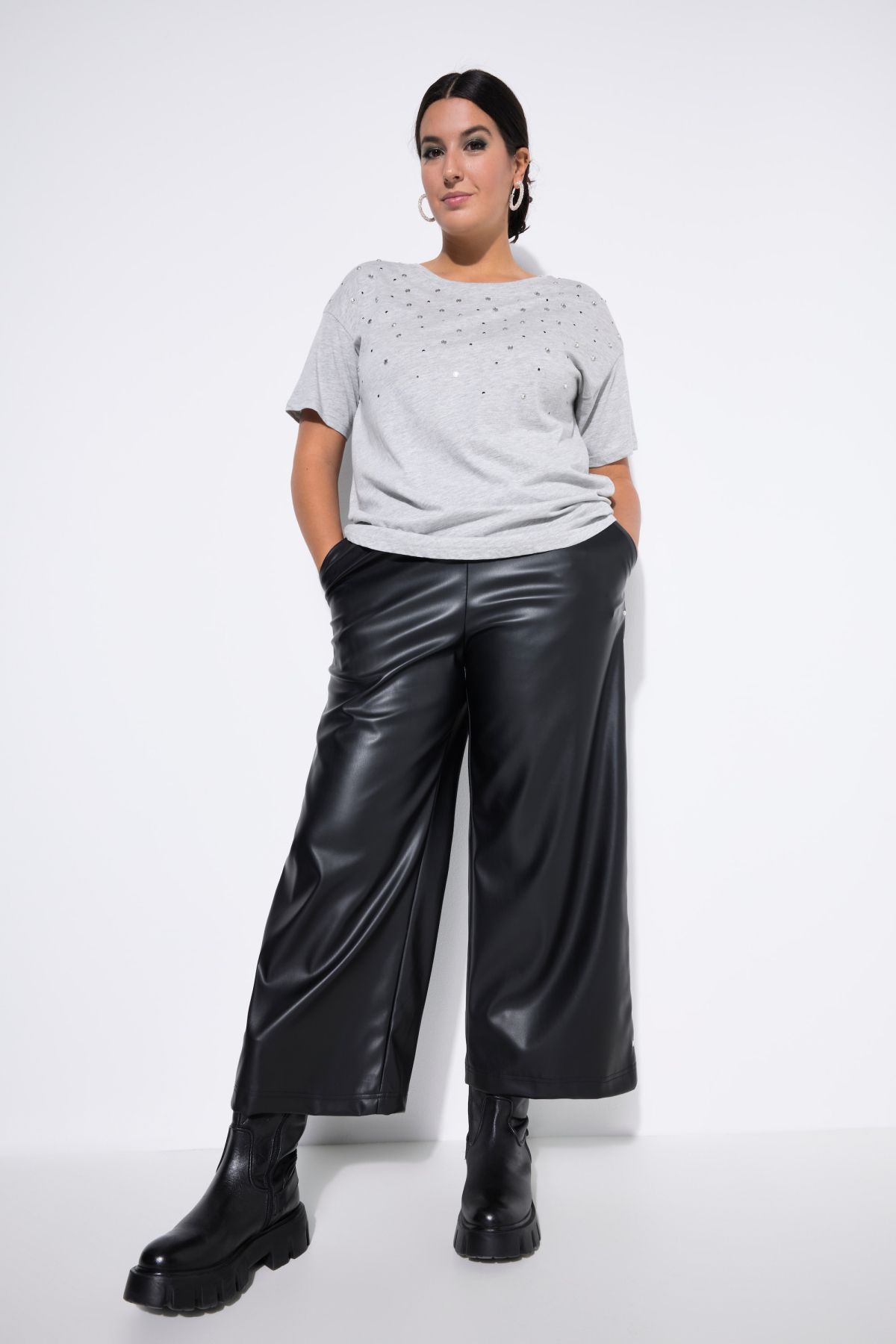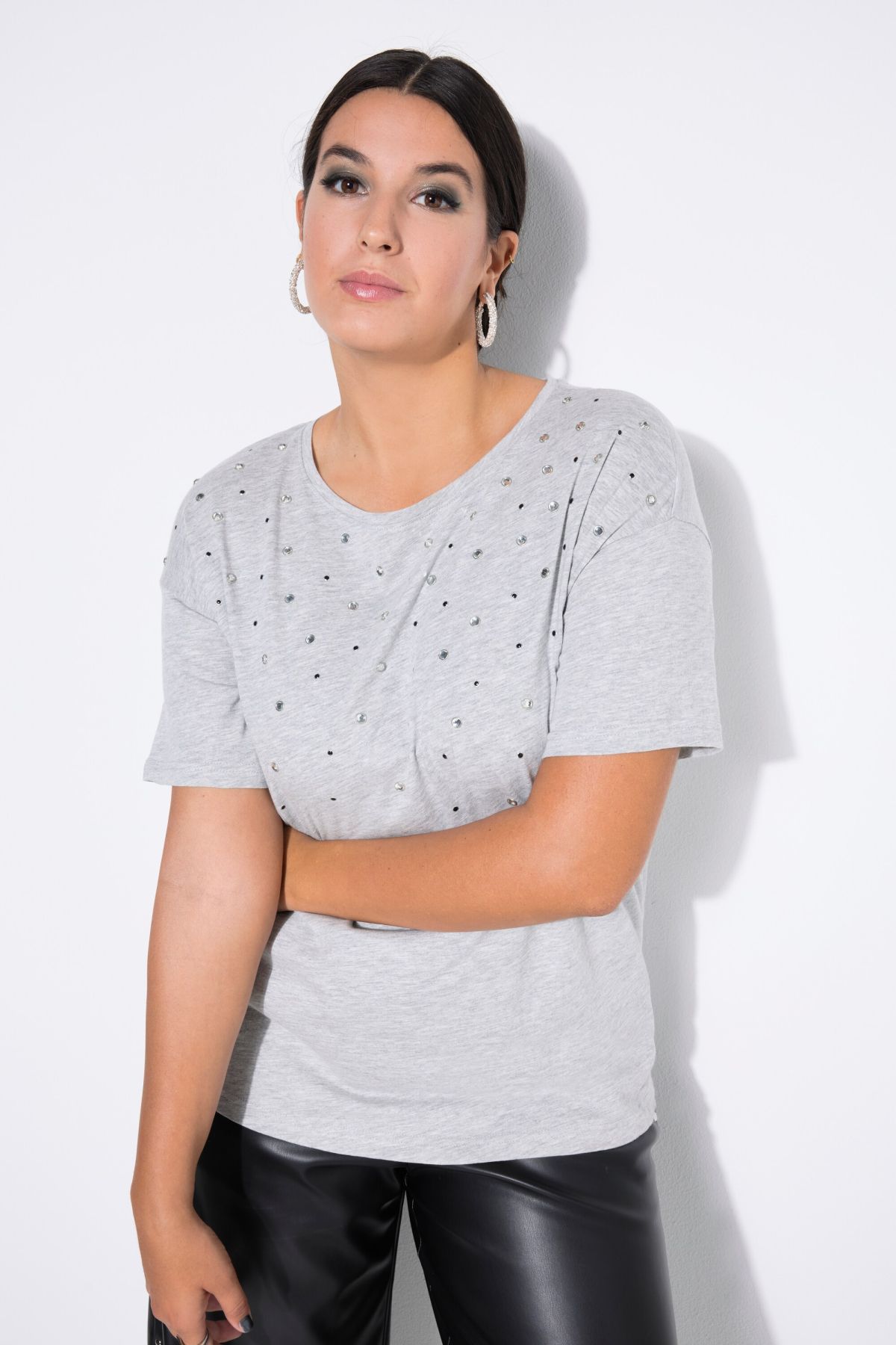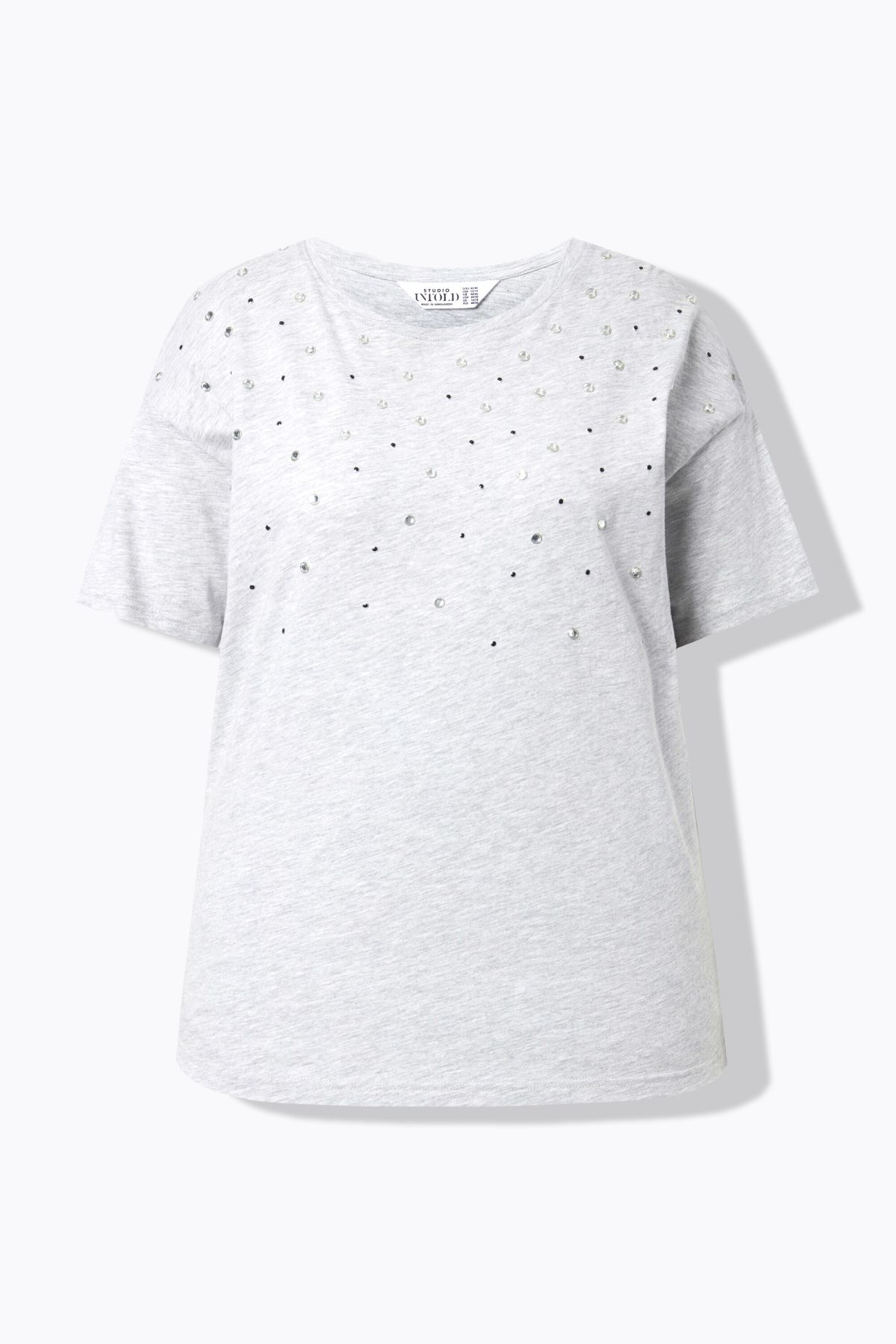 Тениска с декоративни метални камъчета за акцент. С кръгло деколте и къси ръкави. С паднали рамене. Стил и удобство в ежедневието.