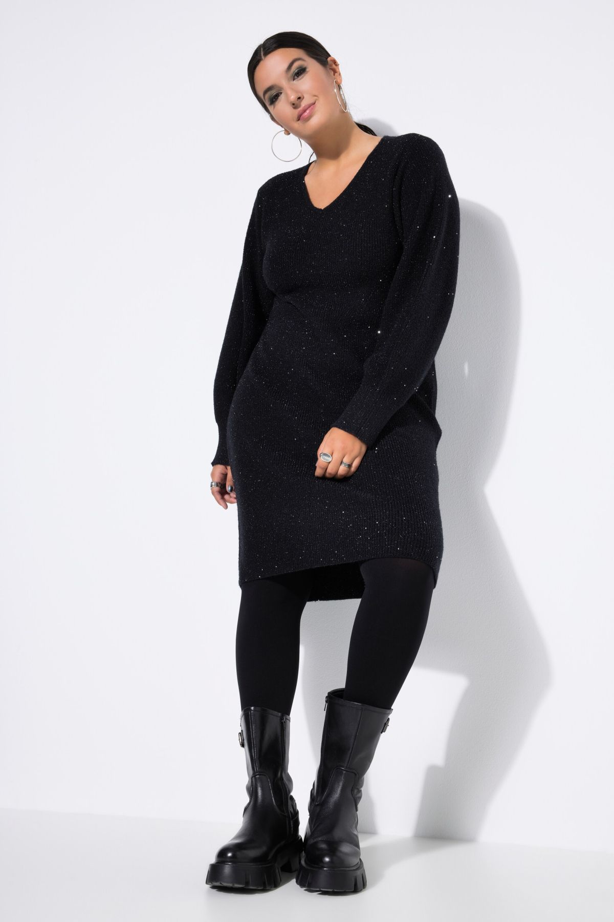 Плетена рокля с бляскави акценти и ламелени нишки. Със заоблено V - образно деколте и дълги ръкави. Перфектният избор за прохладните дни
