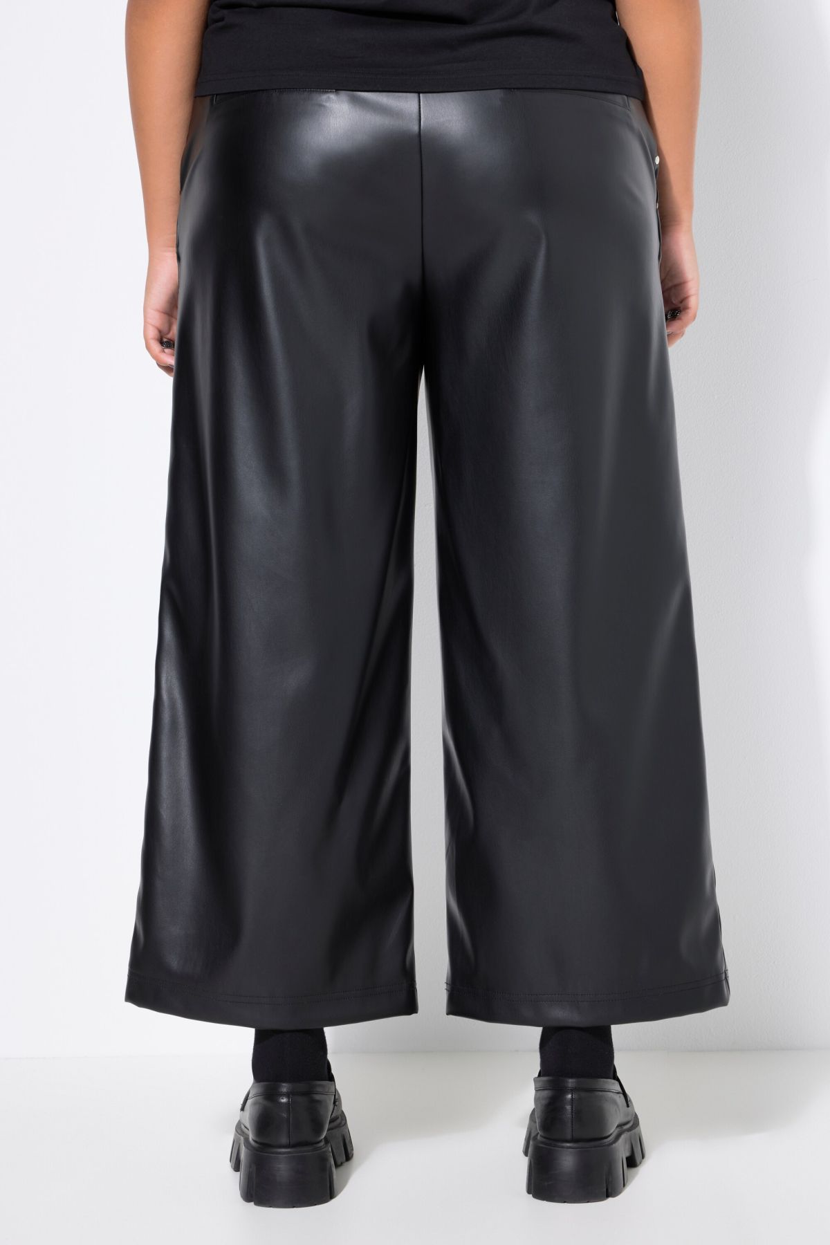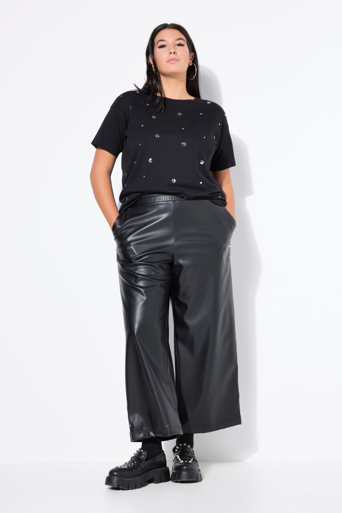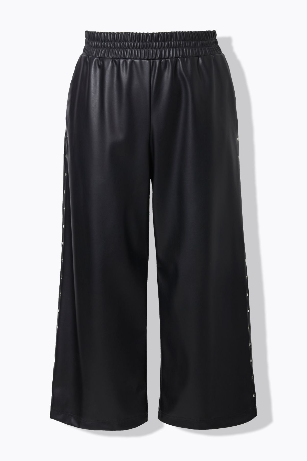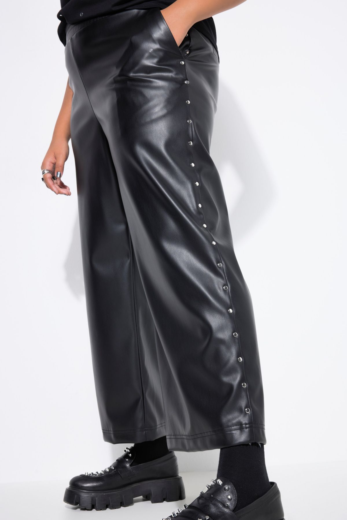 Панталон от изкуствена кожа с метални капси отстрани. С фиксирана талия с гайки за колан, копче и цип, със странични джобове.