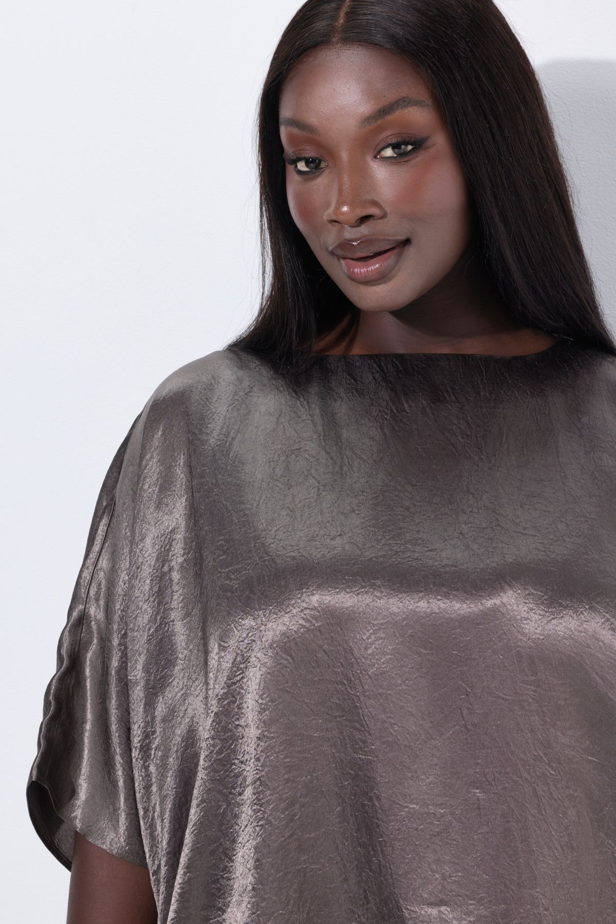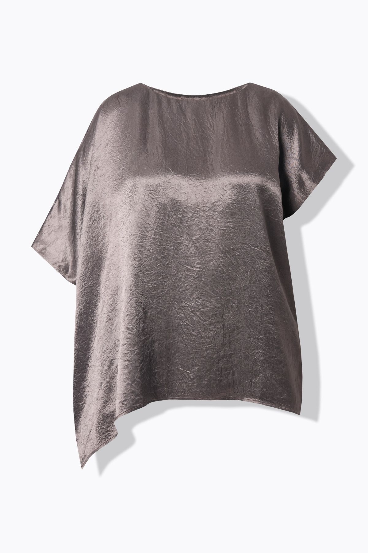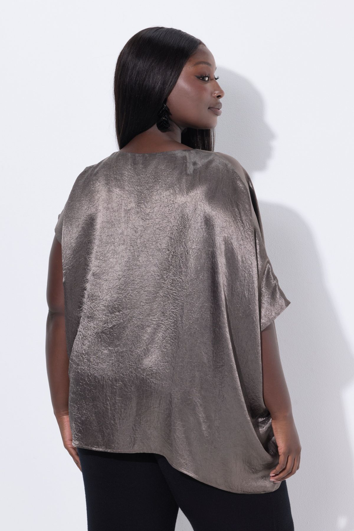 Асиметрична блуза с бляскава визия. С драпиран акцент. С кръгло деколте и паднали прилеп ръкави. Елегантна и стилна за всеки повод.