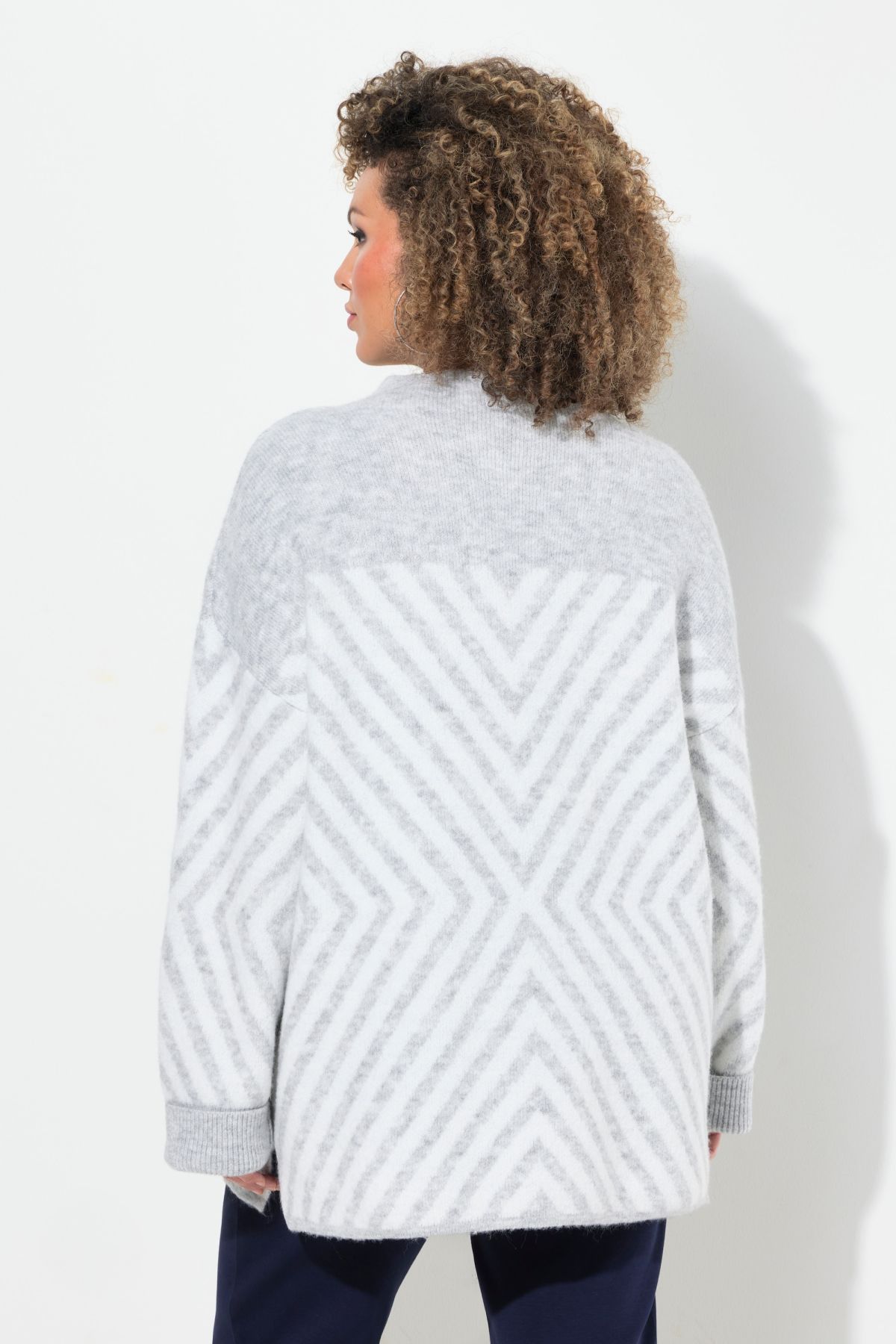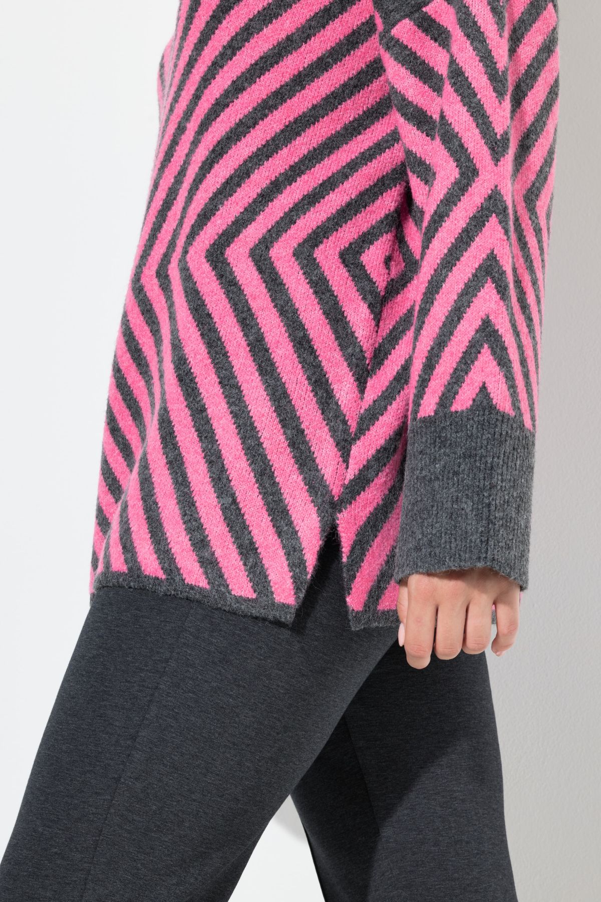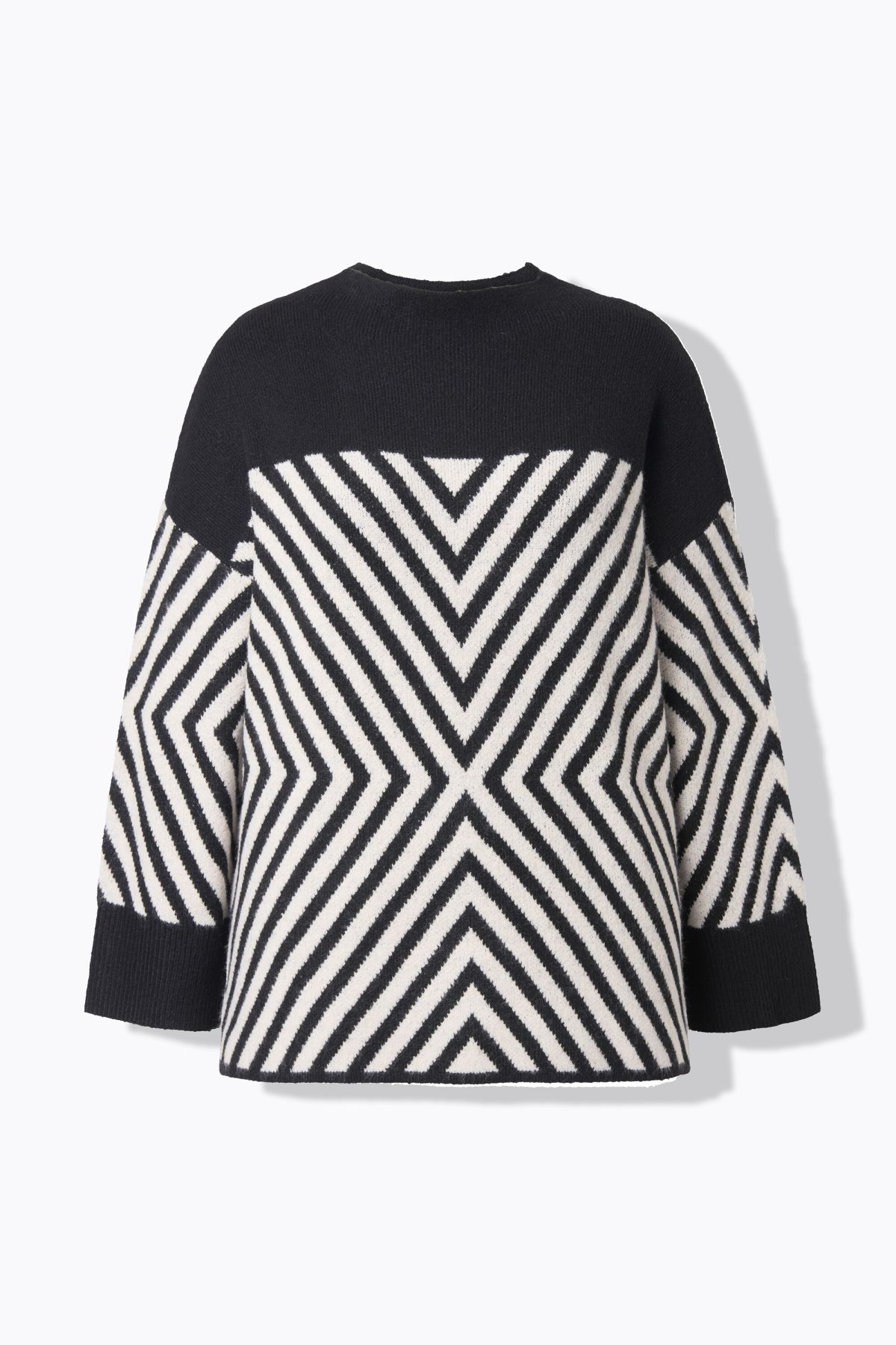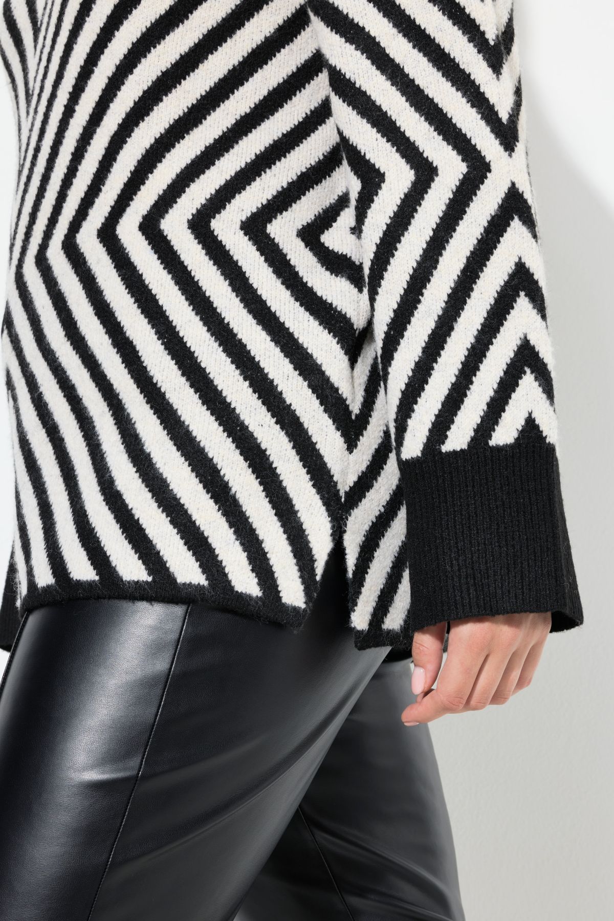 Пуловер с графични райета с широка изправена яка и разкроена кройка. Перфектно допълнение на зимния гардероб. С дълги ръкави и рипсени маншети.