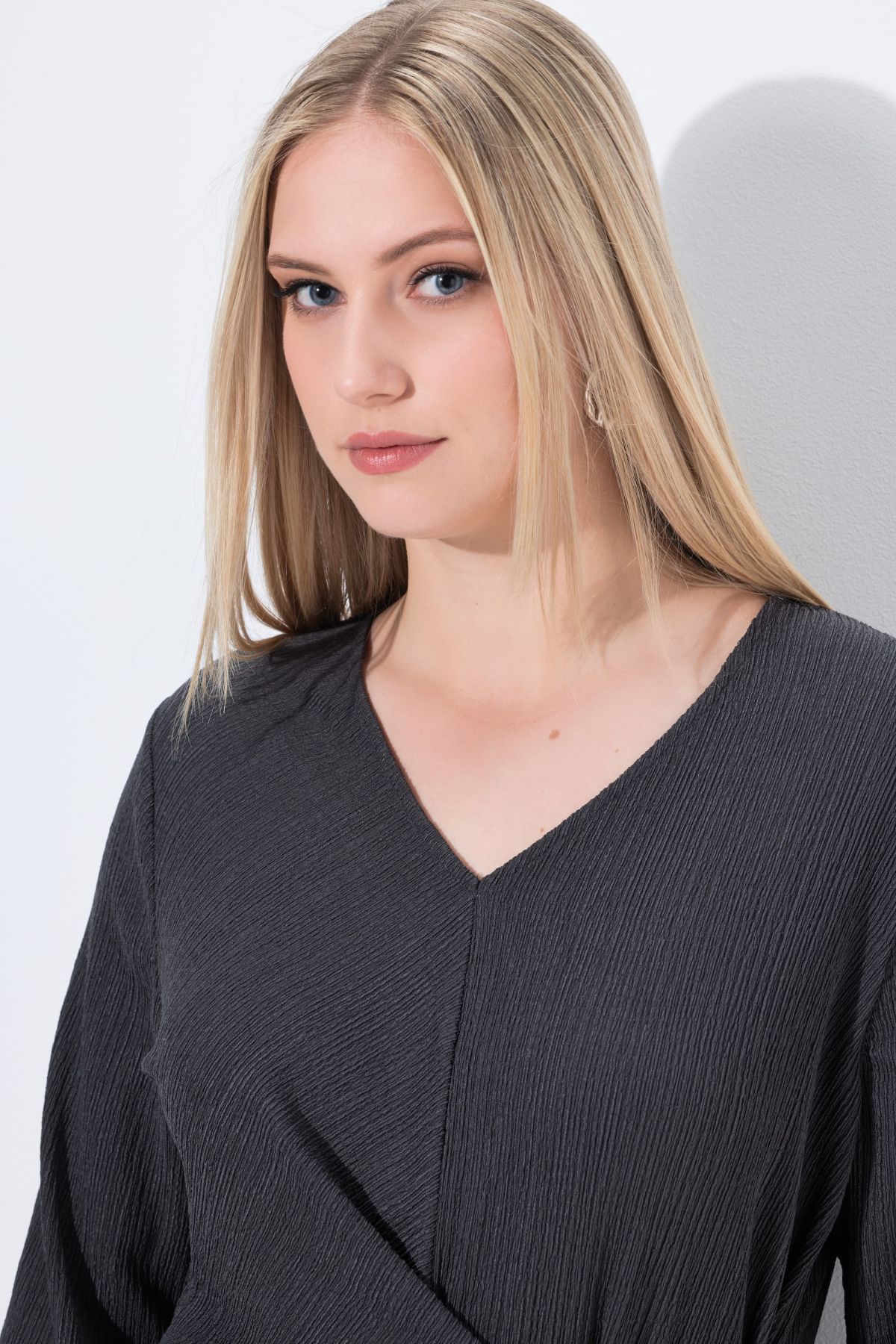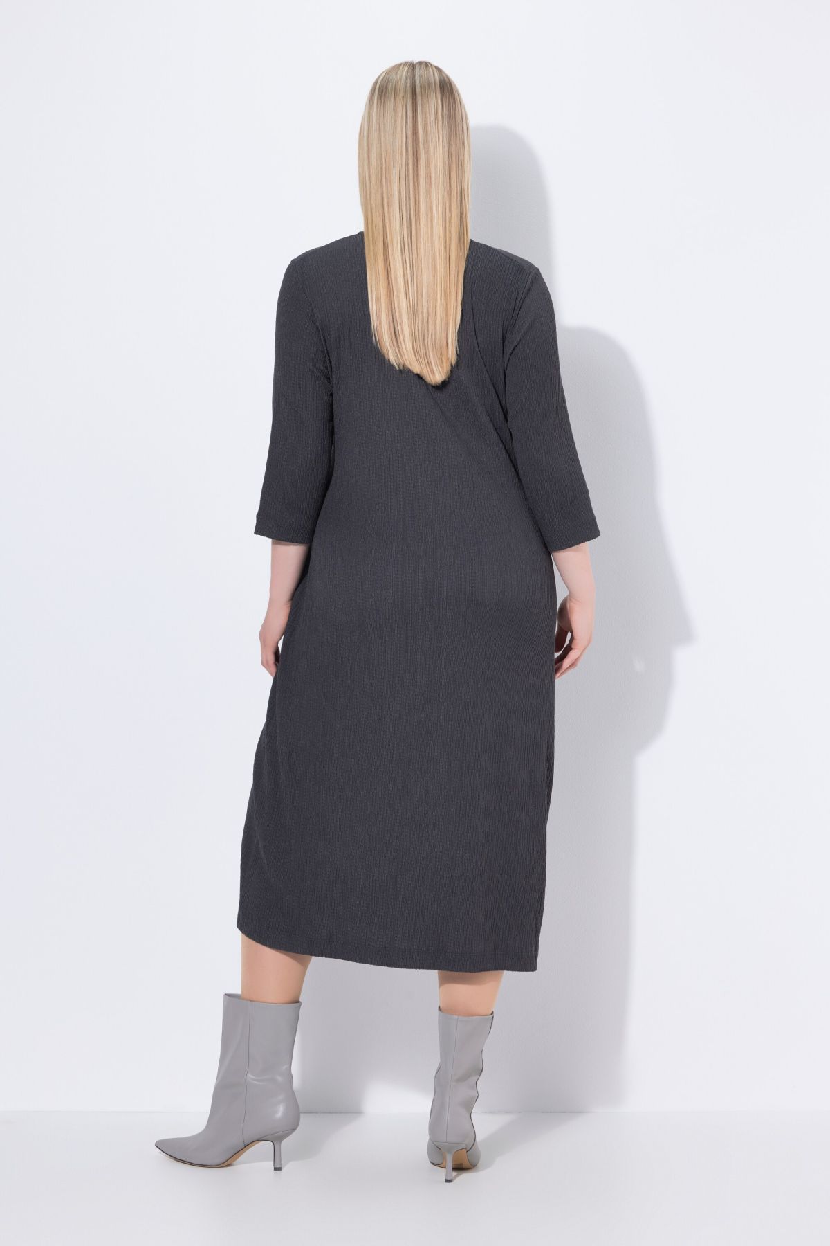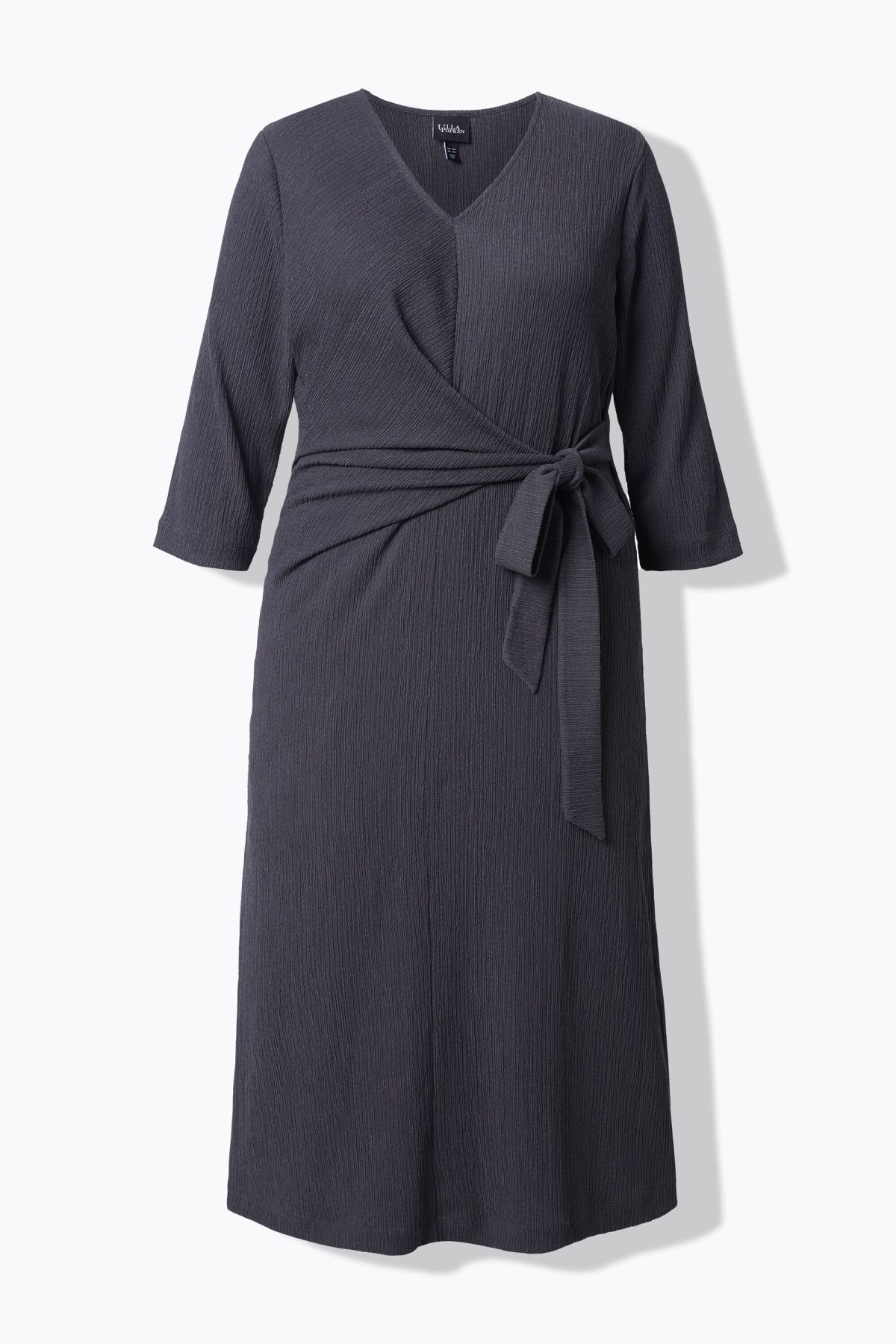 Рокля с визия тип прегърни ме. С V - образно деколте, връзка на талията, 3/4 ръкави и перфектна дължина под коляното. Стил и комфорт за всеки повод.