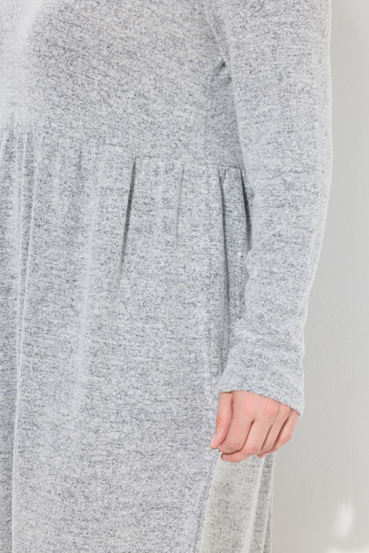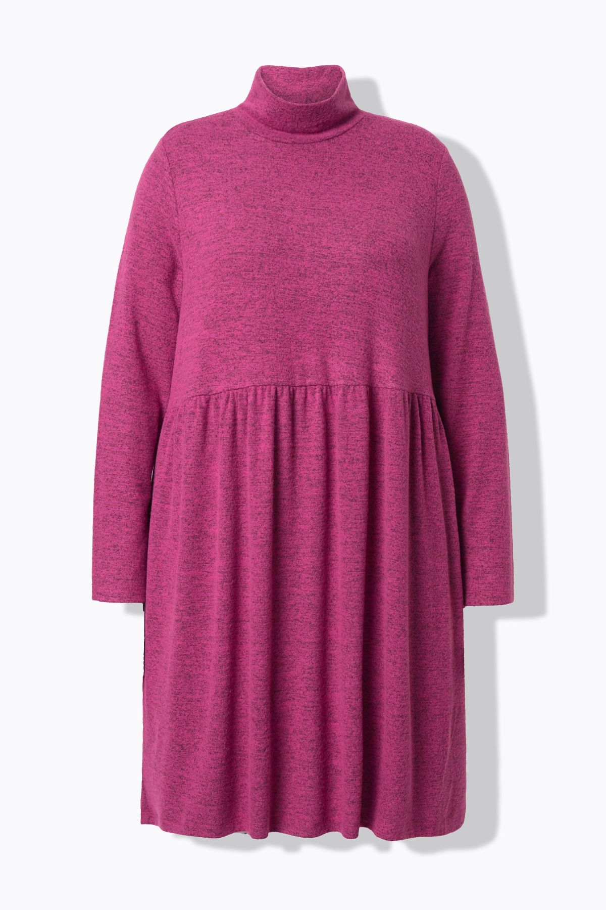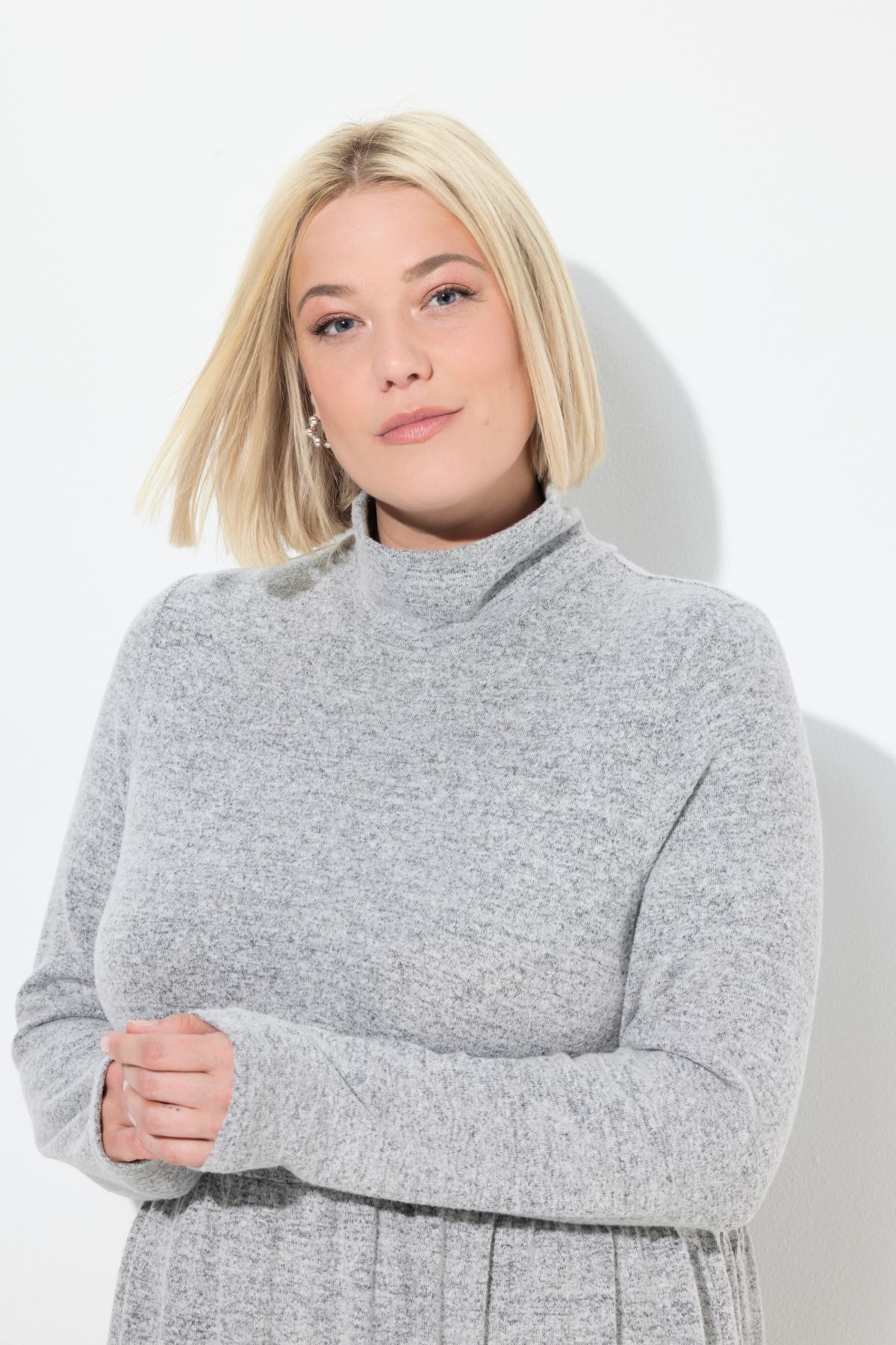 Плетена рокля с висока, изправена яка. С шевов акцент на талията и разкроена пола. С дълги ръкави и фина материя.