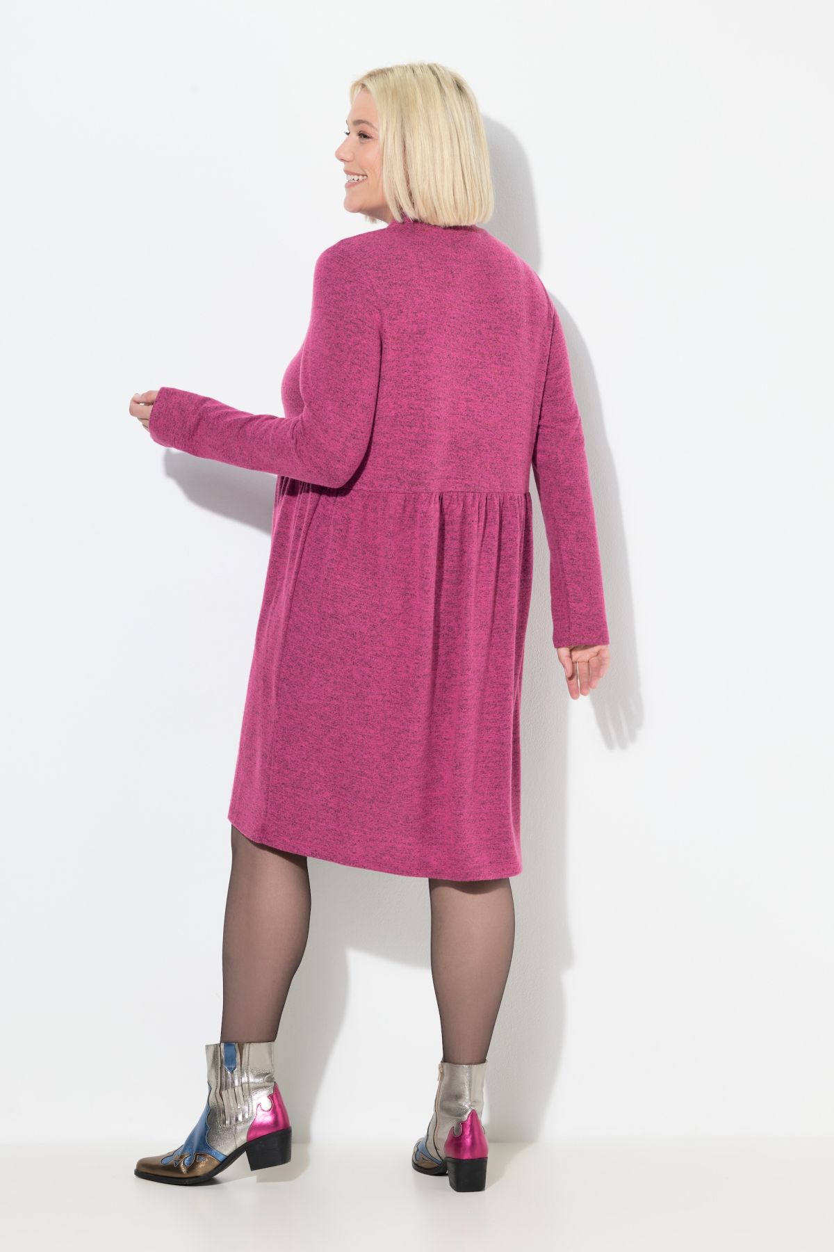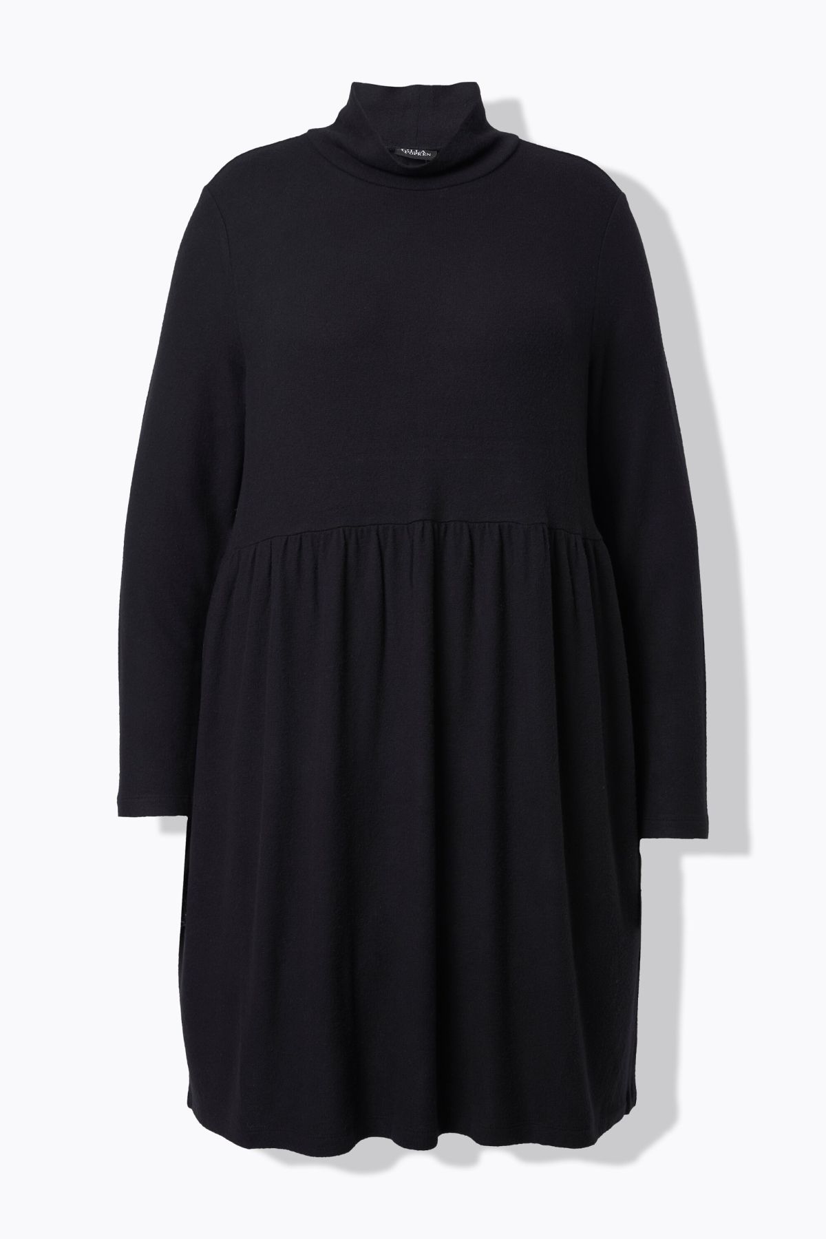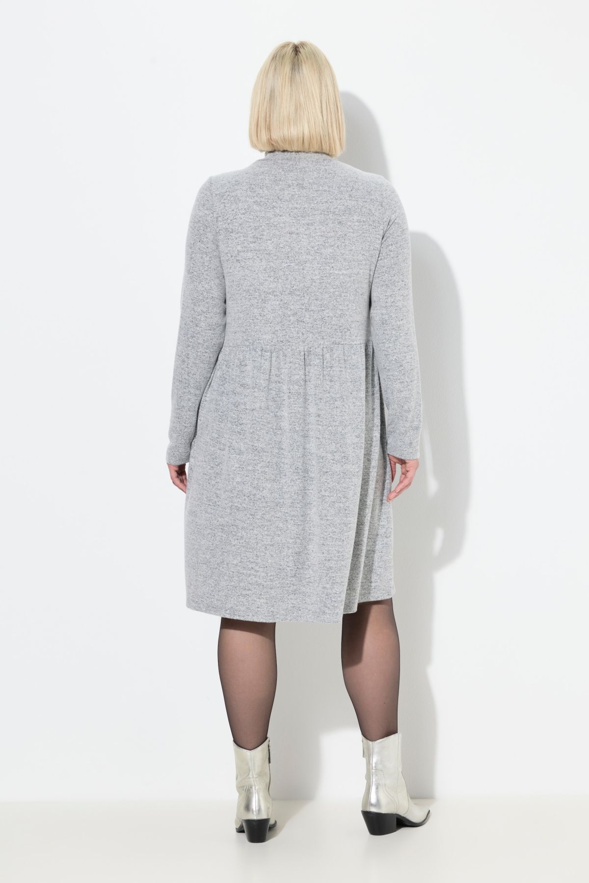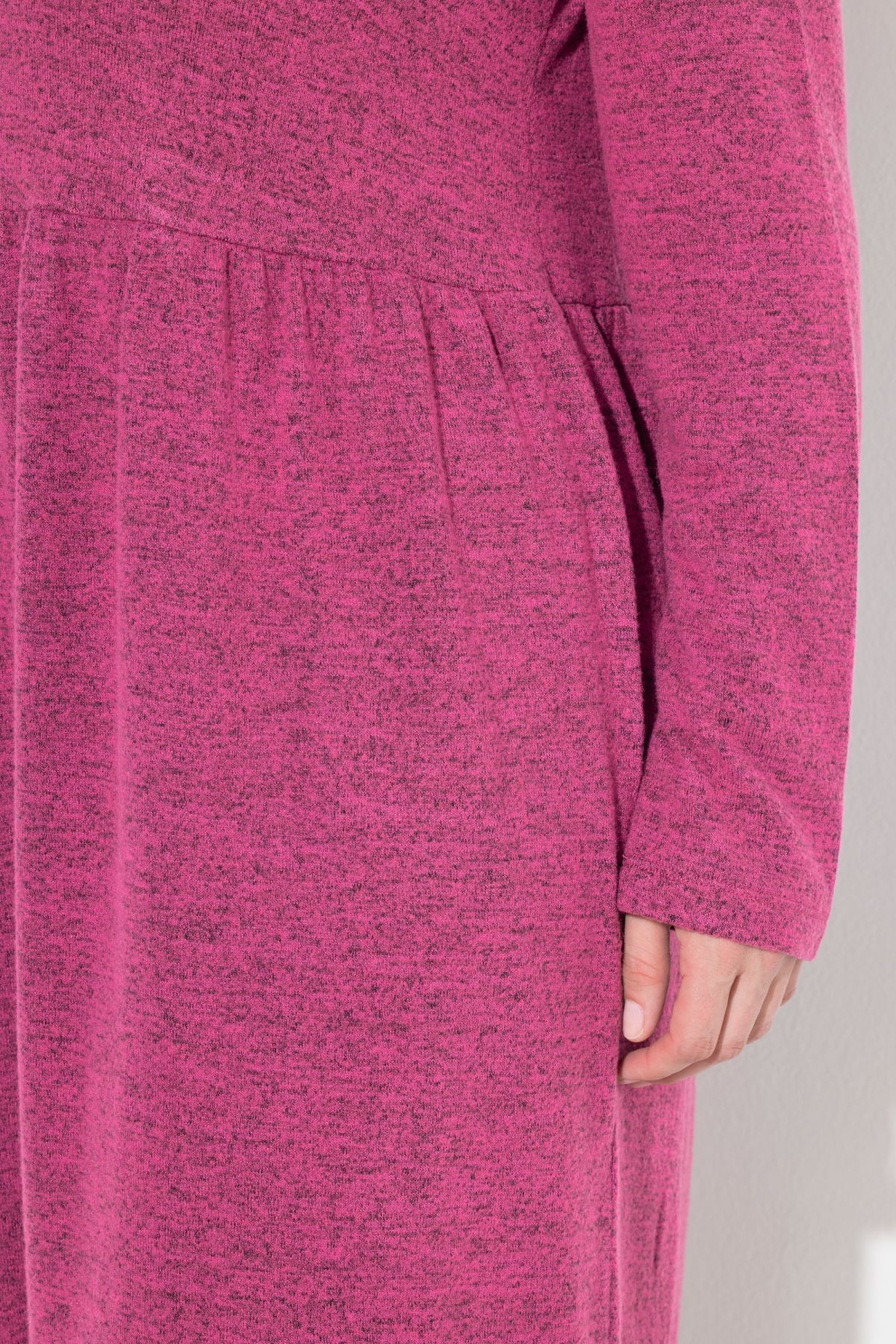 Плетена рокля с висока, изправена яка. С шевов акцент на талията и разкроена пола. С дълги ръкави и фина материя.