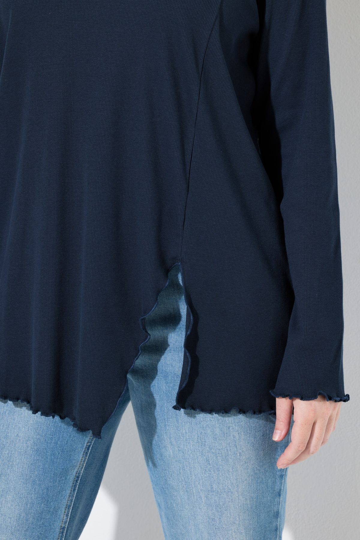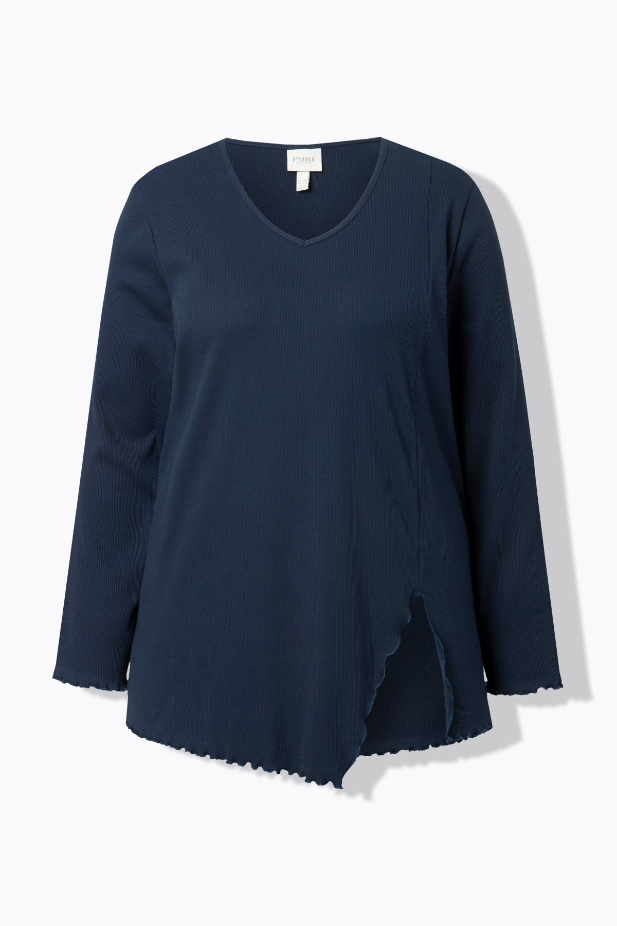Блуза с асиметрична цепка отпред на подгъва с къдрави акценти. С дълбоко кръгло деколте и дълги ръкави. От мека, памучна материя.