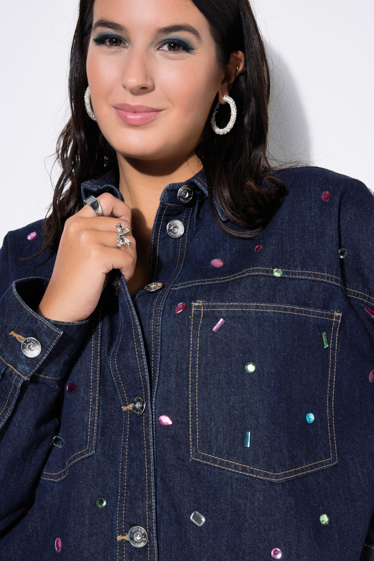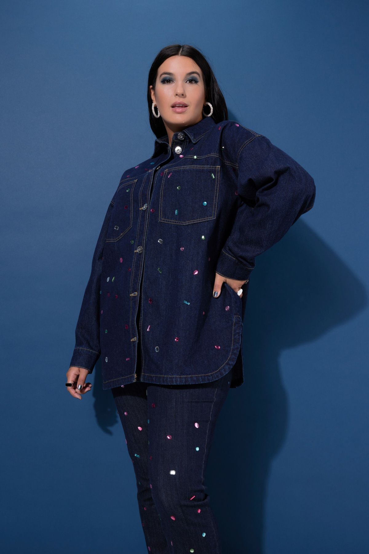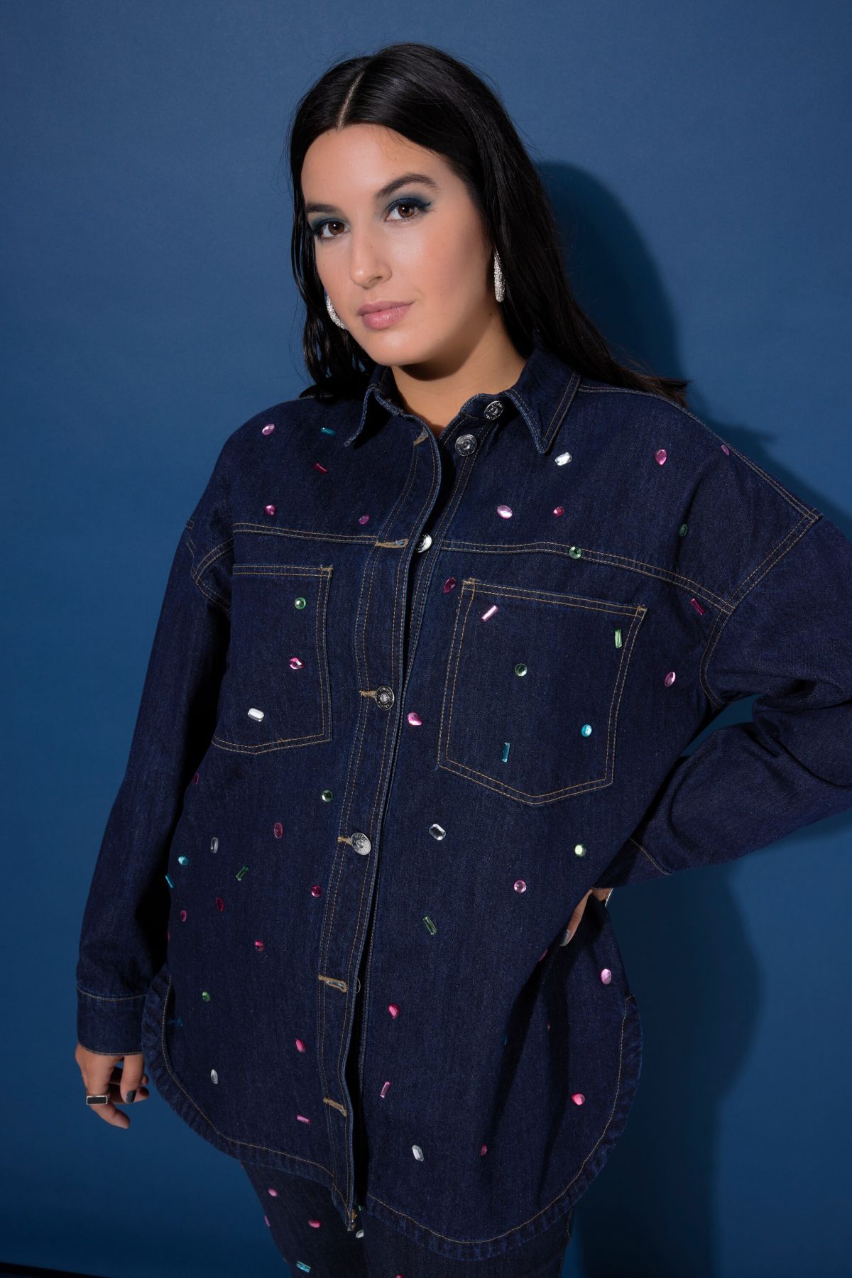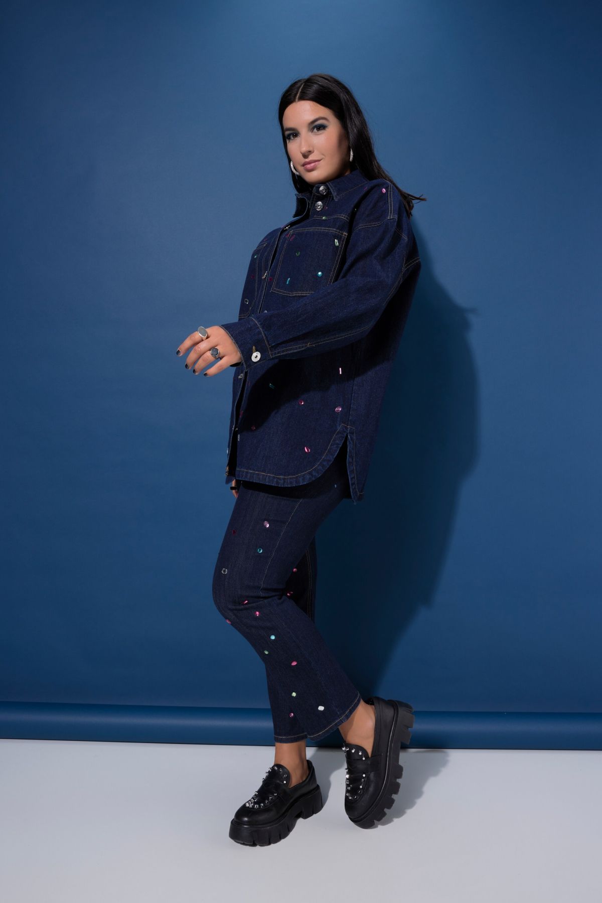 Дънкова риза с овърсайз кройка и акцент от бляскави камъчета. С класическа визия с яка, копчета отпред, джобове на гърдите и дълги ръкави с маншет с копче. От мека, памучна материя.