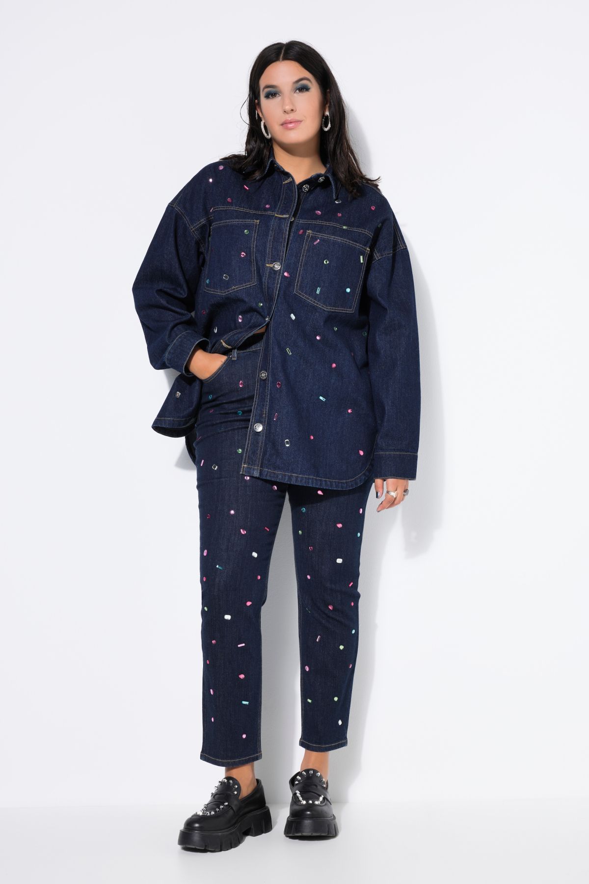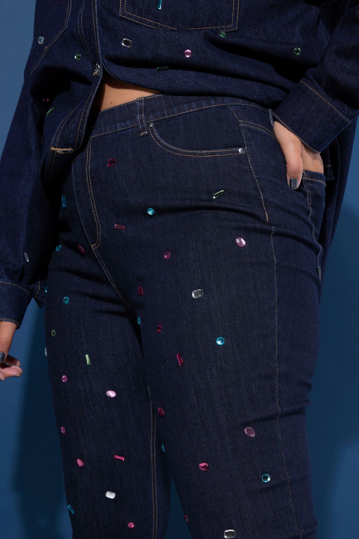 Дънки тип Mom с камъчета. Дизайн с фиксирана талия с гайки за колан, копче и цип отпред и 5 джоба. С широки крачоли и комфортна кройка.
