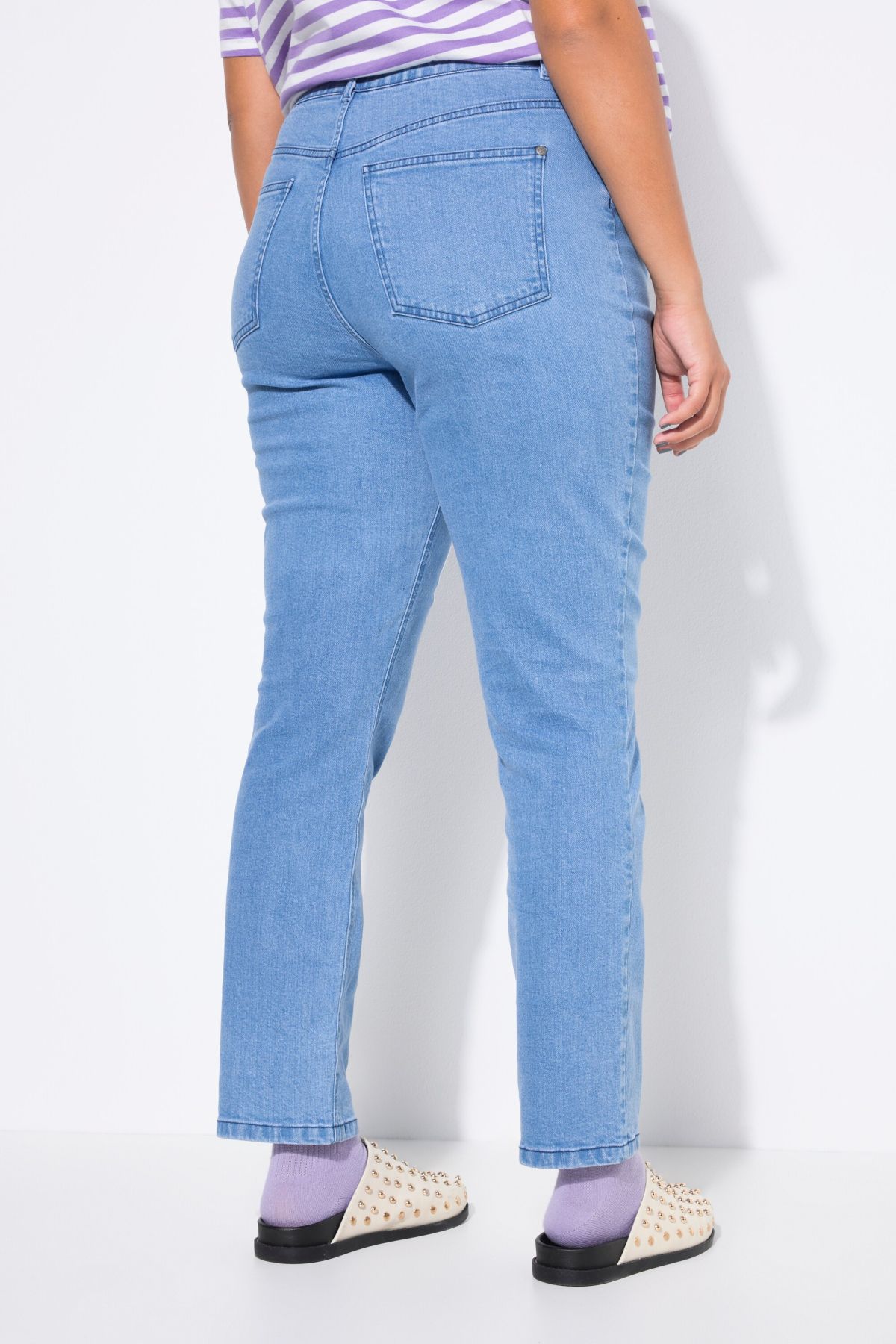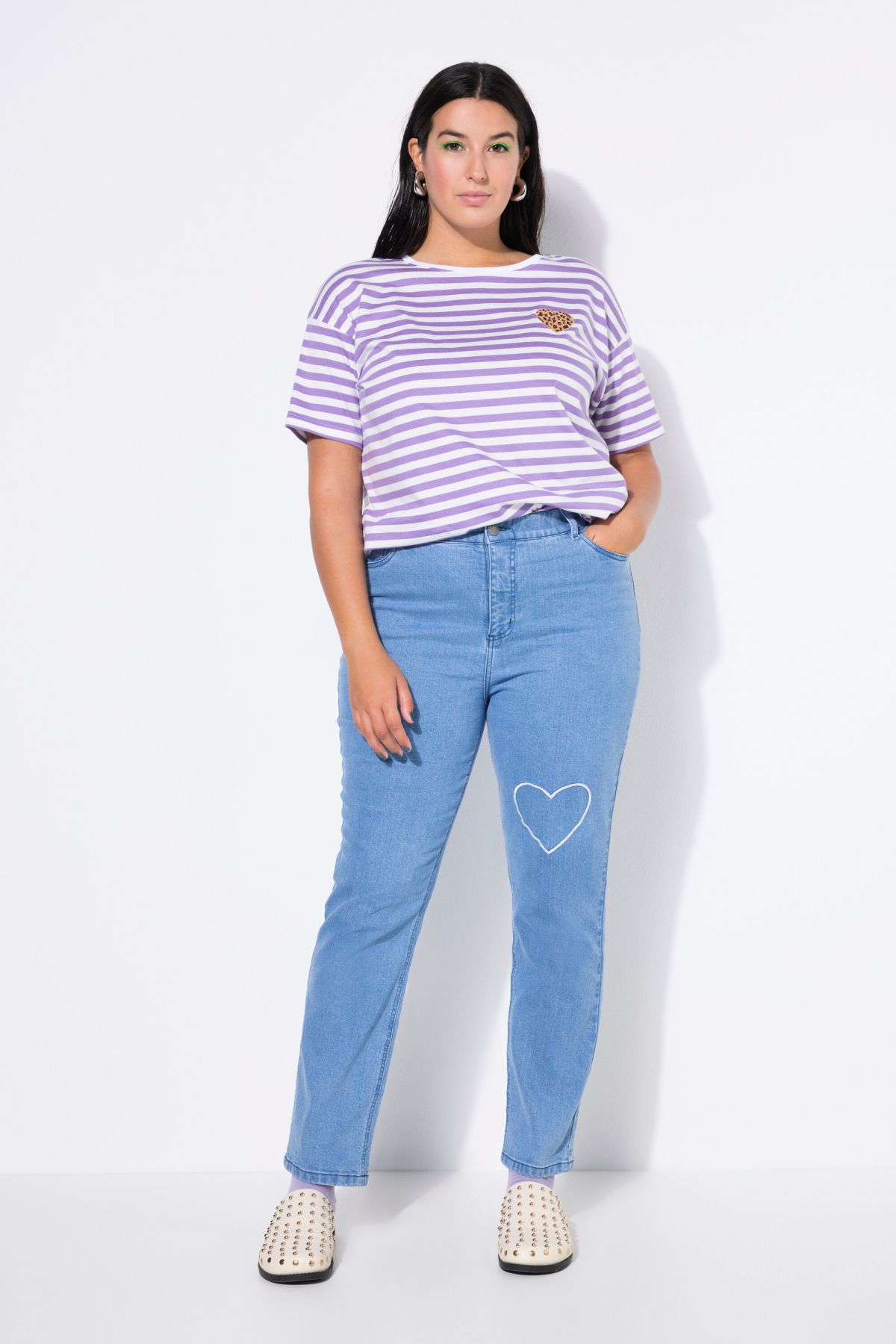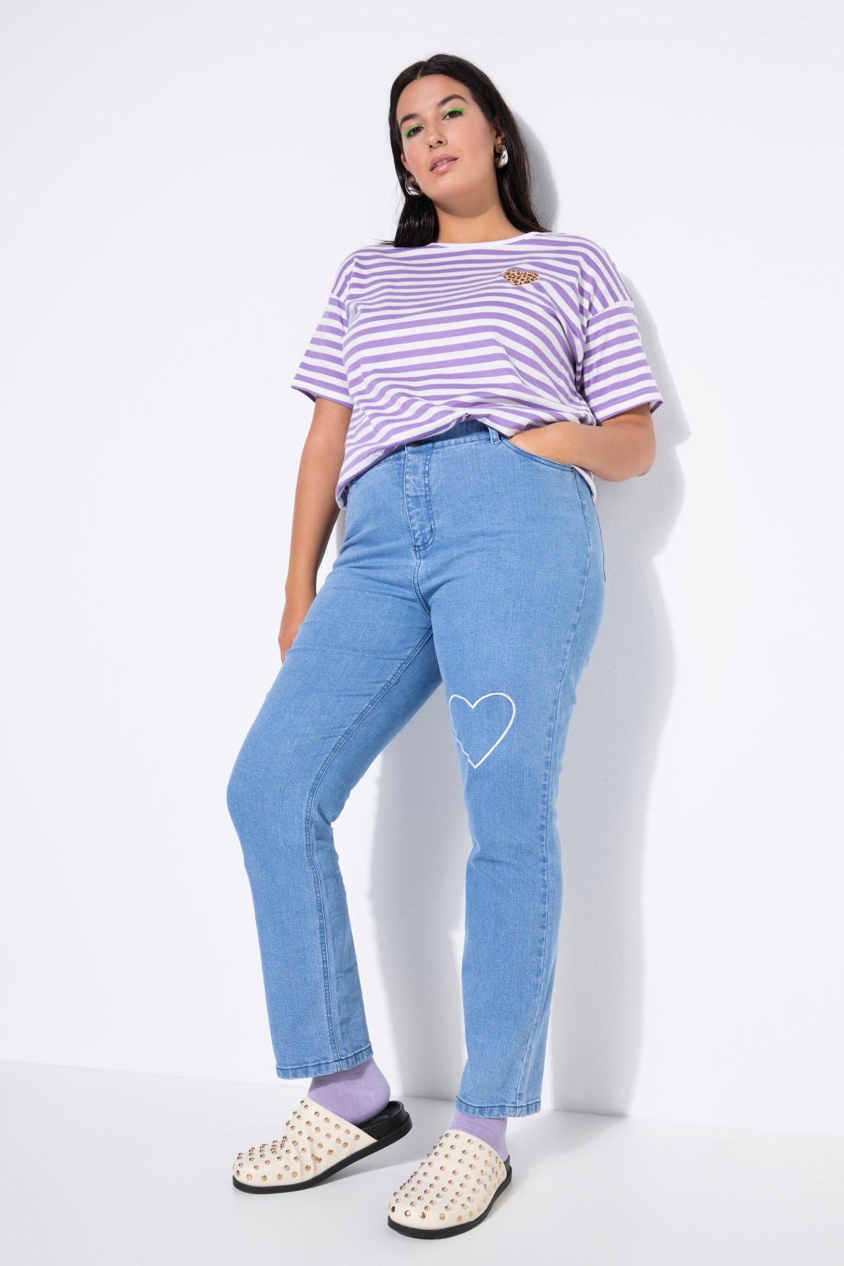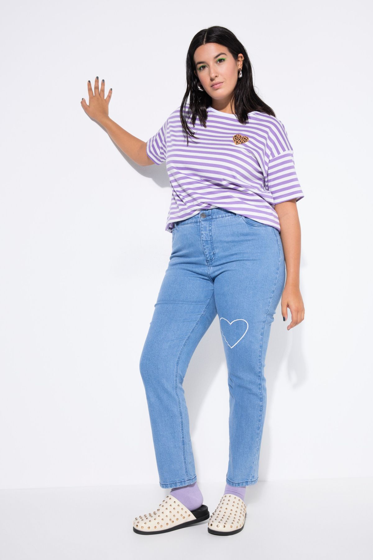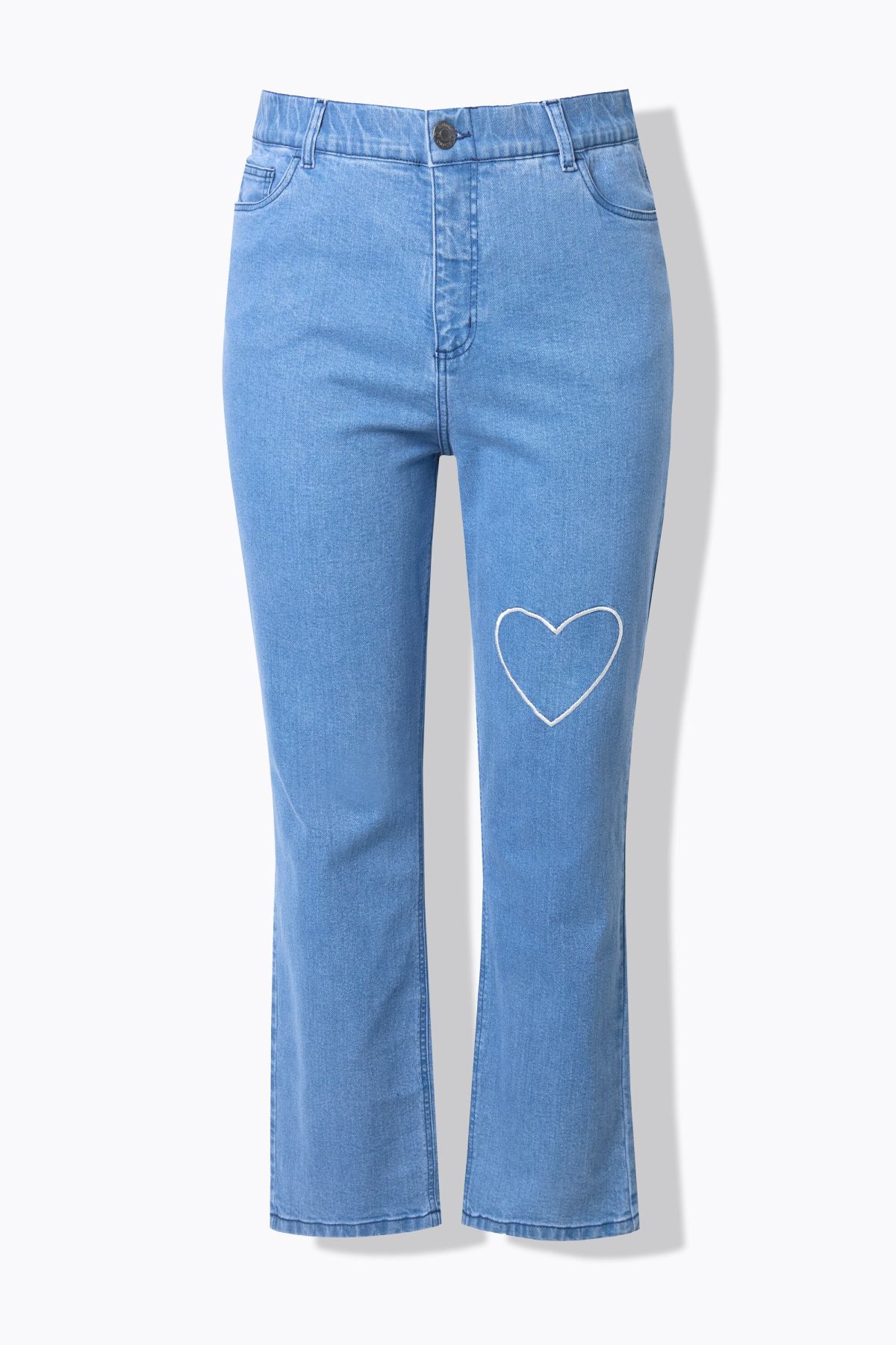 Дънки тип Mom с бродерия на сърце. Дизайн с фиксирана талия с гайки за колан, копче и цип отпред и 5 джоба. С широки крачоли и комфортна кройка.