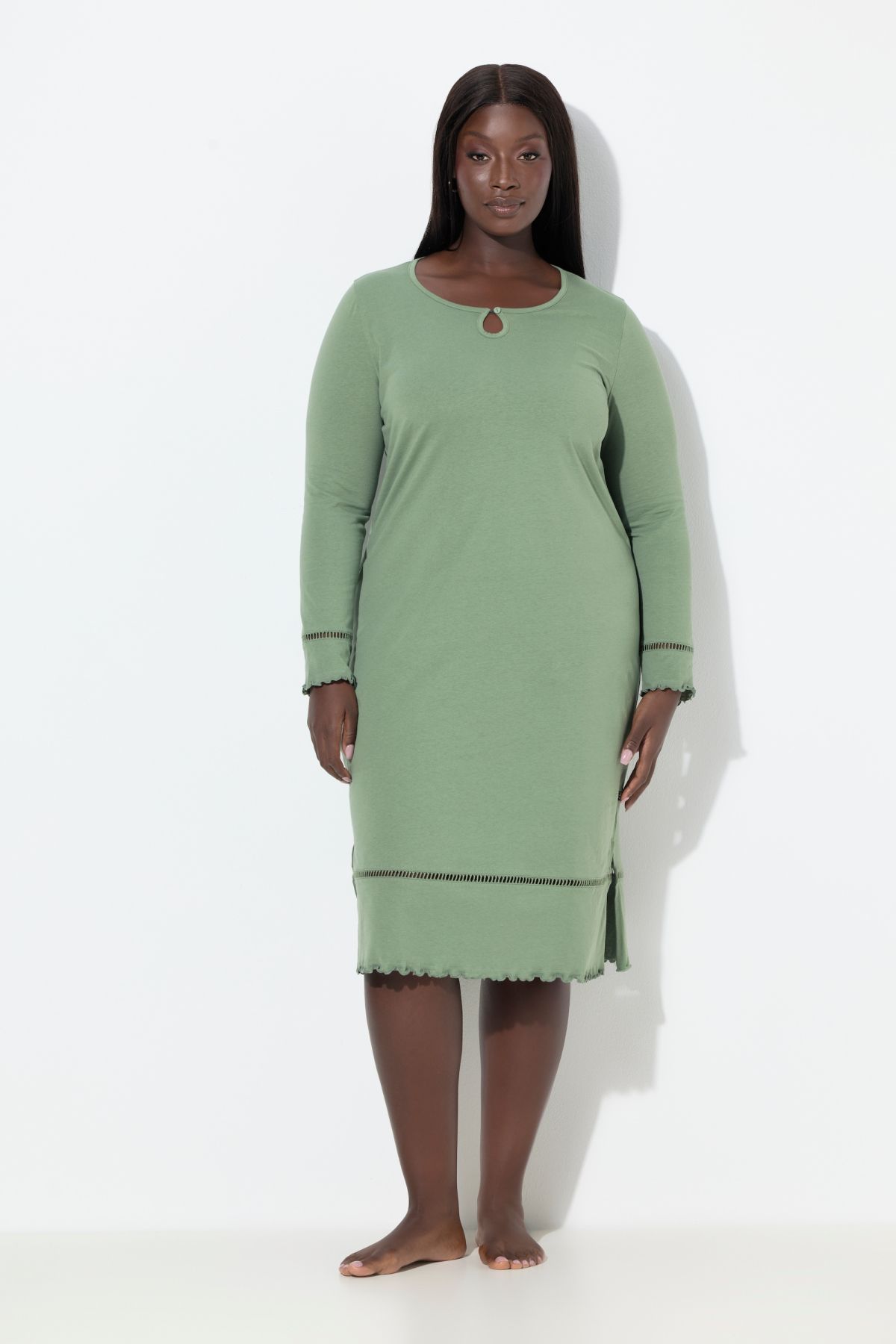 Нощница с дантела на подгъва. С дълги ръкави и подгъв с разкроения. С кръгло деколте, малка цепка с копче и странични цепки.