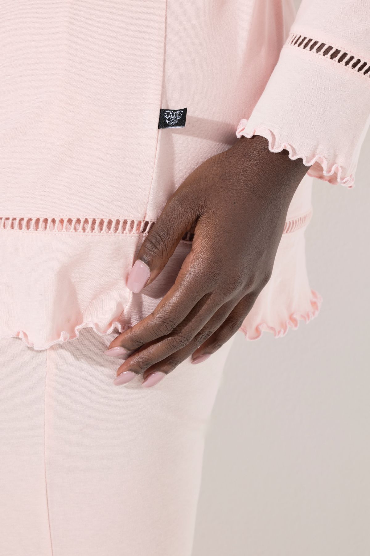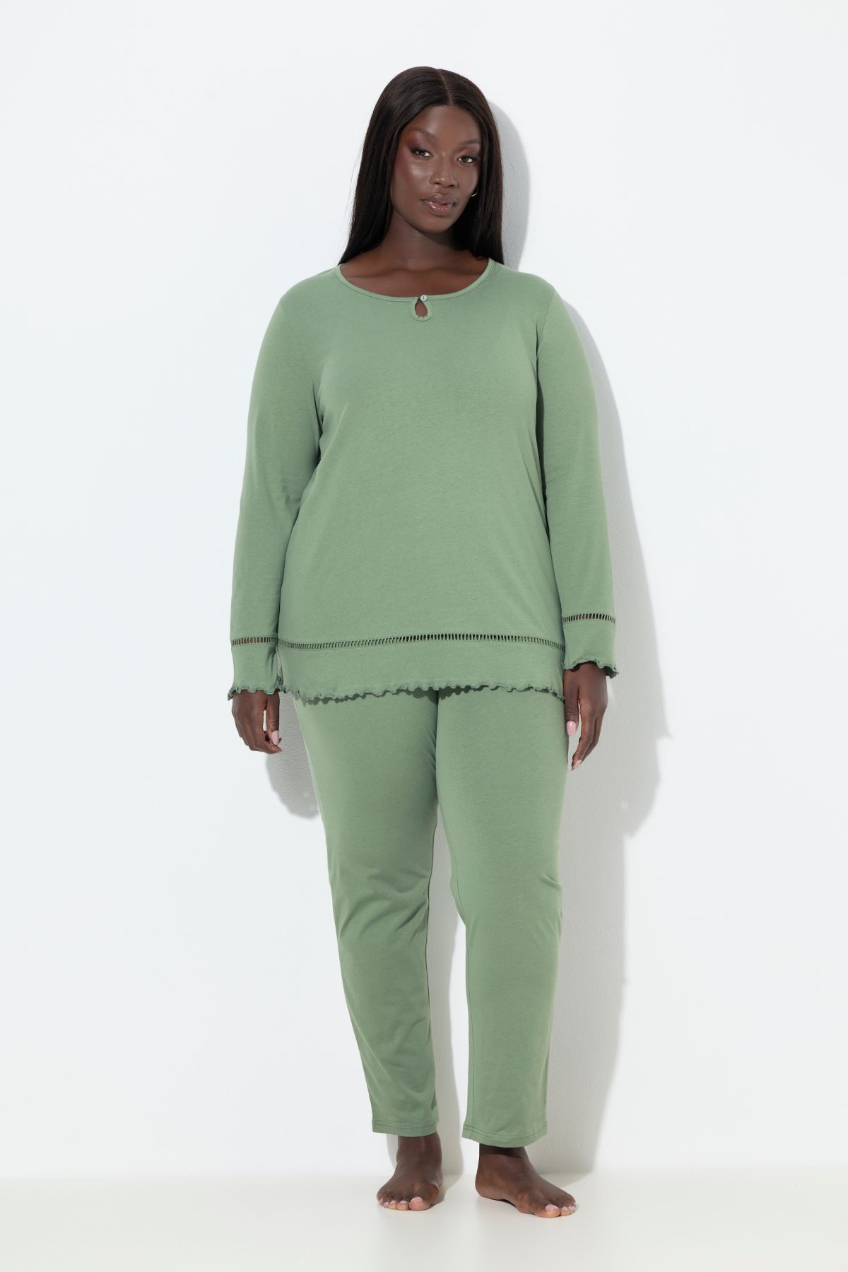 Пижама с дантелени акценти - перфектен комфорт и качество. С горнище с кръгло деколте, малка цепка с копче и дълги ръкави и подгъв с дантелен акцент. С долнище с еластична талия и прави крачоли.