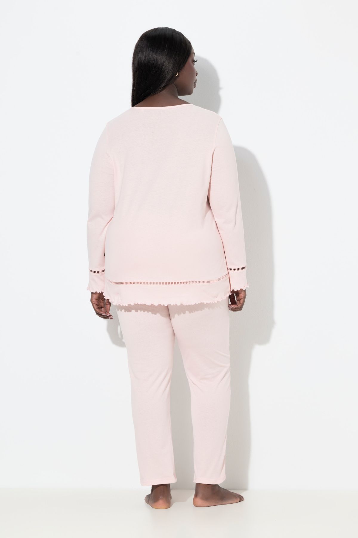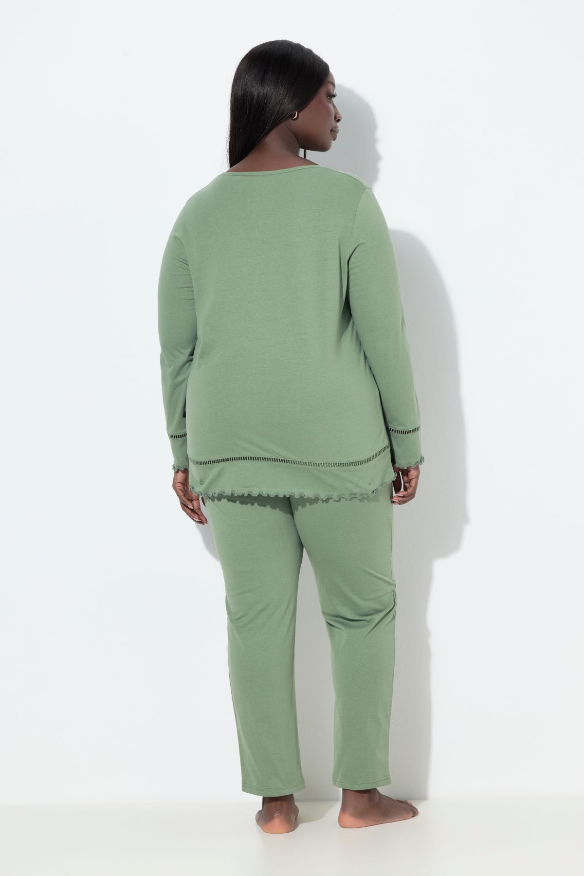 Подгъв и ръкави с подгъв, обло деколте с малък изрез, модни изрязани ръбове, дълги, прави панталони с ластичен колан, чист памук, дължина, коригирана според размера, приблизително 72-76 см.