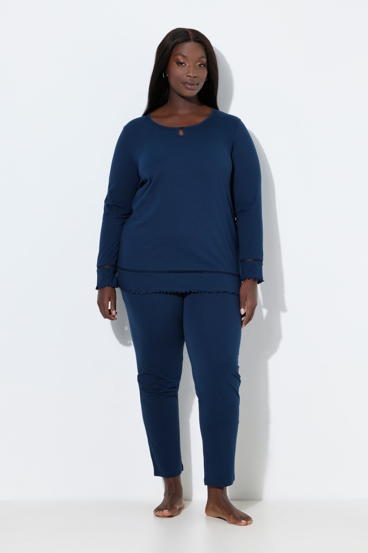 Пижама с дантелени акценти - перфектен комфорт и качество. С горнище с кръгло деколте, малка цепка с копче и дълги ръкави и подгъв с дантелен акцент. С долнище с еластична талия и прави крачоли.