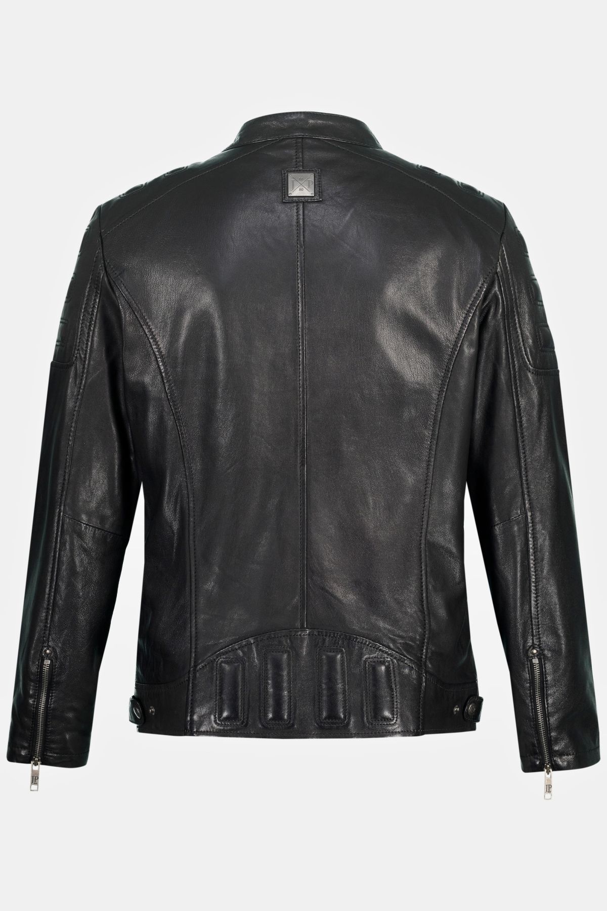 Яке от естествена кожа в мото стил с шевове на раменете и метален цип. С 2 джоба отстрани.