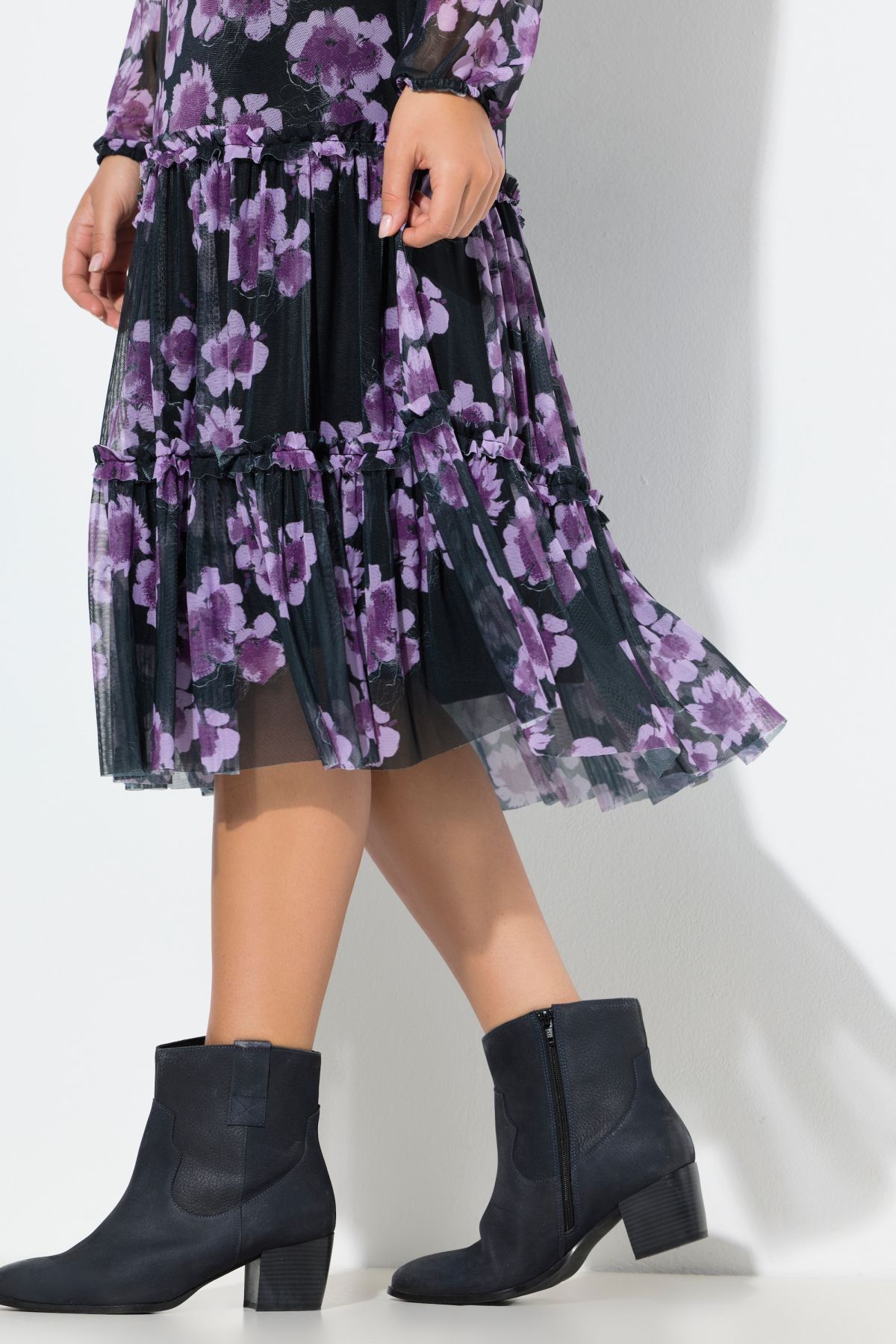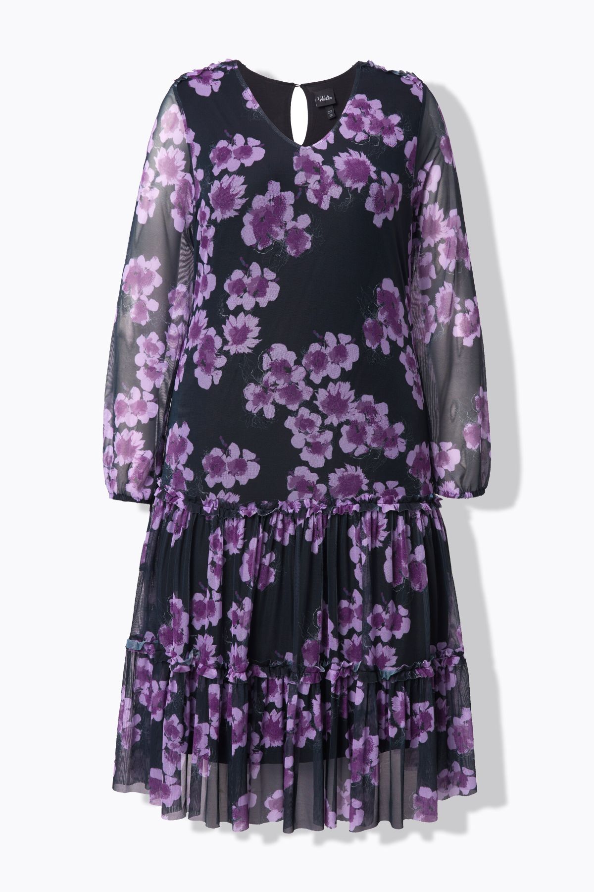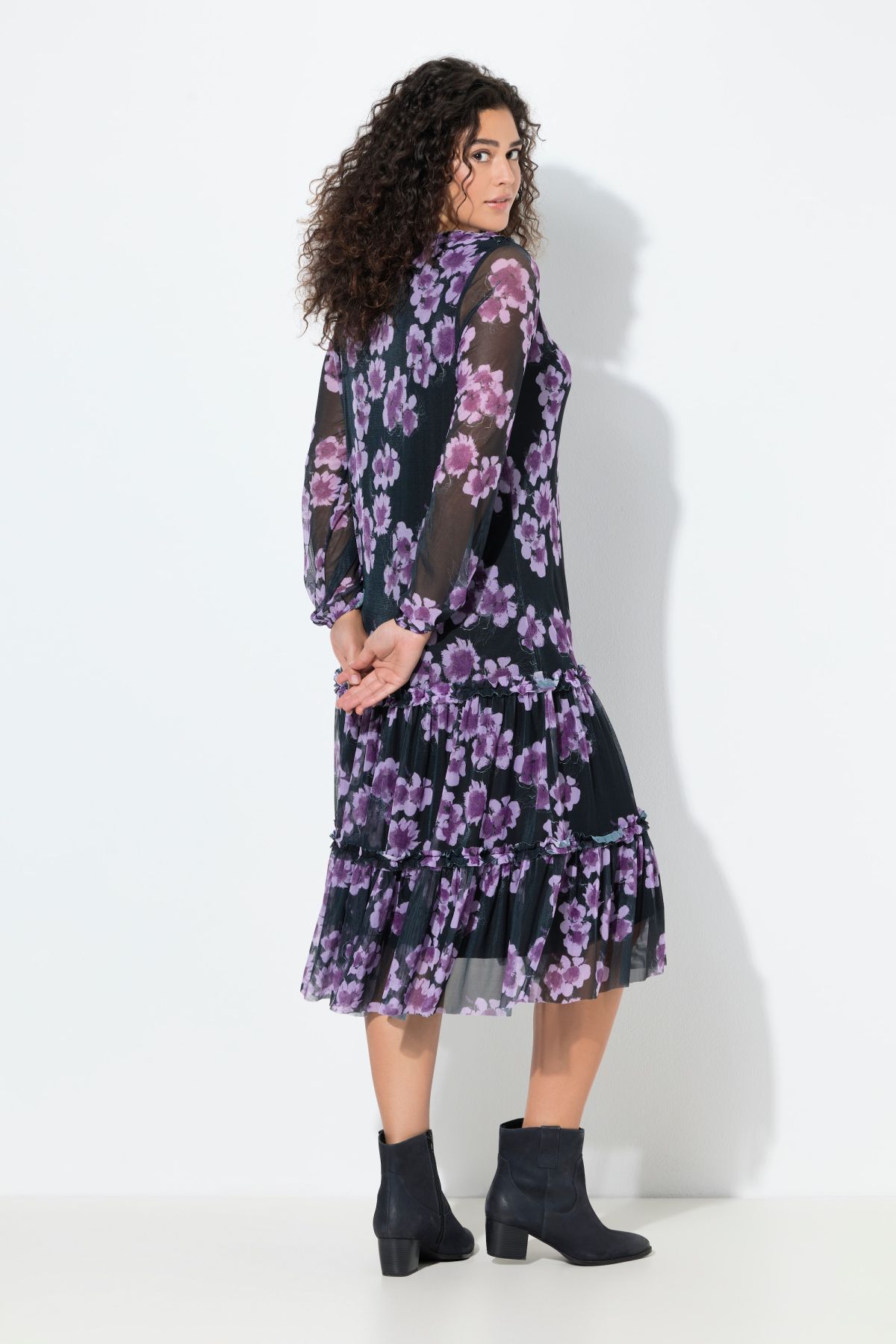 Рокля с флорален принт с А - линия на силуета и шев на талията. С 3/4 ръкави и кръгло деколте