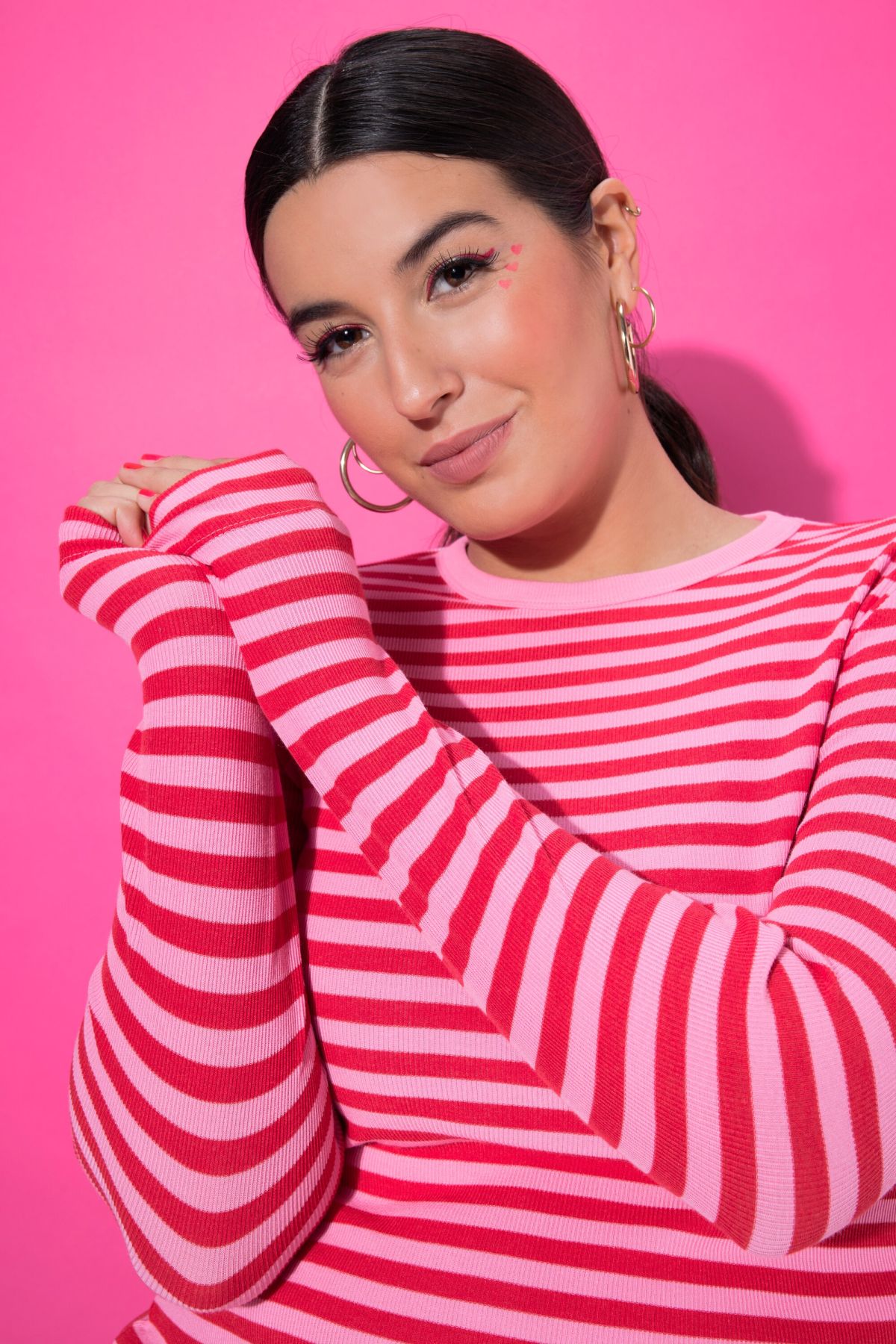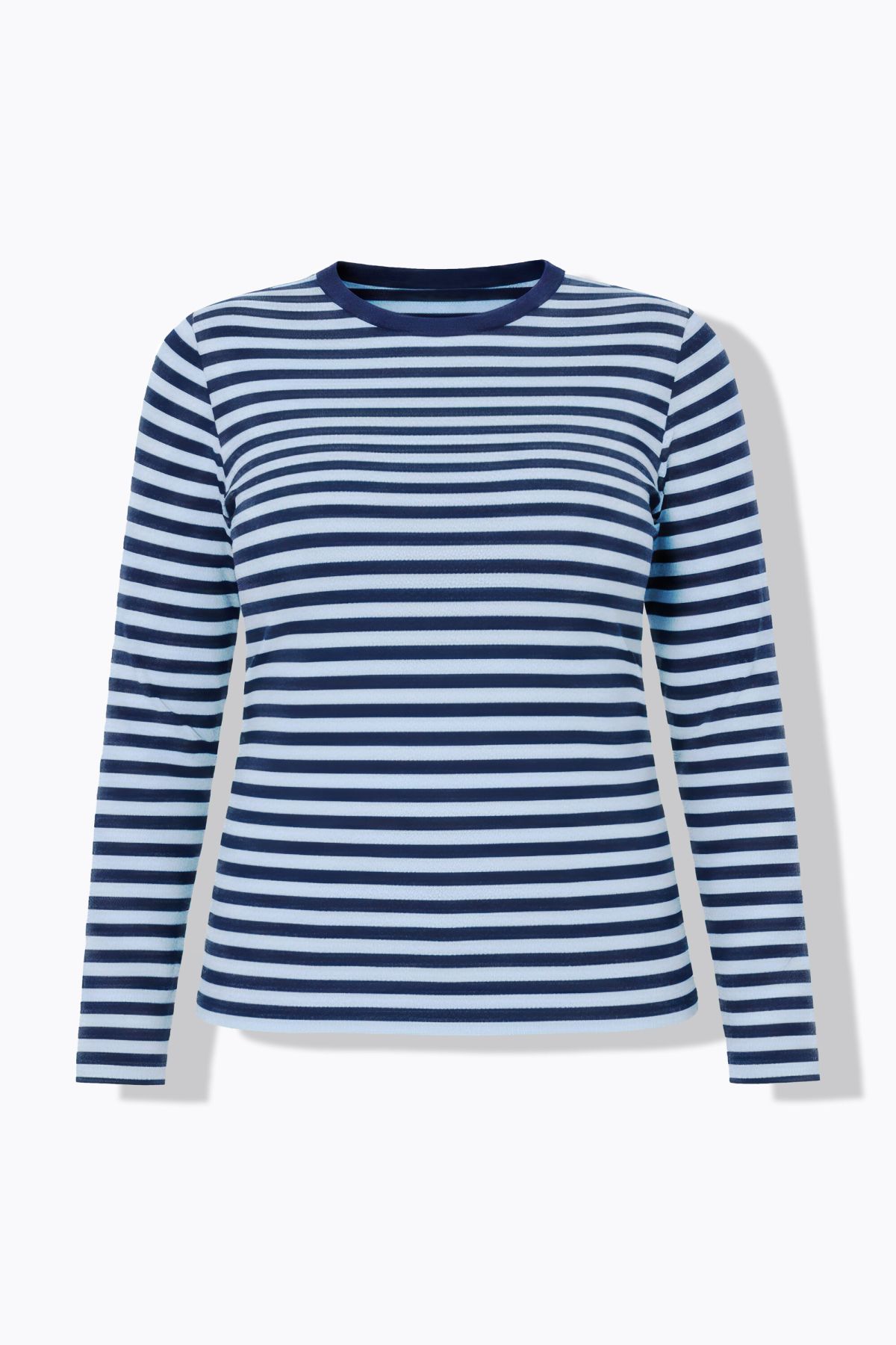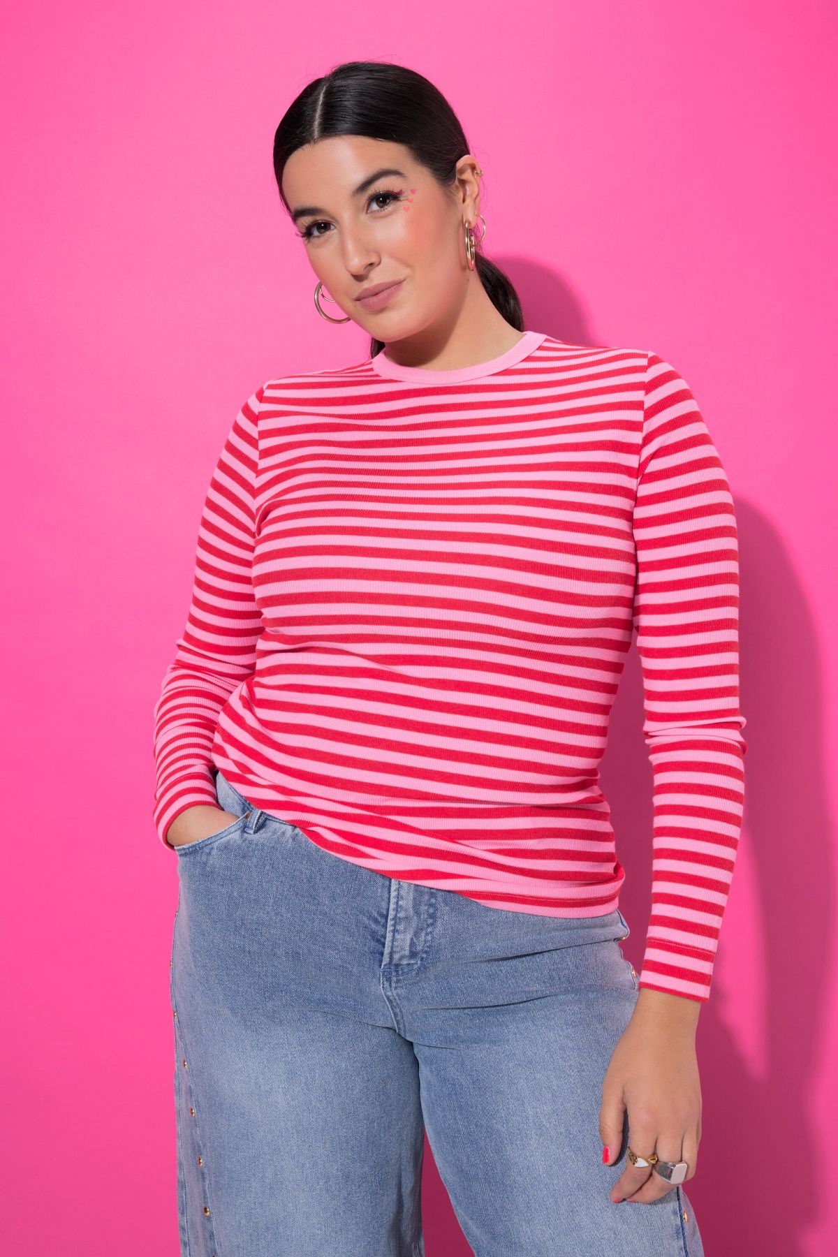 Тениска с райета и кръгло, контрастно деколте. От еластична материя с тесен силует. С дълги ръкави.