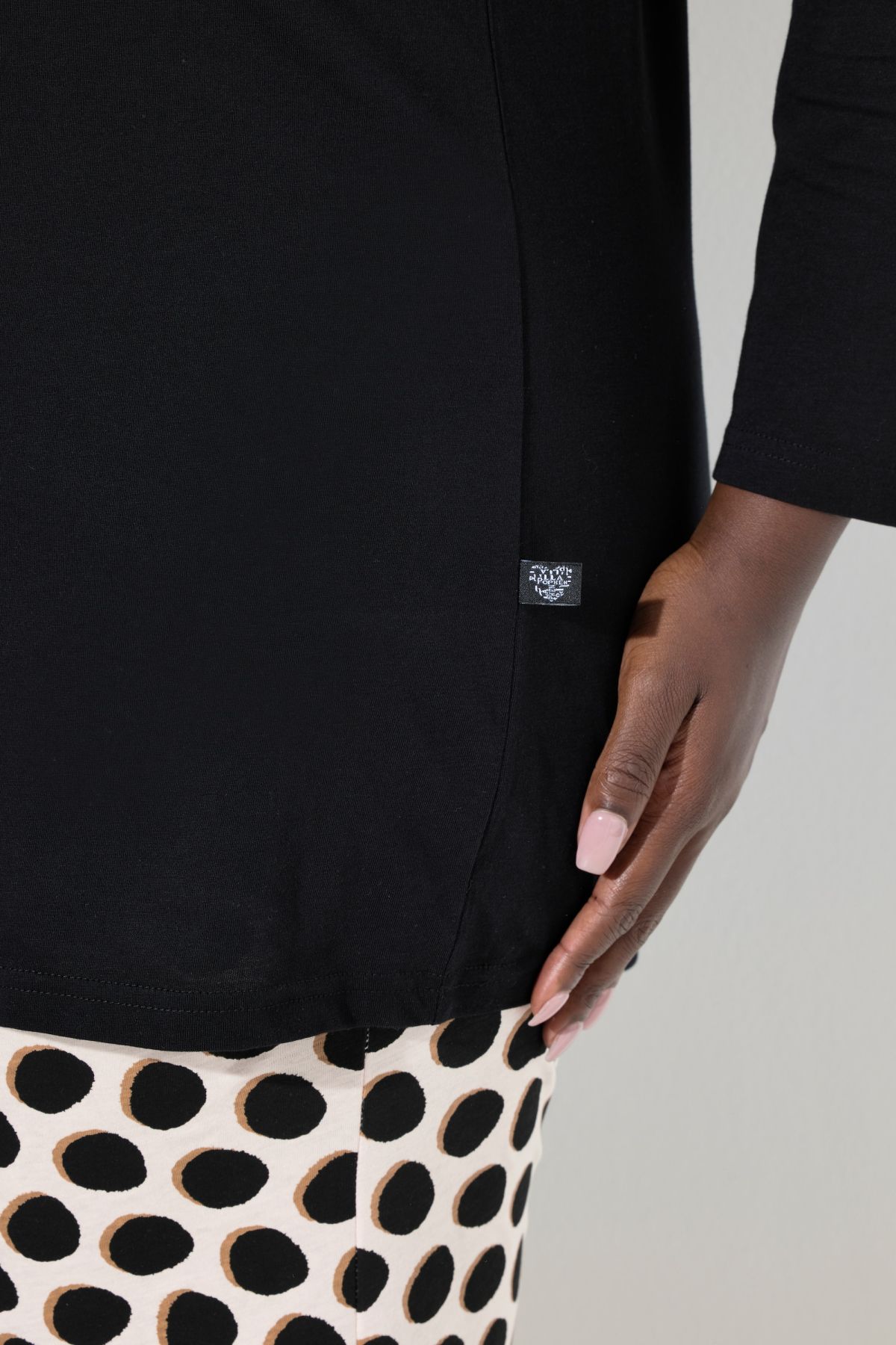 Пижама с принт на точки. С едноцветно долнище с акцент на кръглото деколте и дълги ръкави. С долнище с еластична талия и странични шевови джобове.
