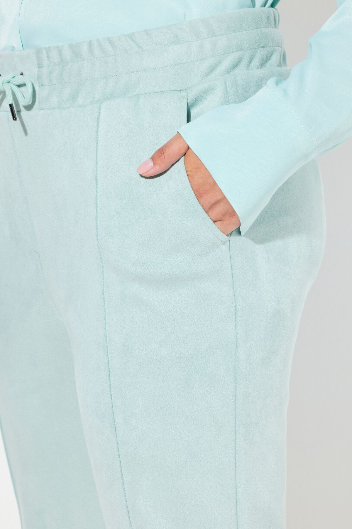Панталон с велурена визия с прави крачоли и шевов акцент отпред. С еластична талия с връзки. Стилен и комфортен както за повод, така и за ежедневието.