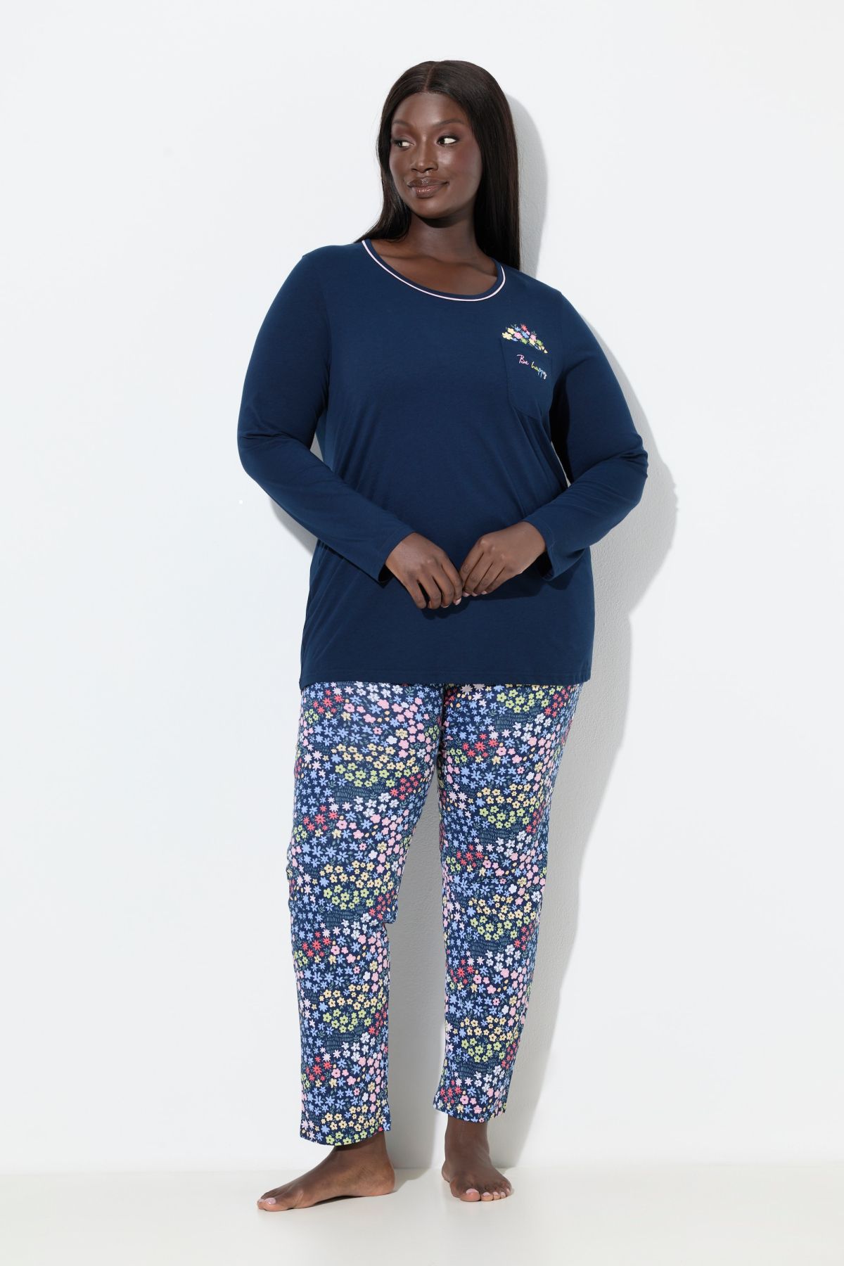 Пижама от 2 части с едноцветно горнище с кръгло деколте, дълги ръкави и акцент на цветя. С долнище с прави крачоли, флорален принт и еластична талия. От мека, памучна материя.