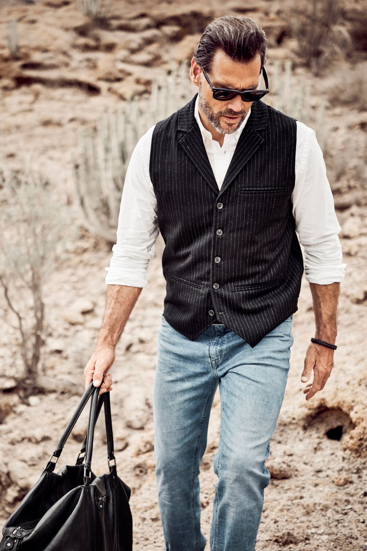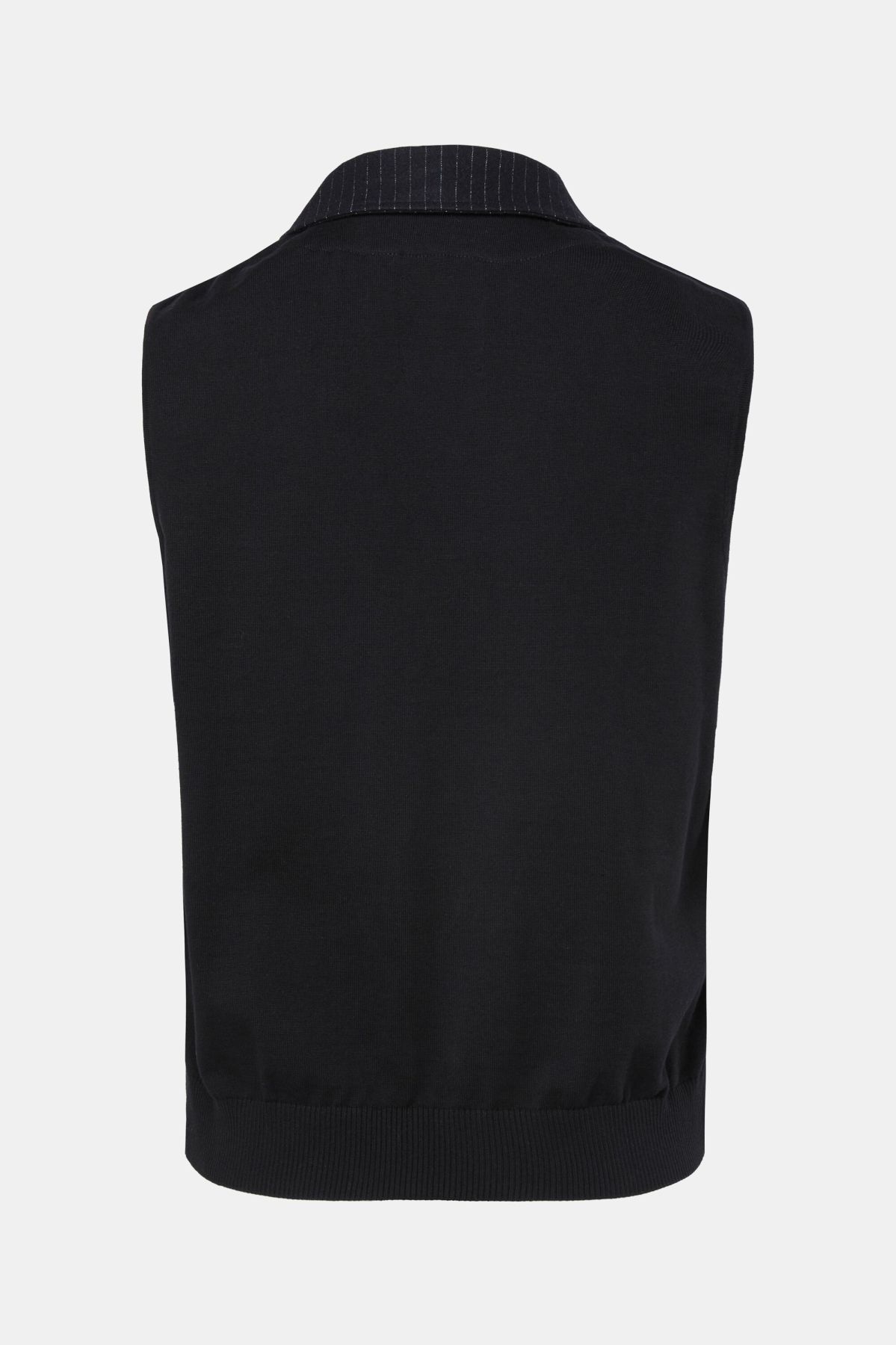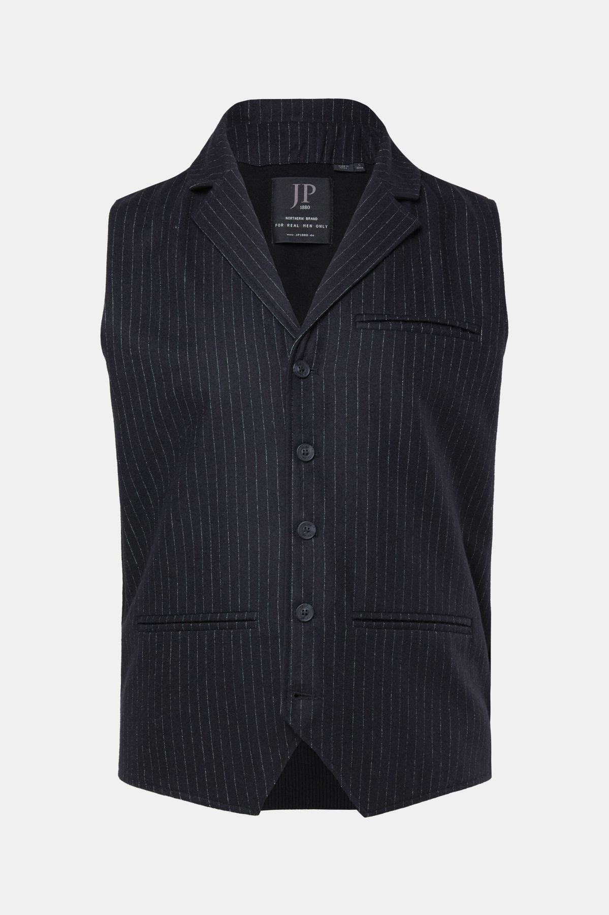 Раиран елегантен елек от мека, еластична материя. С V - образно деколте, копчета и джоб на гърдите.