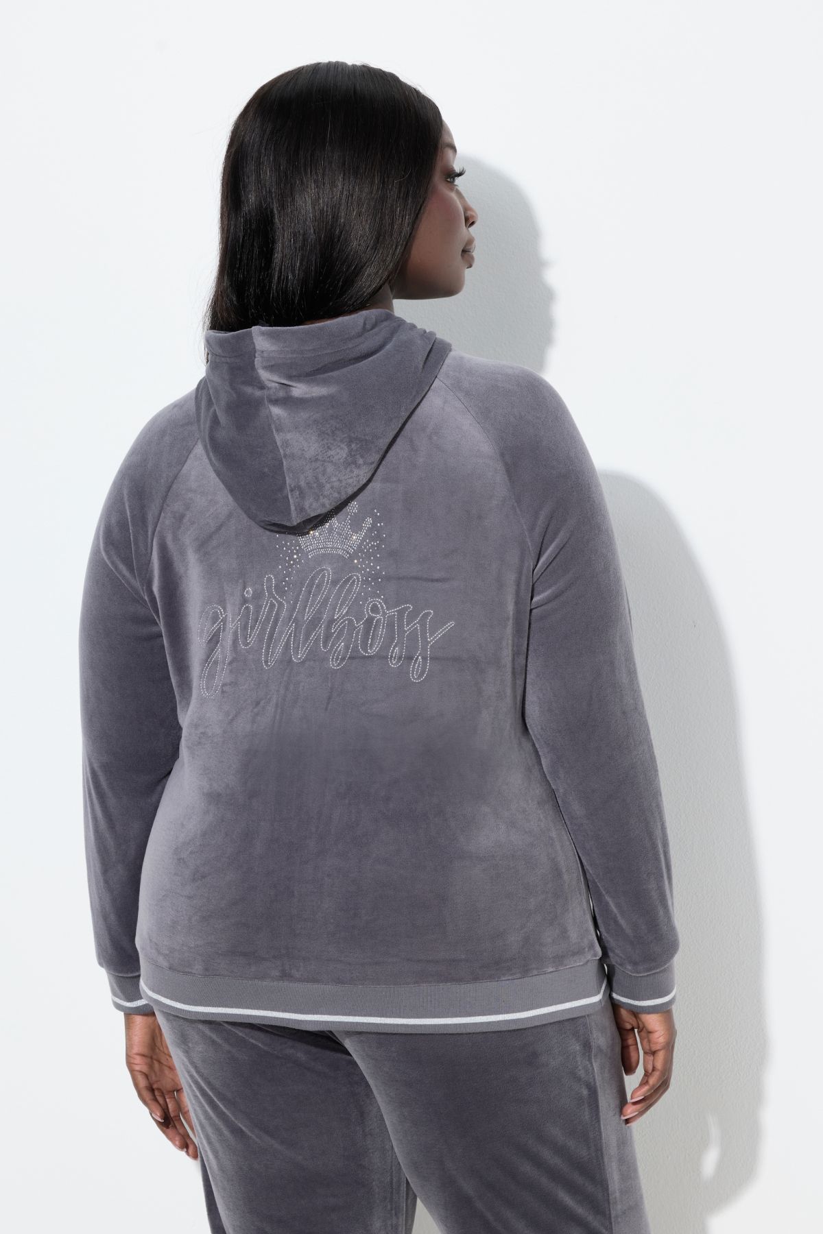 Супер удобна и приятно мека, изработена от велур, бродерия Girlboss с декоративни камъчета на гърба, маншети с блестящи райета, джоб тип кенгуру, ръкави и подгъв с оребрени маншети, дължина, регулирана по размер, приблизително 64-72 см.