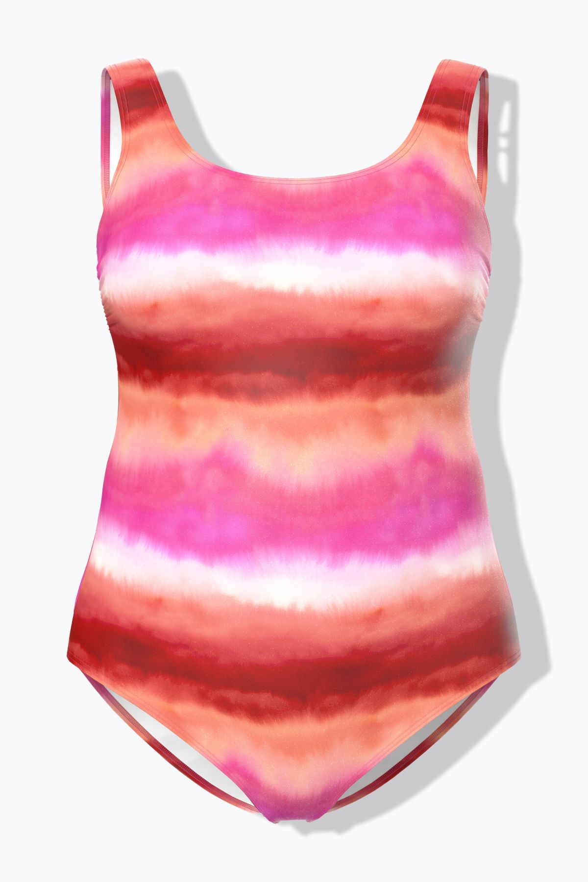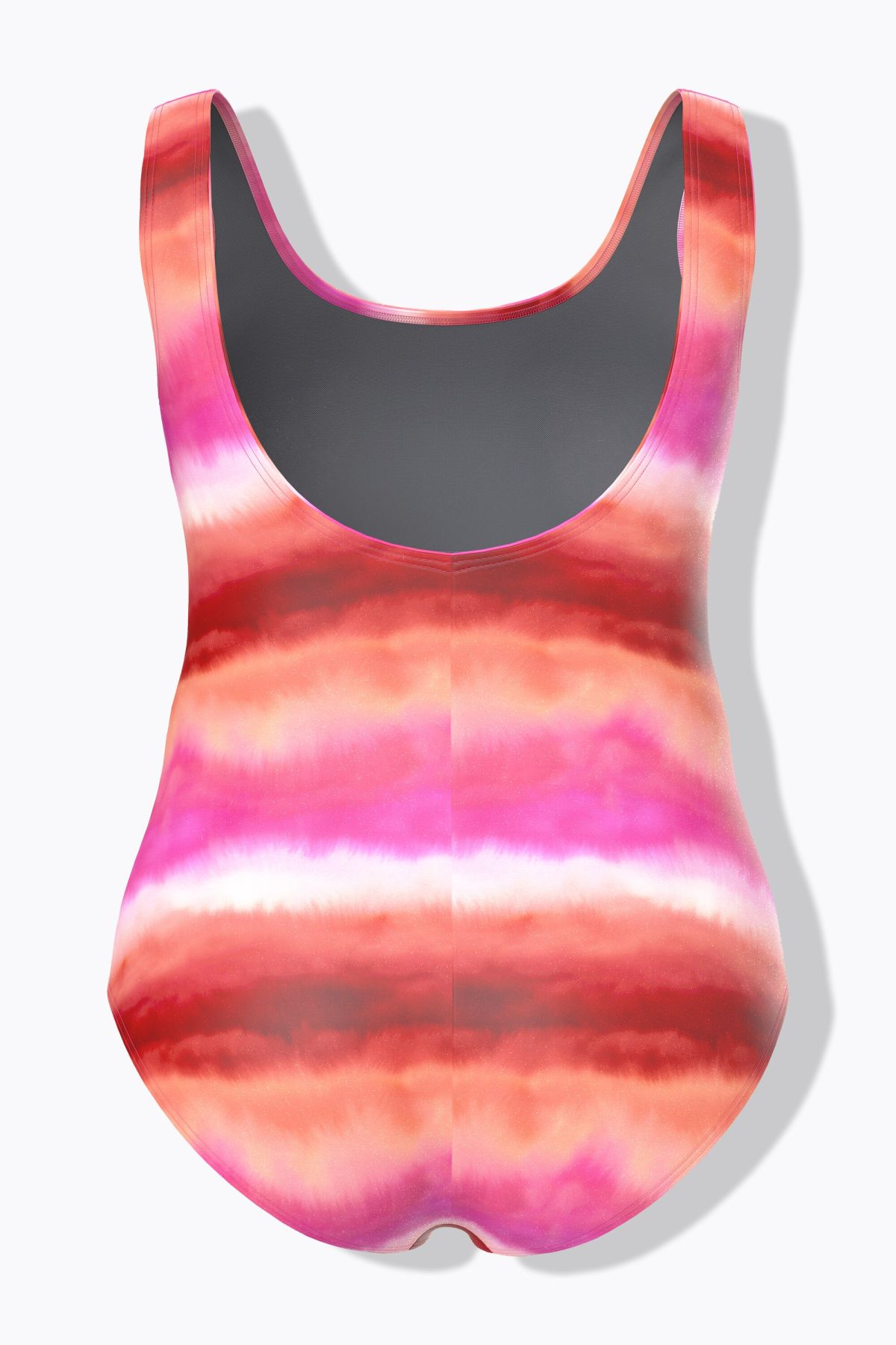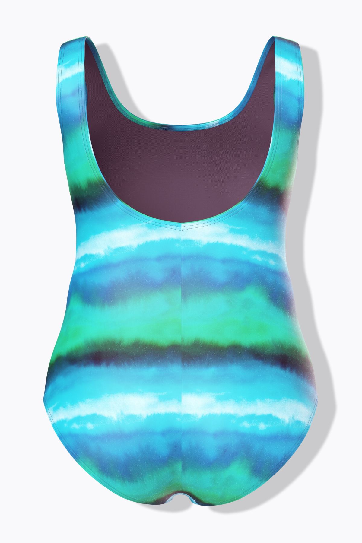 Бански на хоризонтални преливащи райета, без оформени чашки. Дълбоко изрязан гръб. Мека подплата, поддържаща лента под бюста. От еластична мека материя.