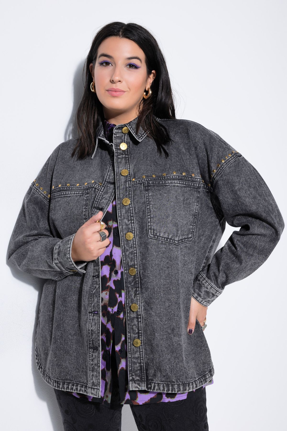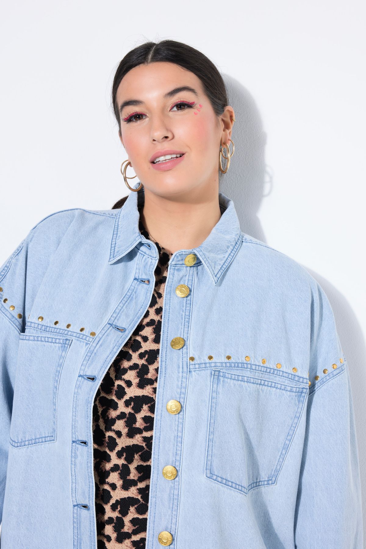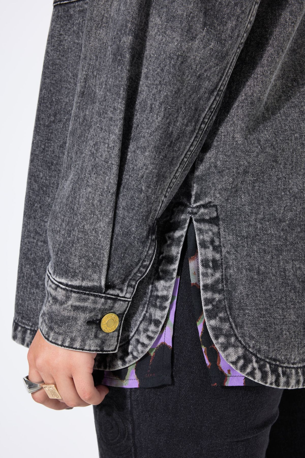Дънкова риза с винтидж стил и златисти копчета и декоративни капси. Модел с паднали рамене и дълги ръкави с маншети. Два джоба на гърдите и странични цепки на ризата. Уголемена и свободна кройка
