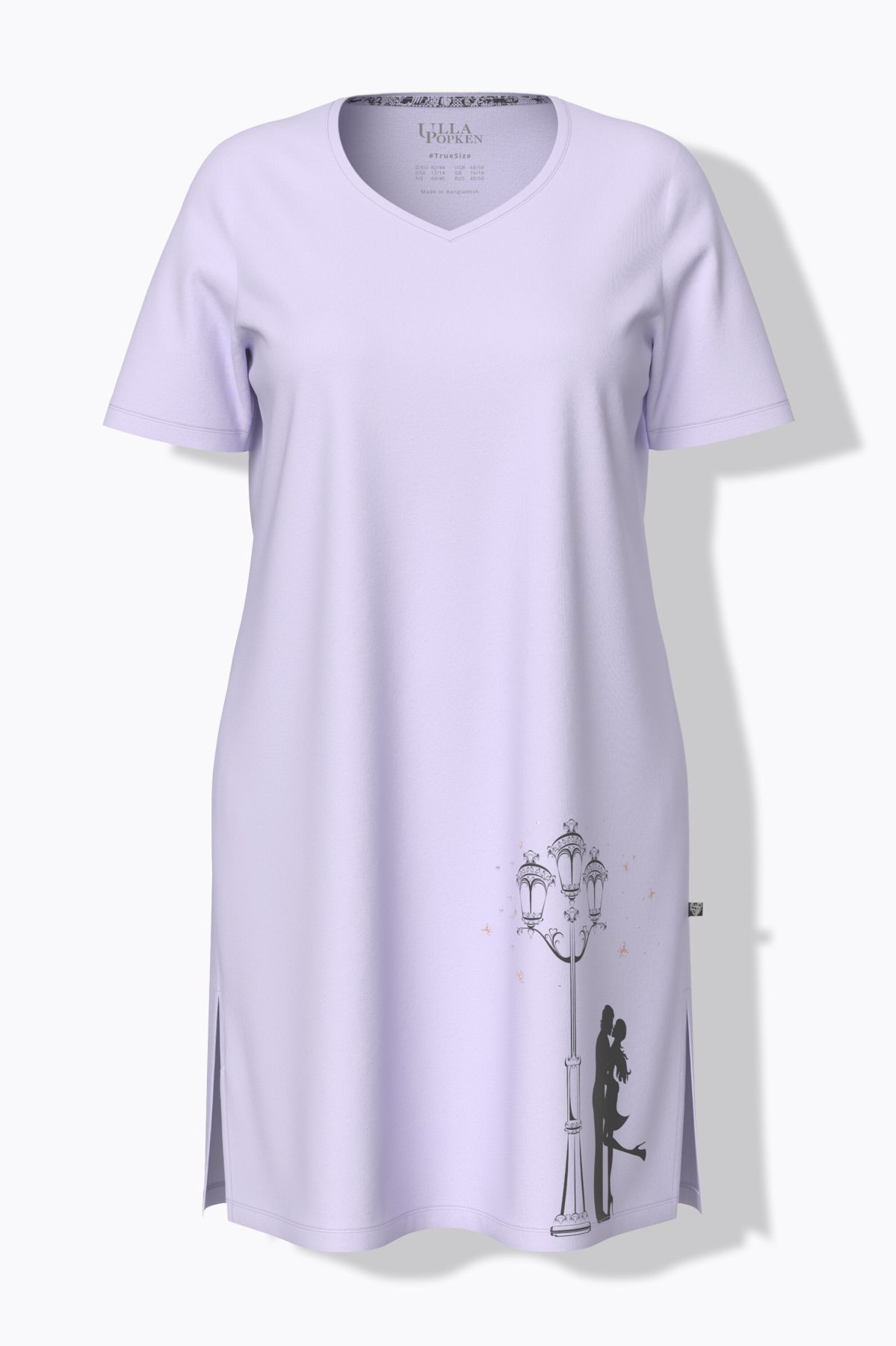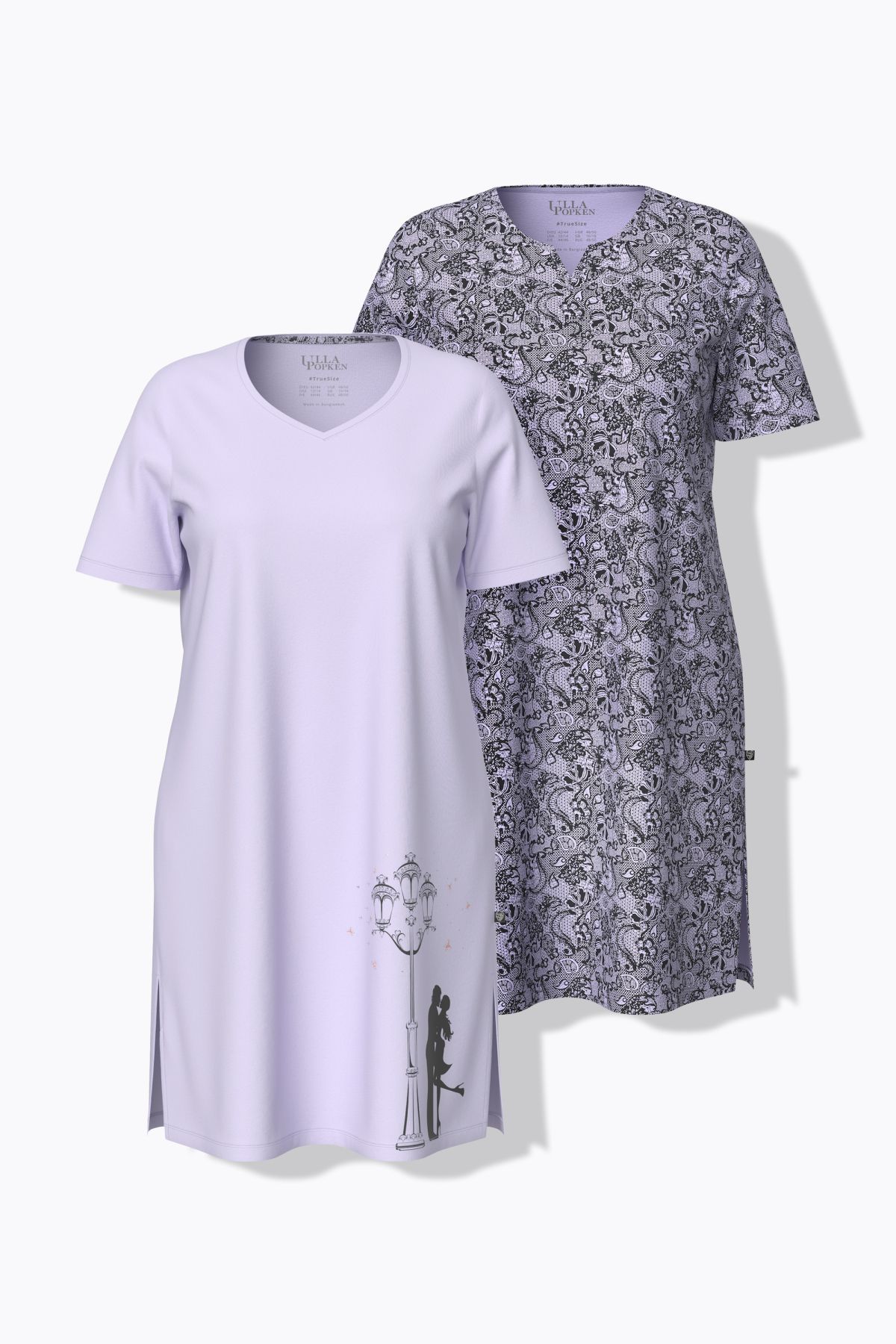 Комплект от 2 броя нощници - едната изцяло с принт и кръгло деколте с цепка, другата с едноцветна със сърцевидно деколте. И двете с къси ръкави и странични цепки на подгъва.