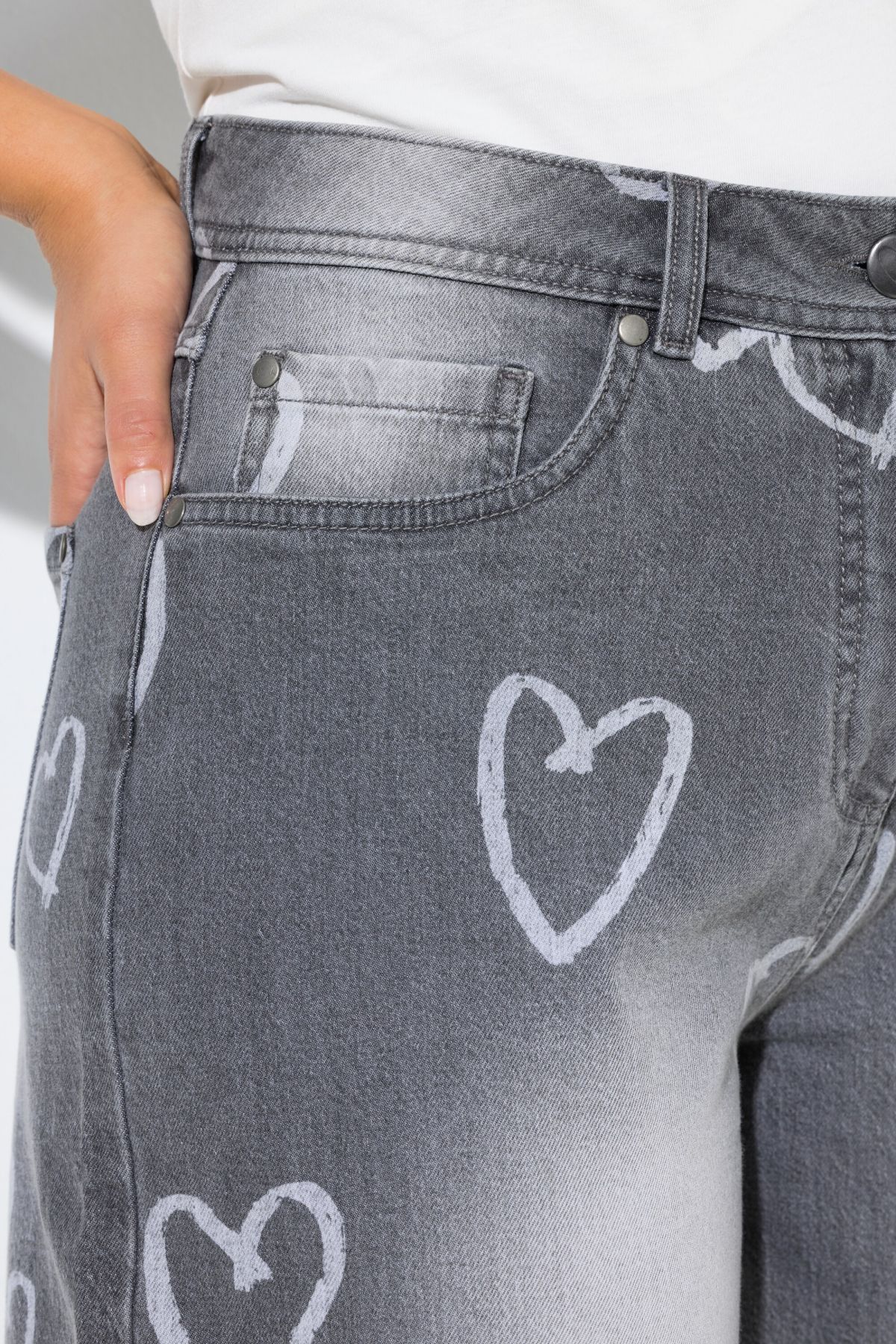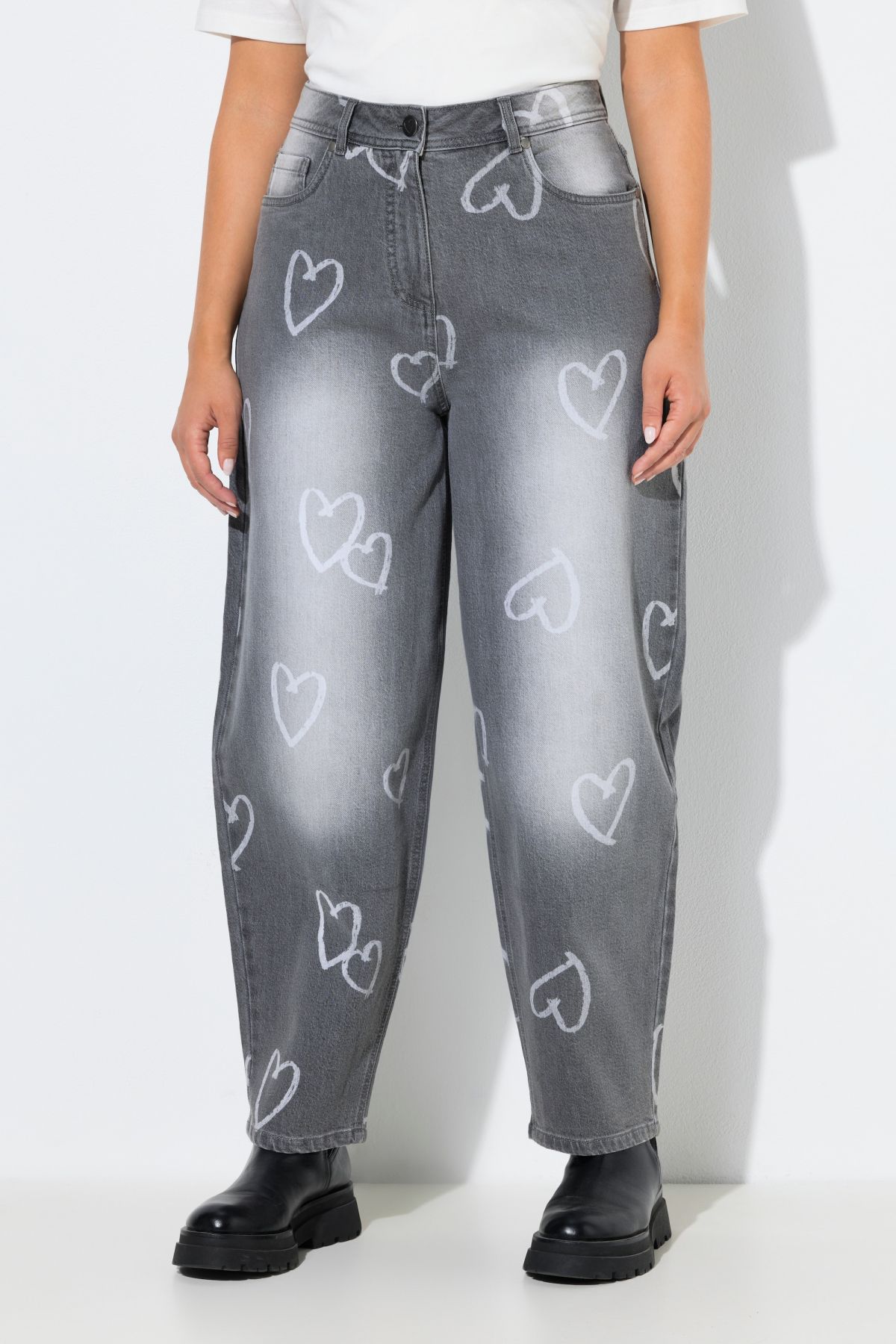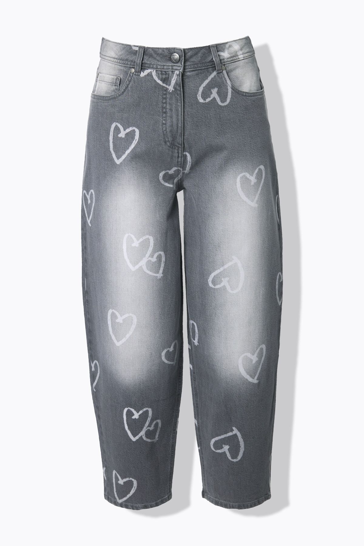 Дънки тип Mom с модерен принт на сърца и модерни крачоли тип балон. С фиксирана талия с гайки за колан, копче и цип. Дизайн с 5 джоба. От мека, памучна материя.