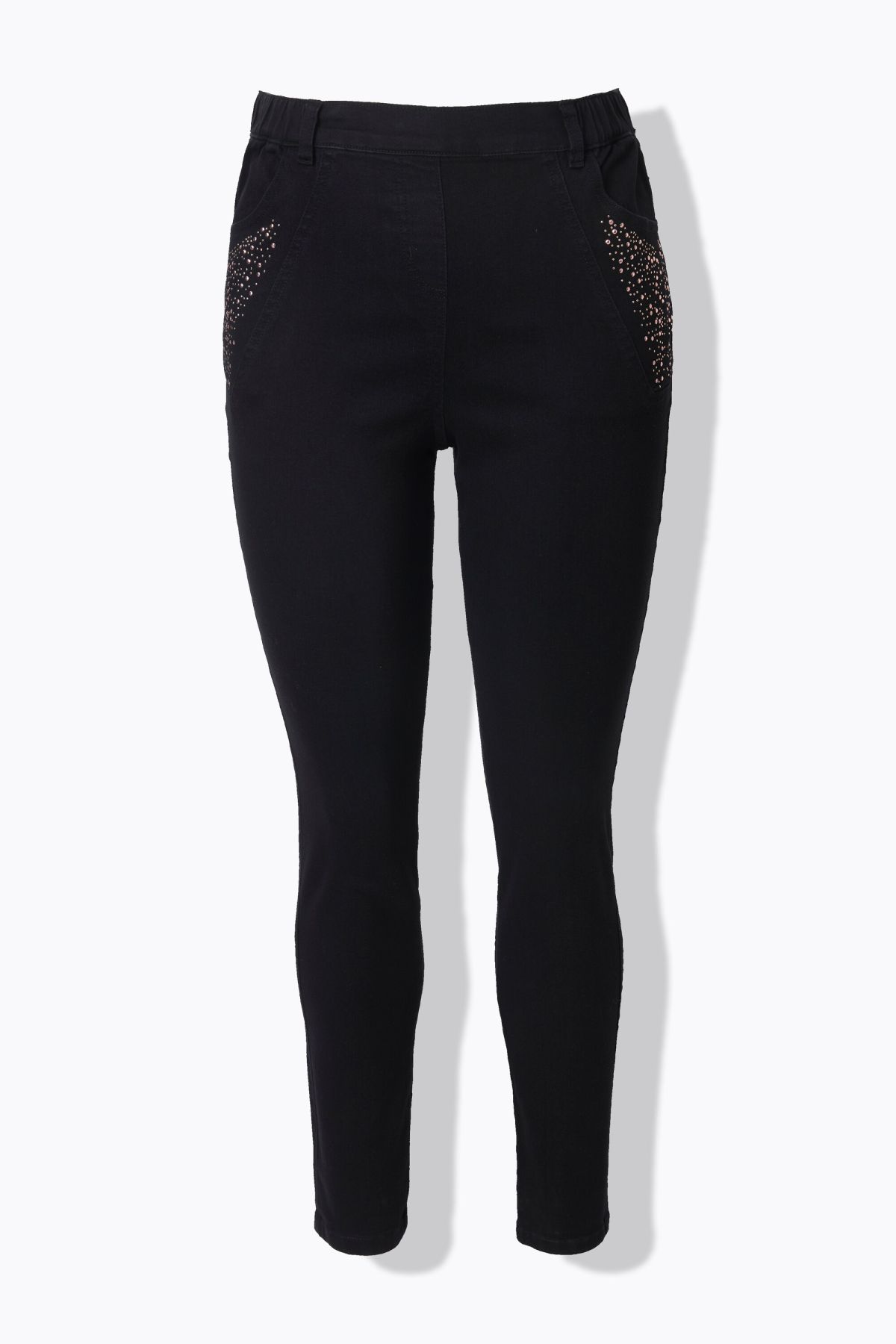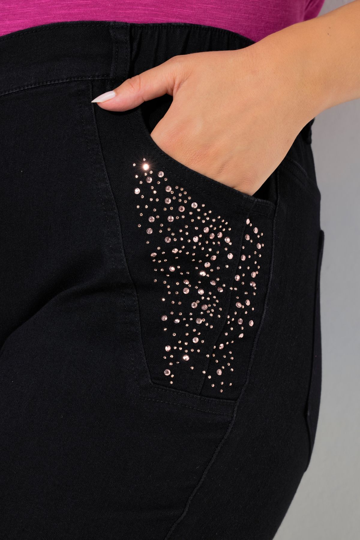 Панталон тип клин с бляскави камъчета на джобовете придаващи елегантност на визията. С еластична талия и тесни крачоли.