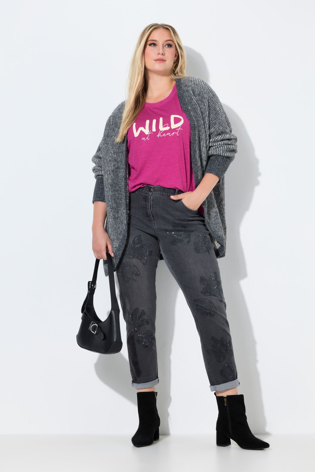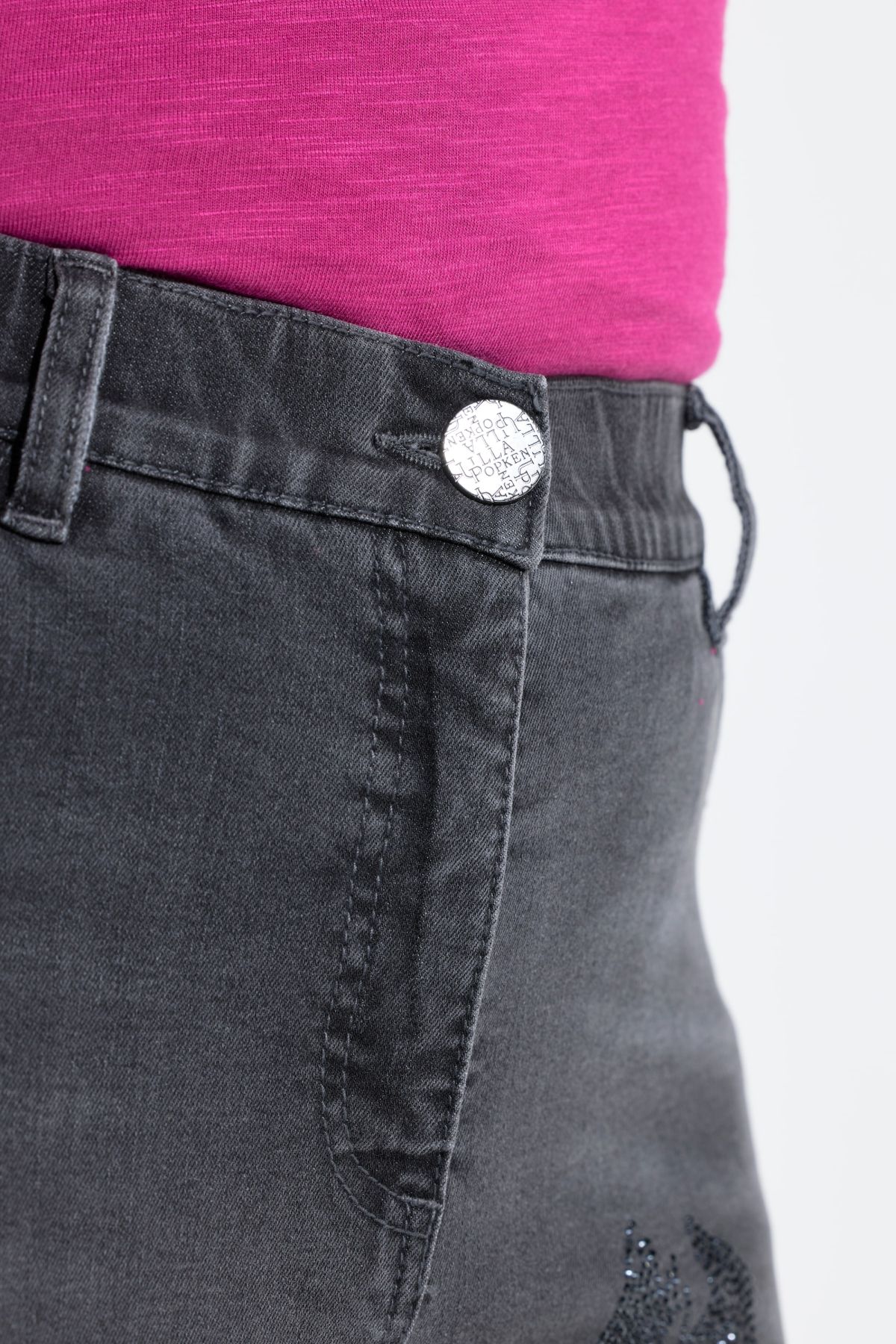 Дънки тип Boyfriend с цветя от камъчета. С фиксирана талия с гайки за колан, копче и цип. Дизайн с 5 джоба. От мека, памучна материя.