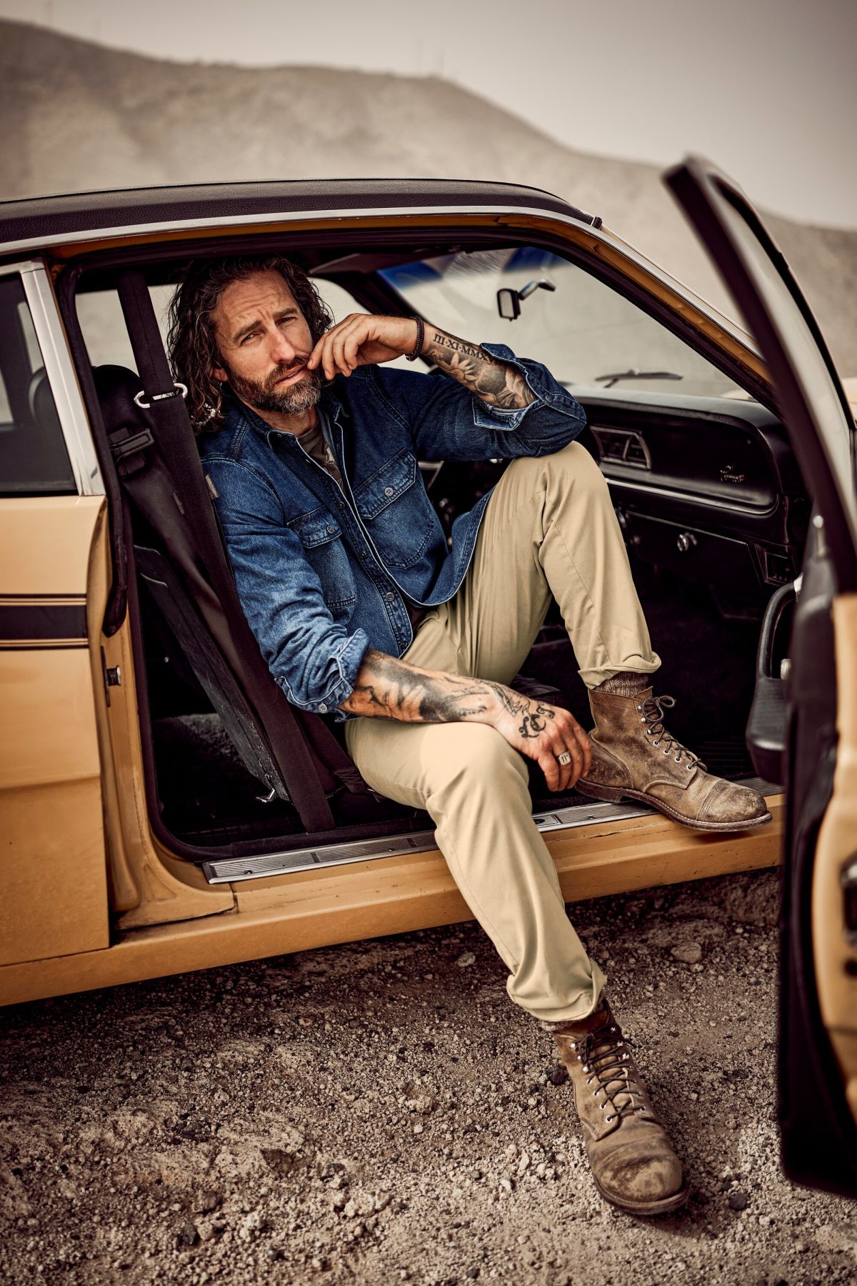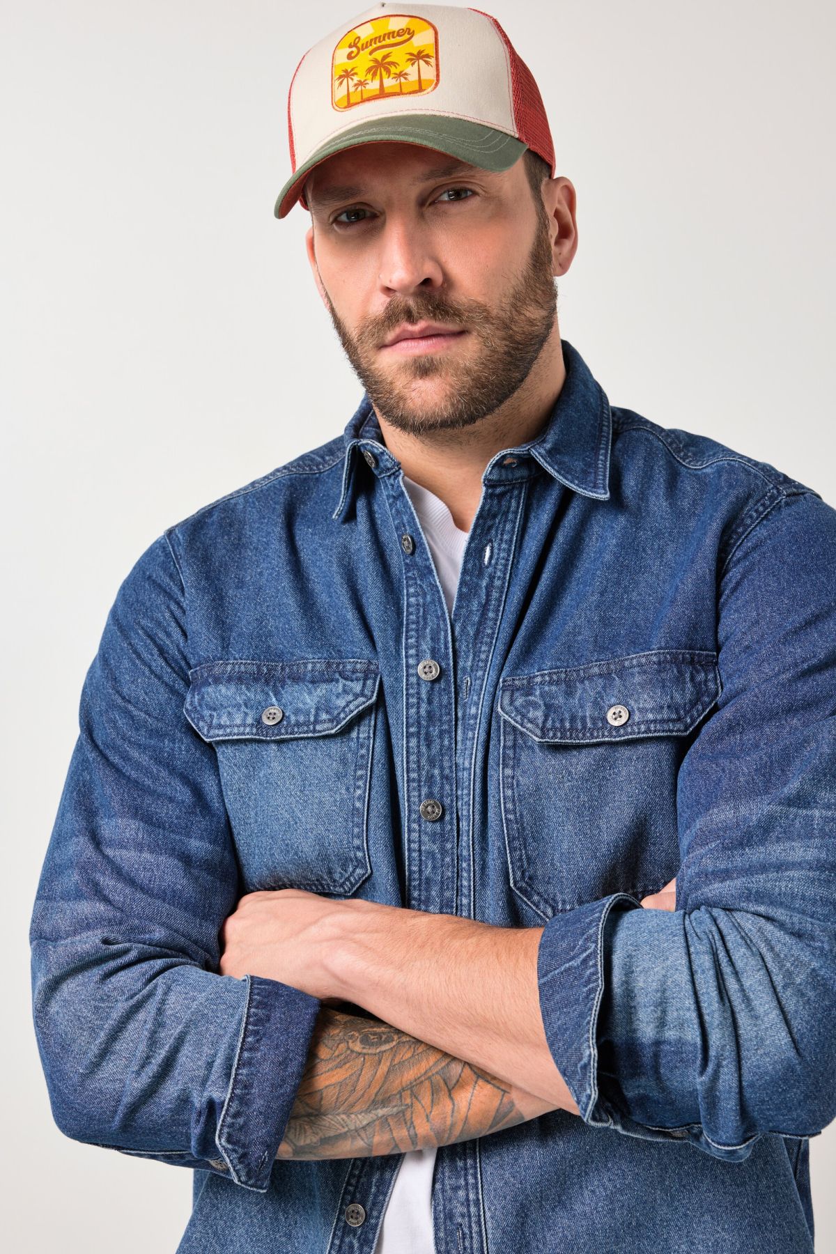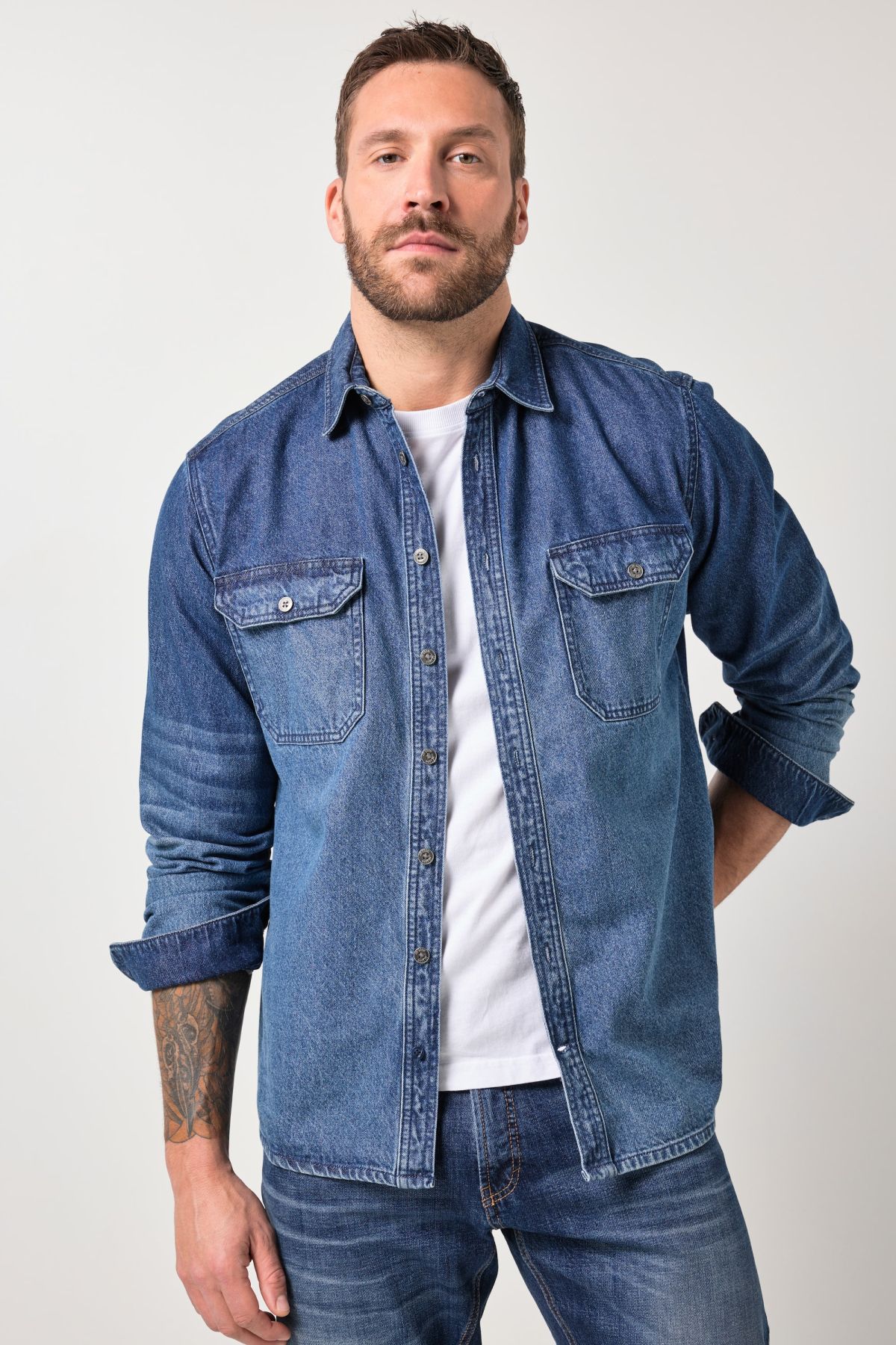 Дънкова риза с класическа кройка. С модерна кент яка, копчета отпред, джобове на гърдите и дълги ръкави с маншет с копче.