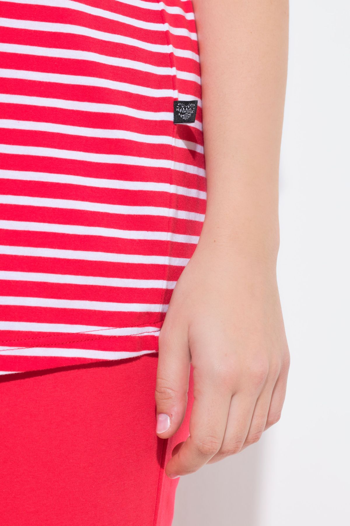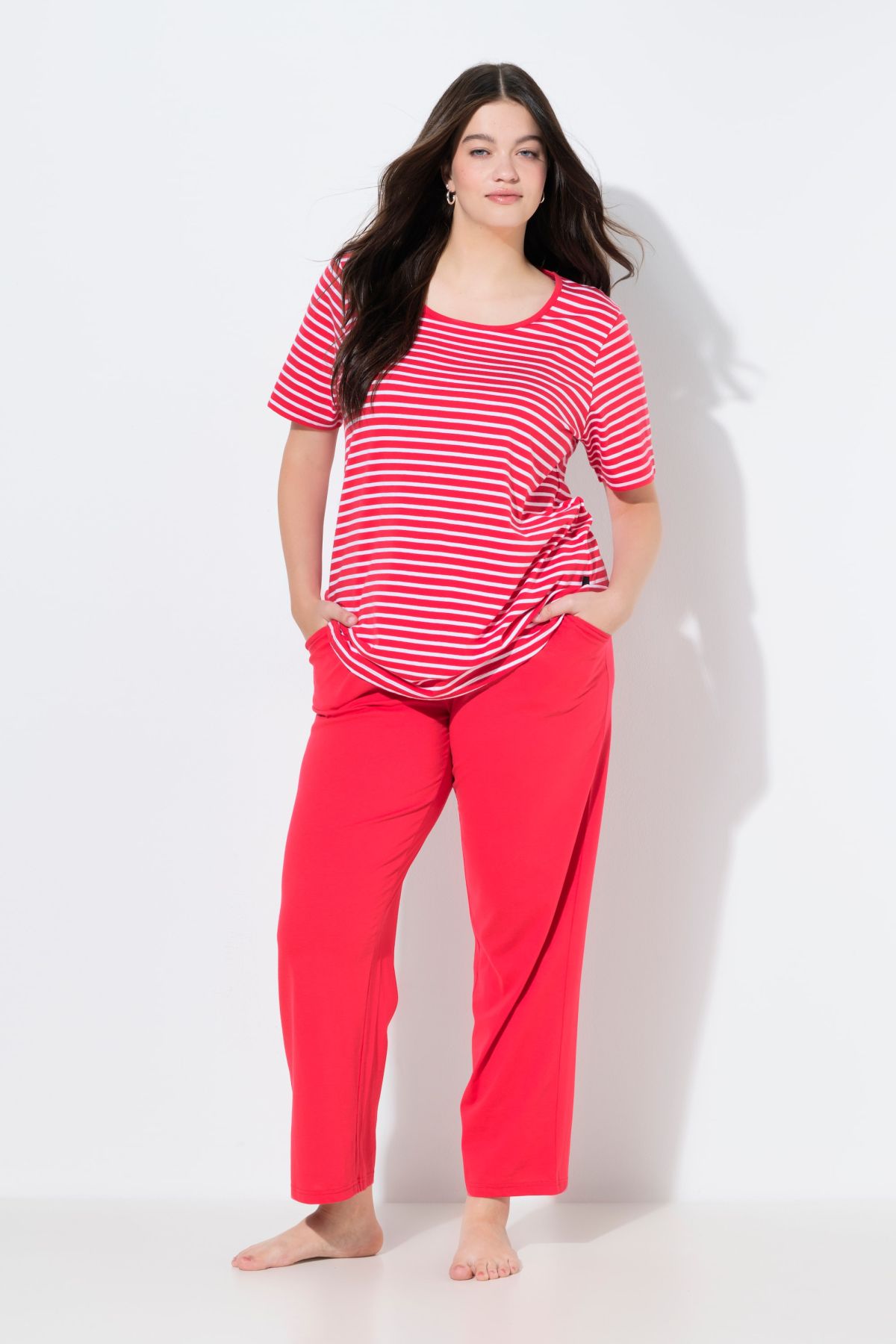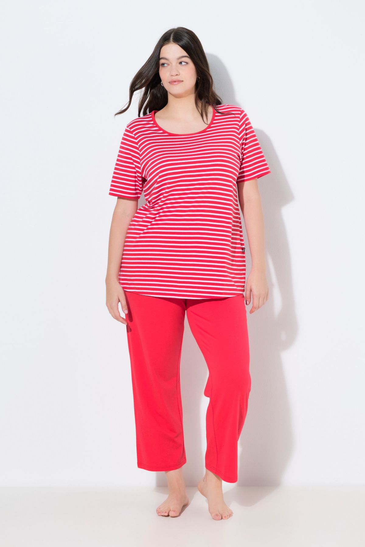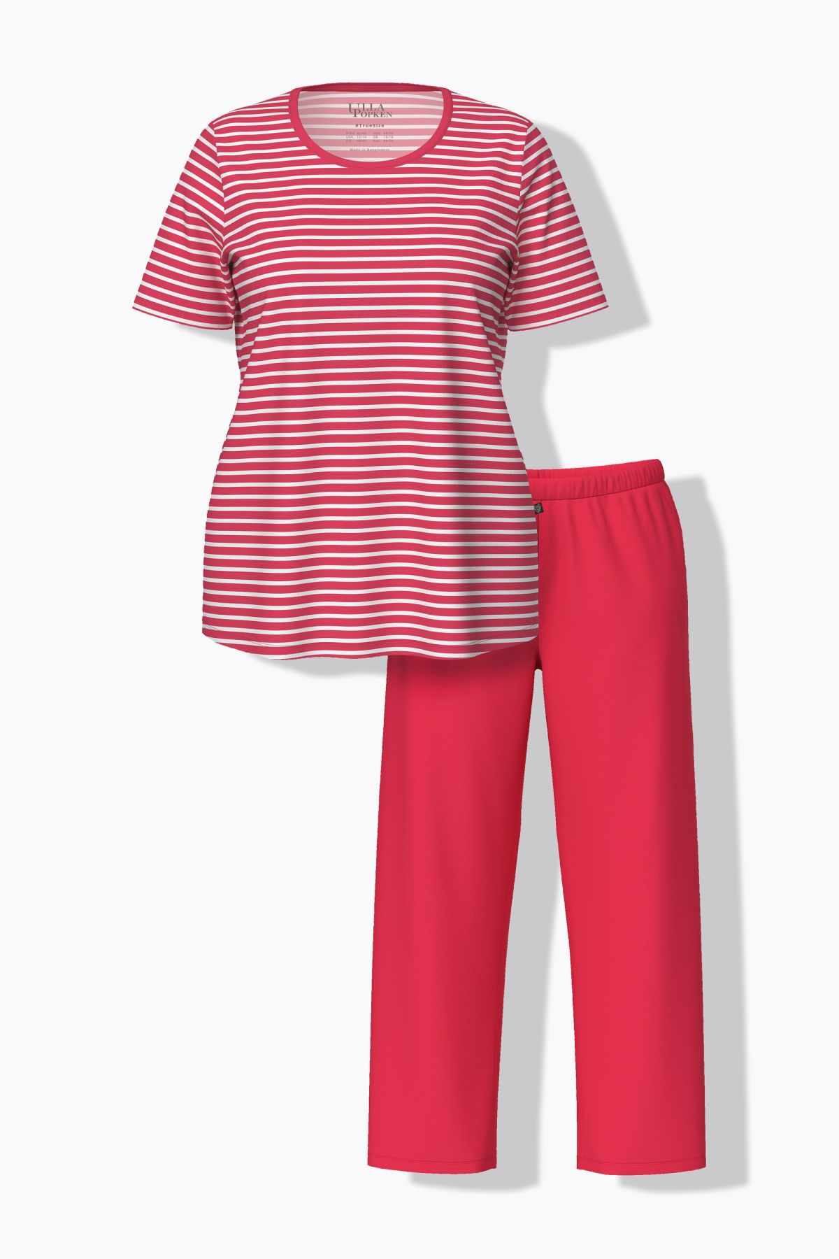 Пижама комплект от 2 части - дизайн с раирано горнище с кръгло деколте и къси ръкави. С долнище с еластична талия, широки крачоли и странични джобове.
