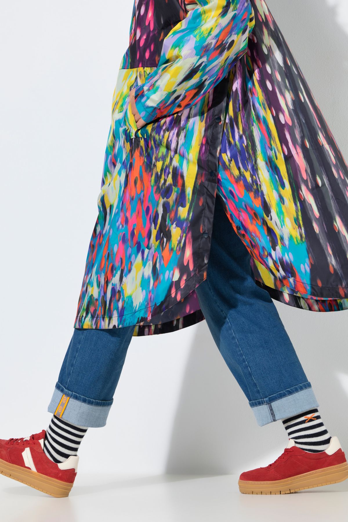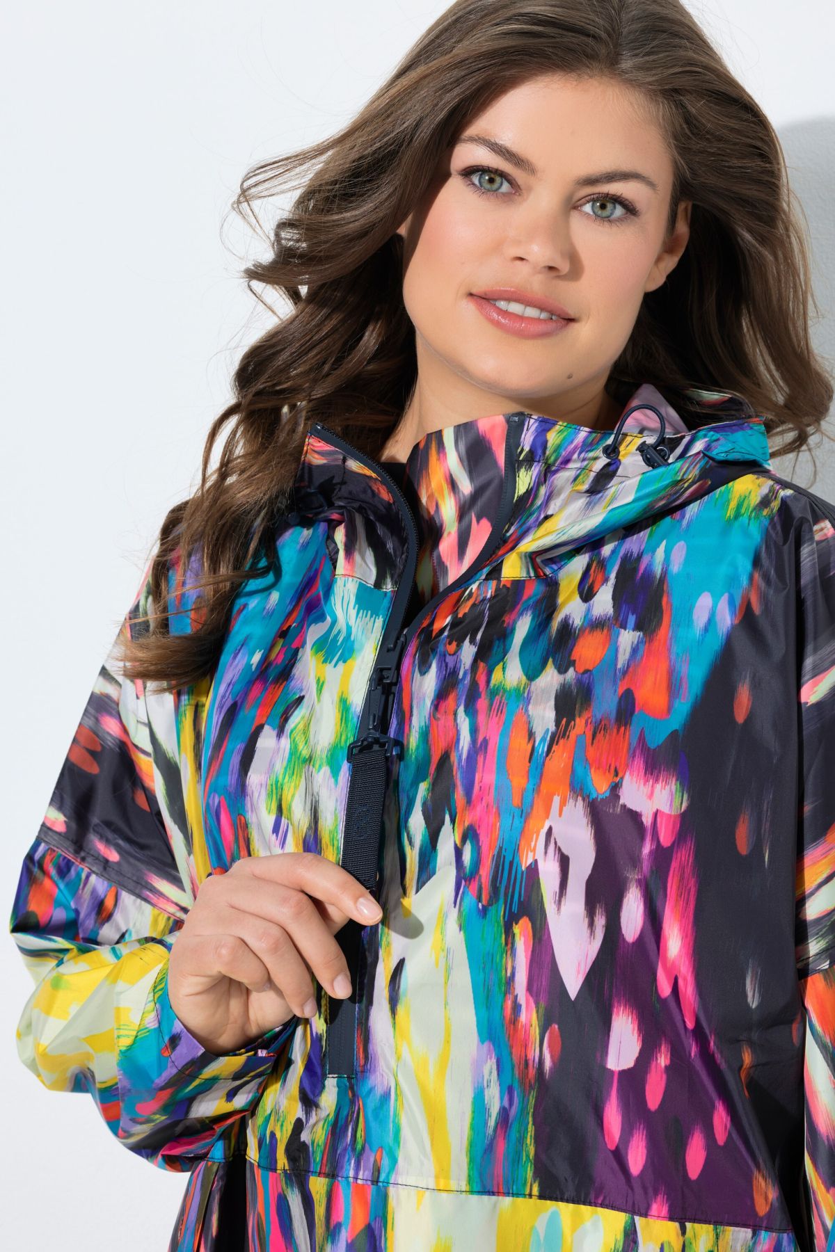 Дъждобран с абстрактен принт тип пончо. Дълги ръкави с ластичен маншет, закопчаване с цип в горната част и регулируема качулка с козирка. Странични джобове и странични цепки с тик-так закопчаване.