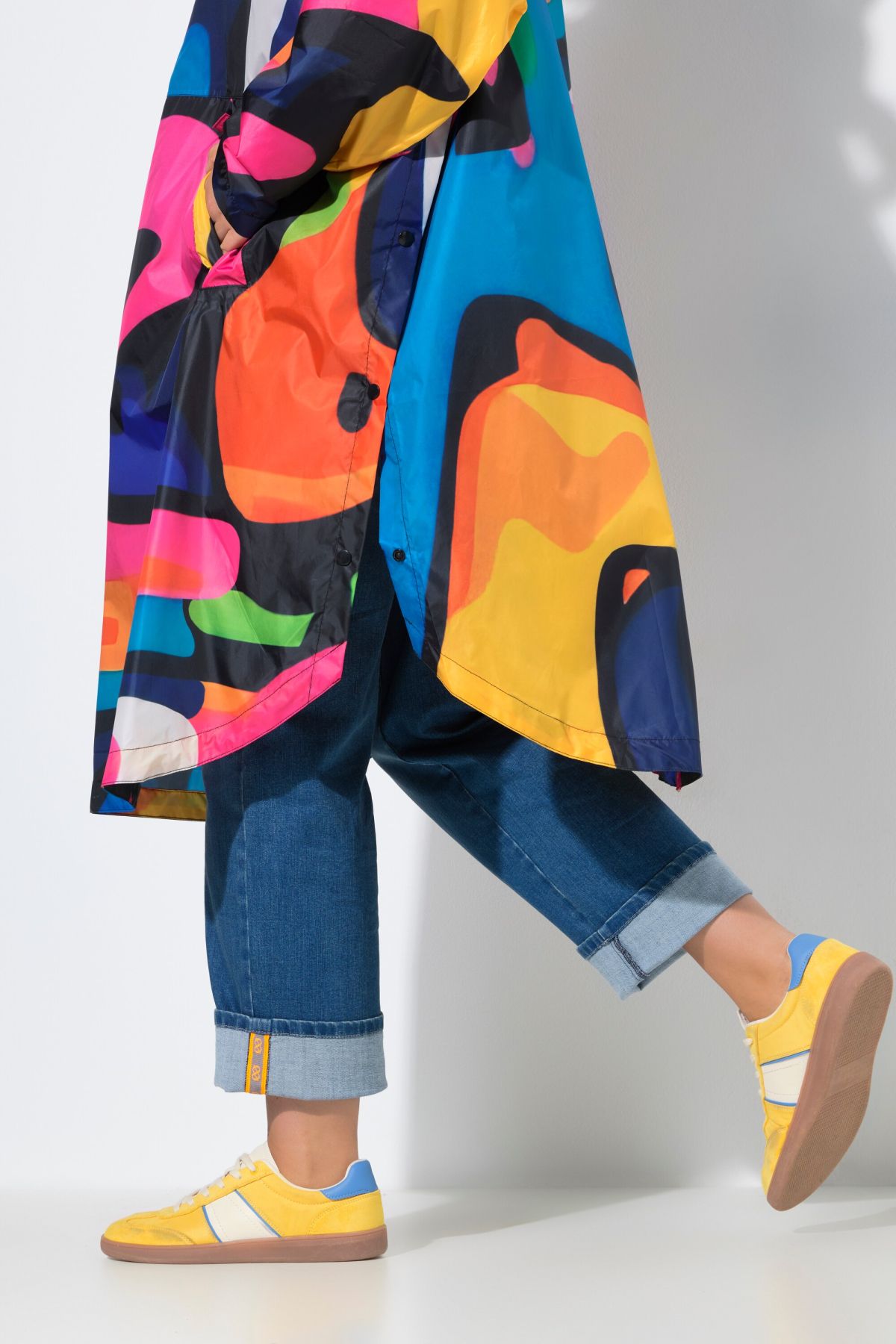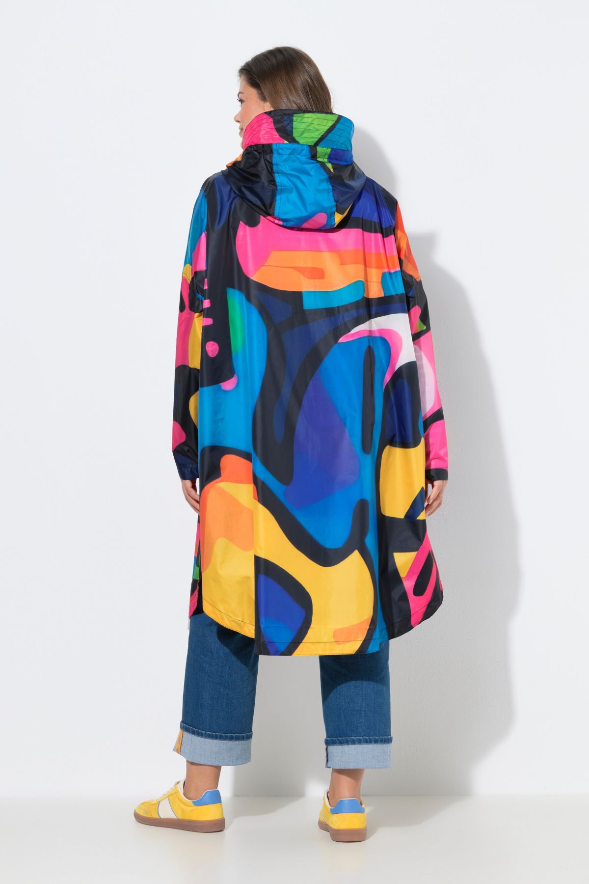 Дъждобран в светли тонове, тип пончо. Качулка с козирка и пристягаща връзка, с маншети на ръкавите. Частично предно закопчаване с цип и странично тик-так закопчаване, с 2 джоба.