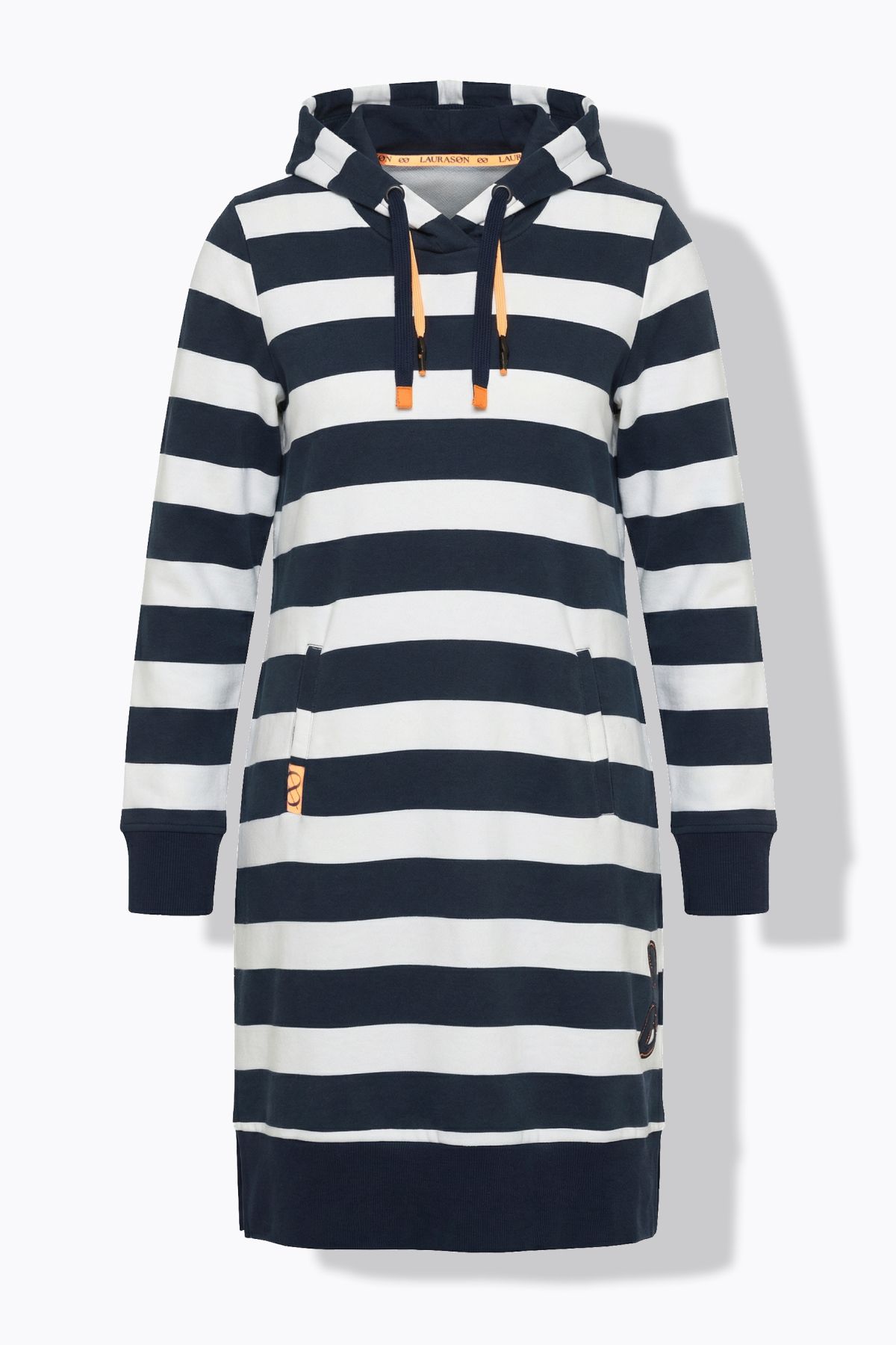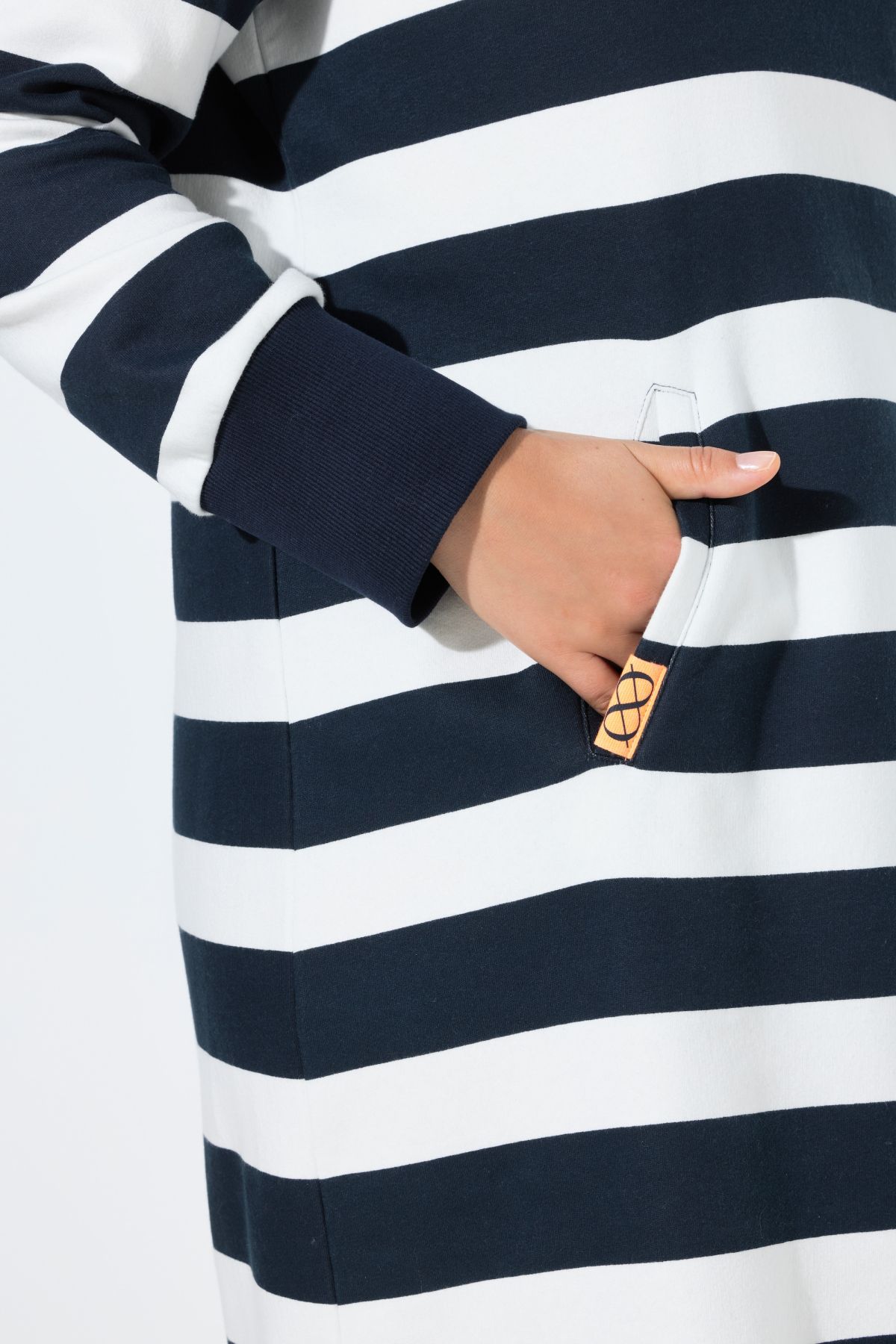 Рокля с хоризонтални райета и качулка с връзки за регулиране. Дълги ръкави с рипсени маншети и преден джоб тип кенгуру. От мек памучен материал