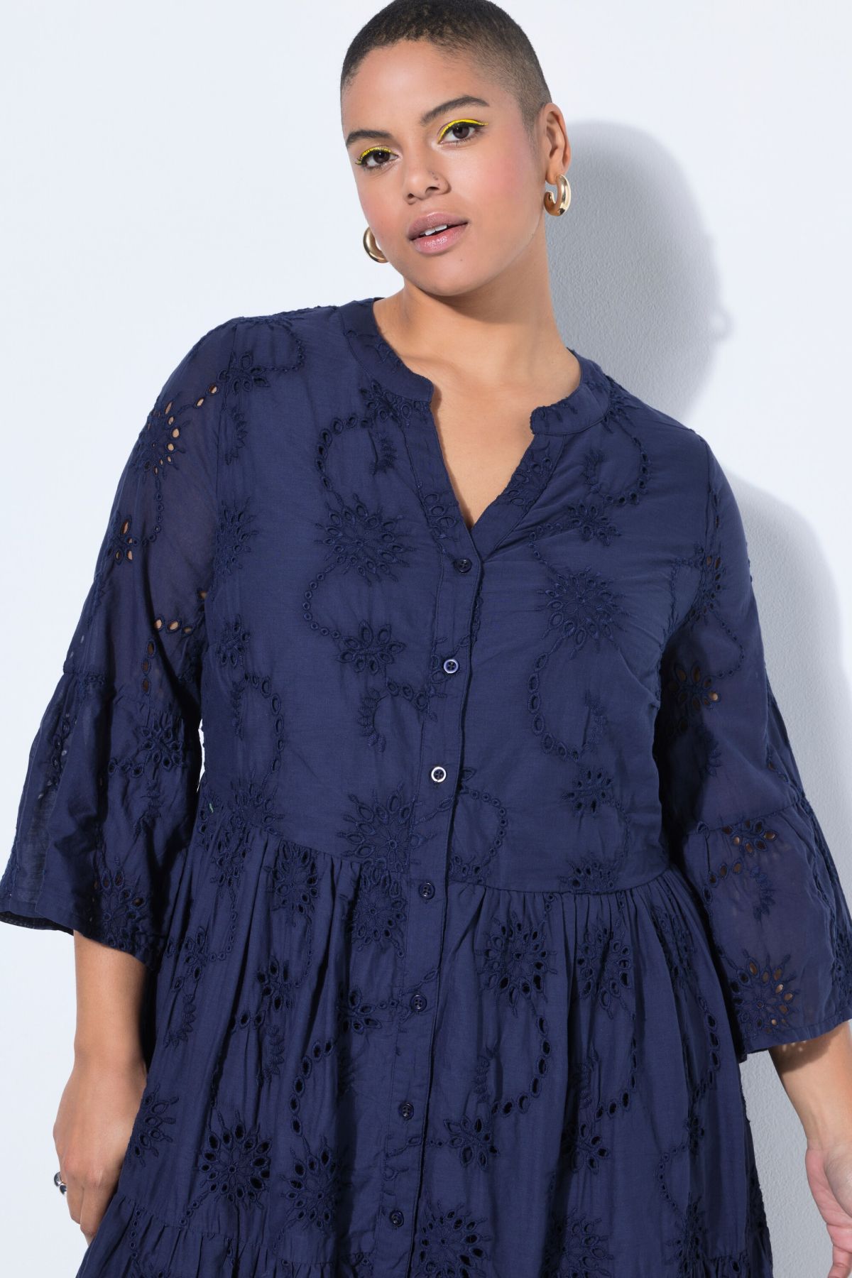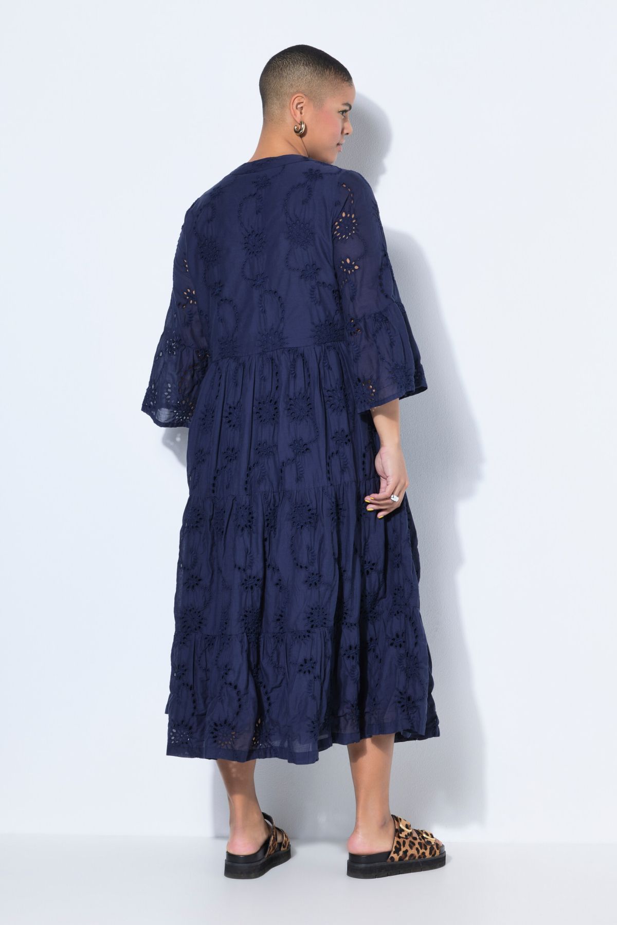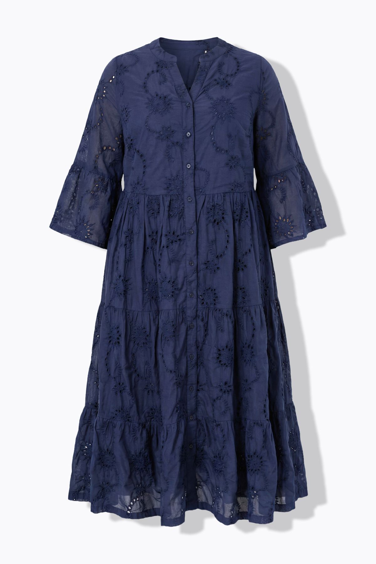 Рокля с флорална бродерия и широки акценти. С кръгло деколте с цепка и 3/4 ръкави. С перфектна дължина