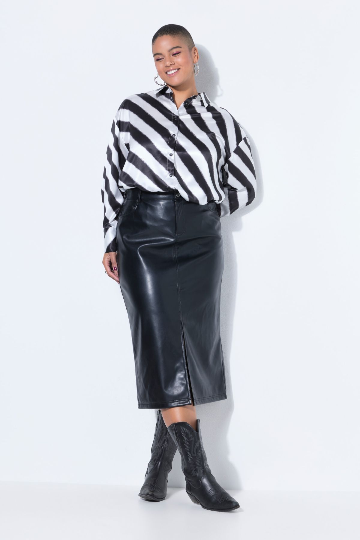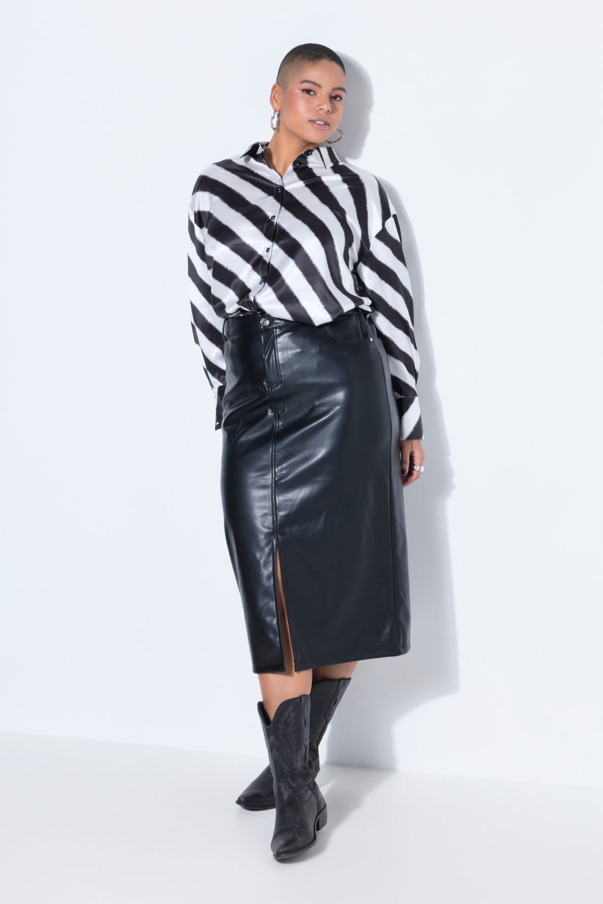Пола от изкуствена кожа с А - линия на силуета. С фиксирана талия гайки за колан, с копче и цип отпред. Със странични джобове и дълбока цепка отпред улесняваща движенията.