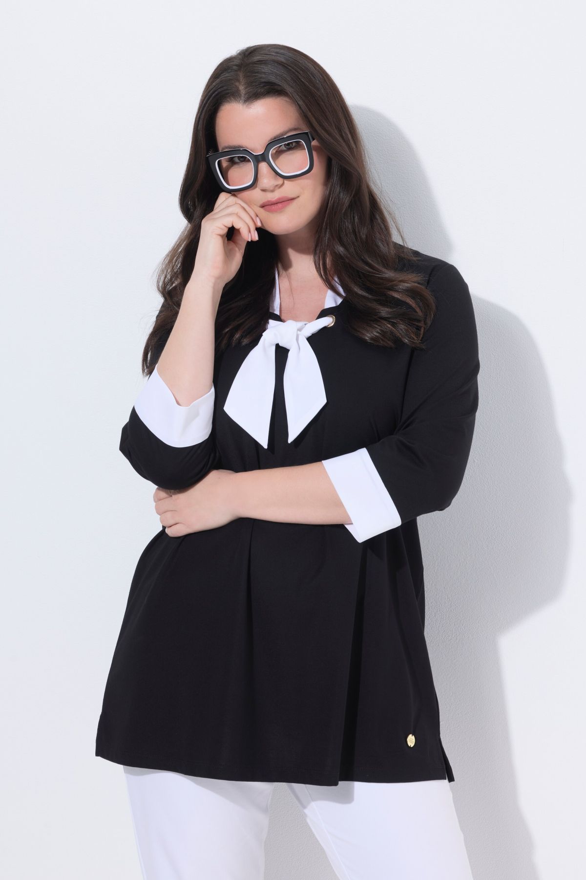 Блуза с връзка на V - образното деколте и 3/4 ръкави с контрастни акценти. ОТ мека като копринена материя.