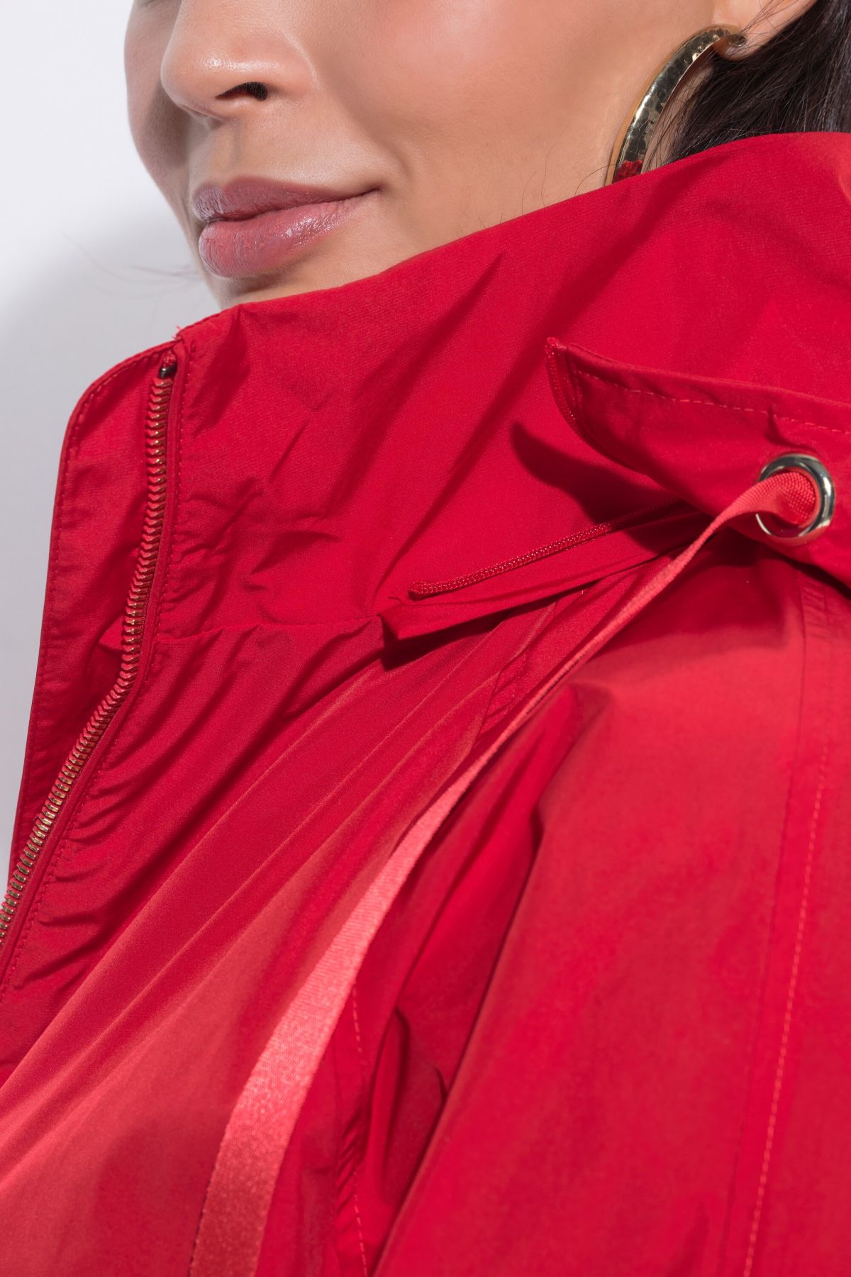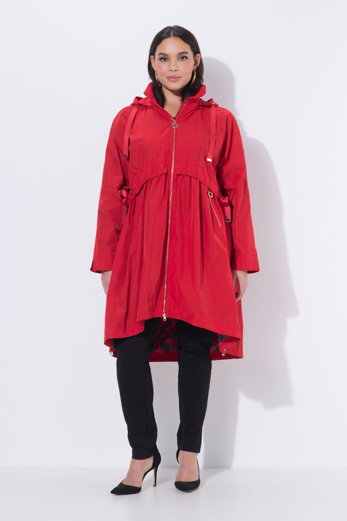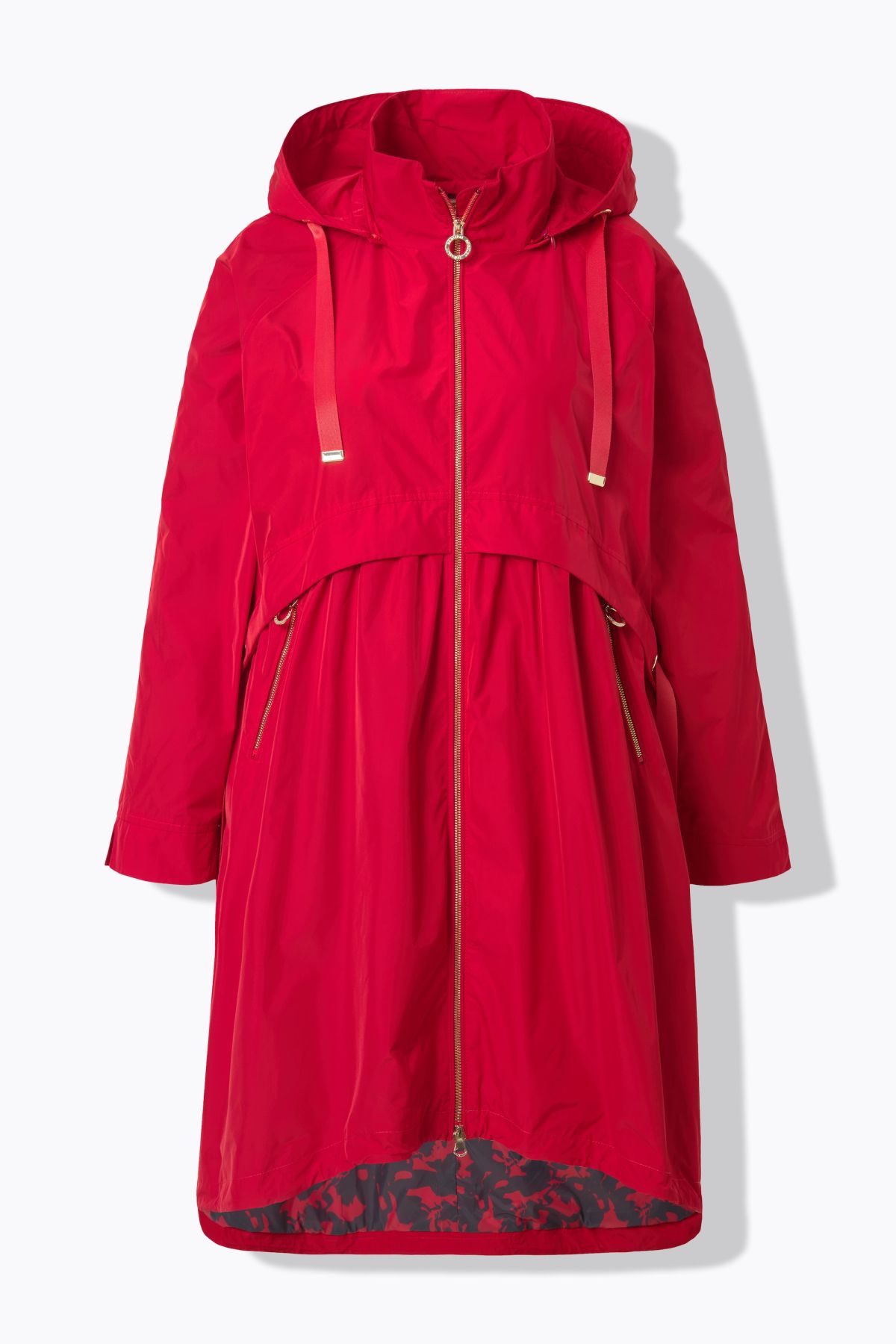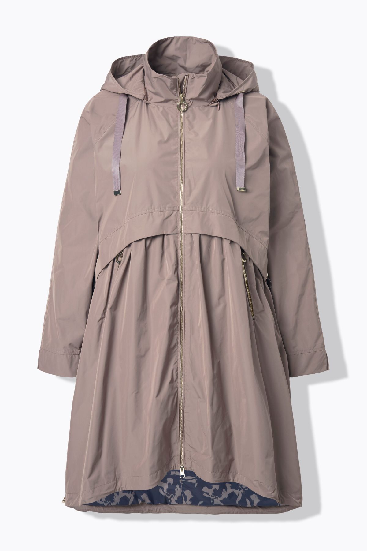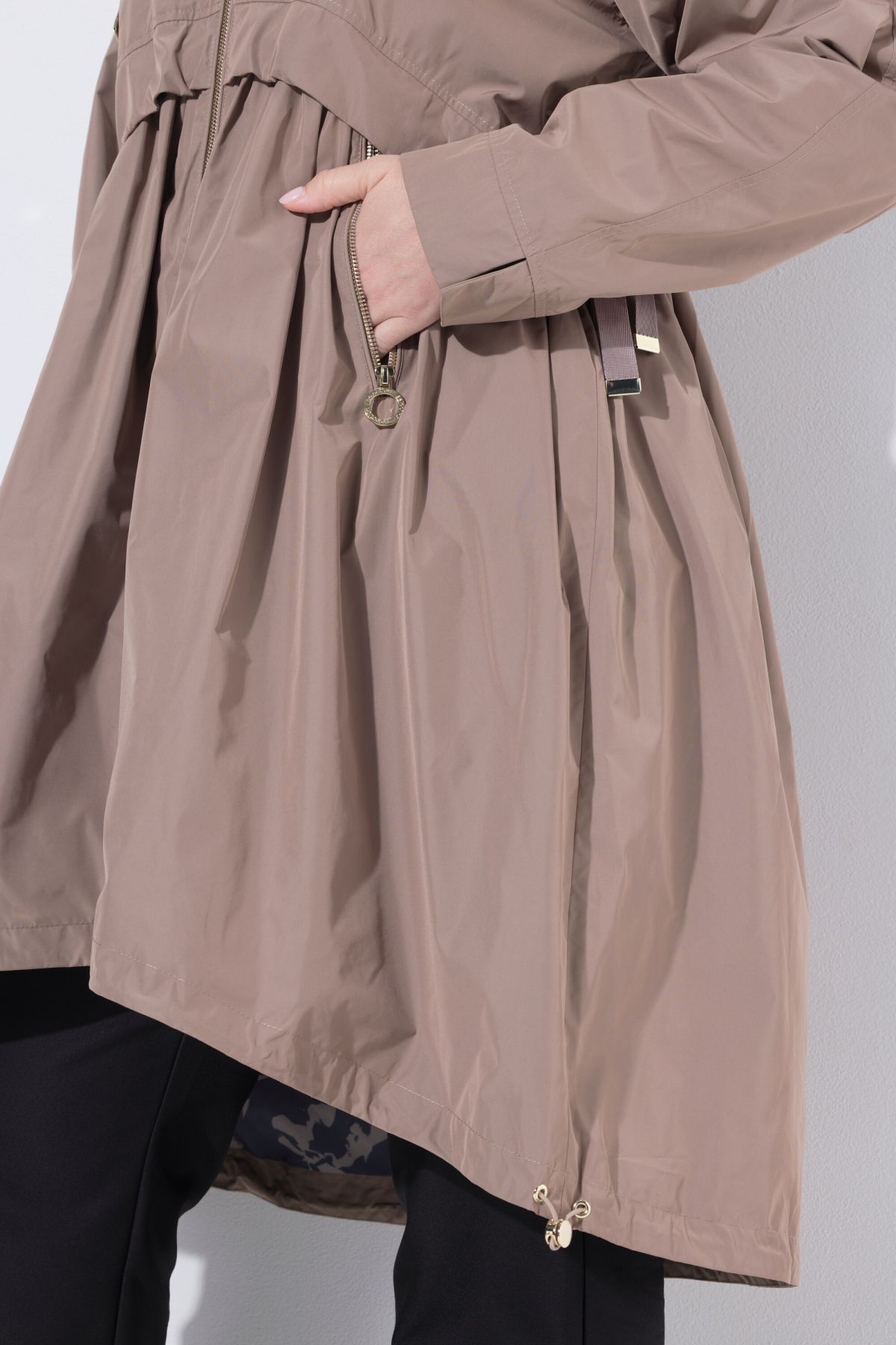 Палто за дъжд с кръстосващи се шевови акценти. Водонепромокаема материя с връзка на талията. Дизайн с качулка с връзка с метални детайли, цип отпред, странични шевови джобове и дълги ръкави. С А - линия на силуета.