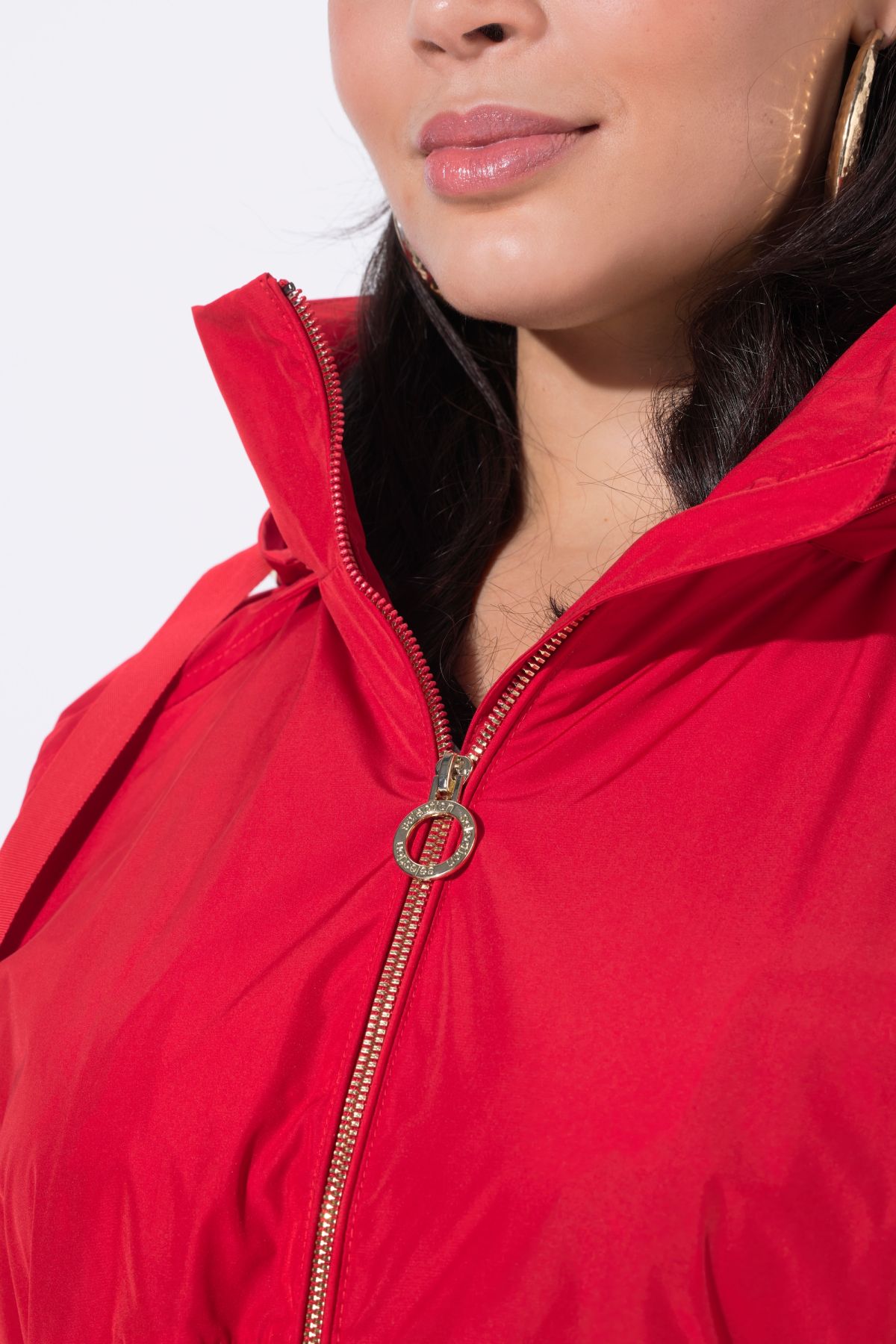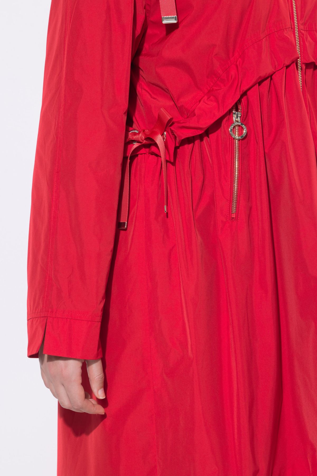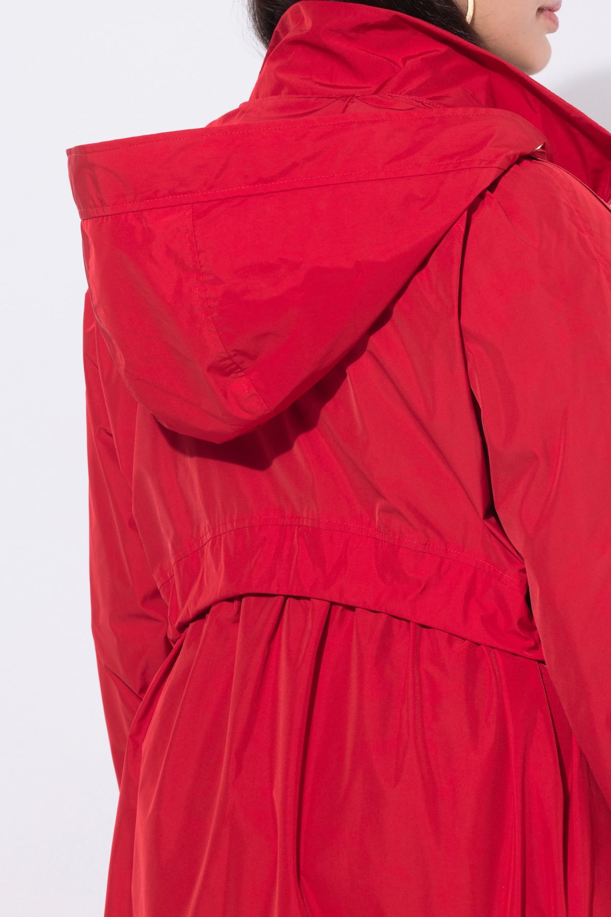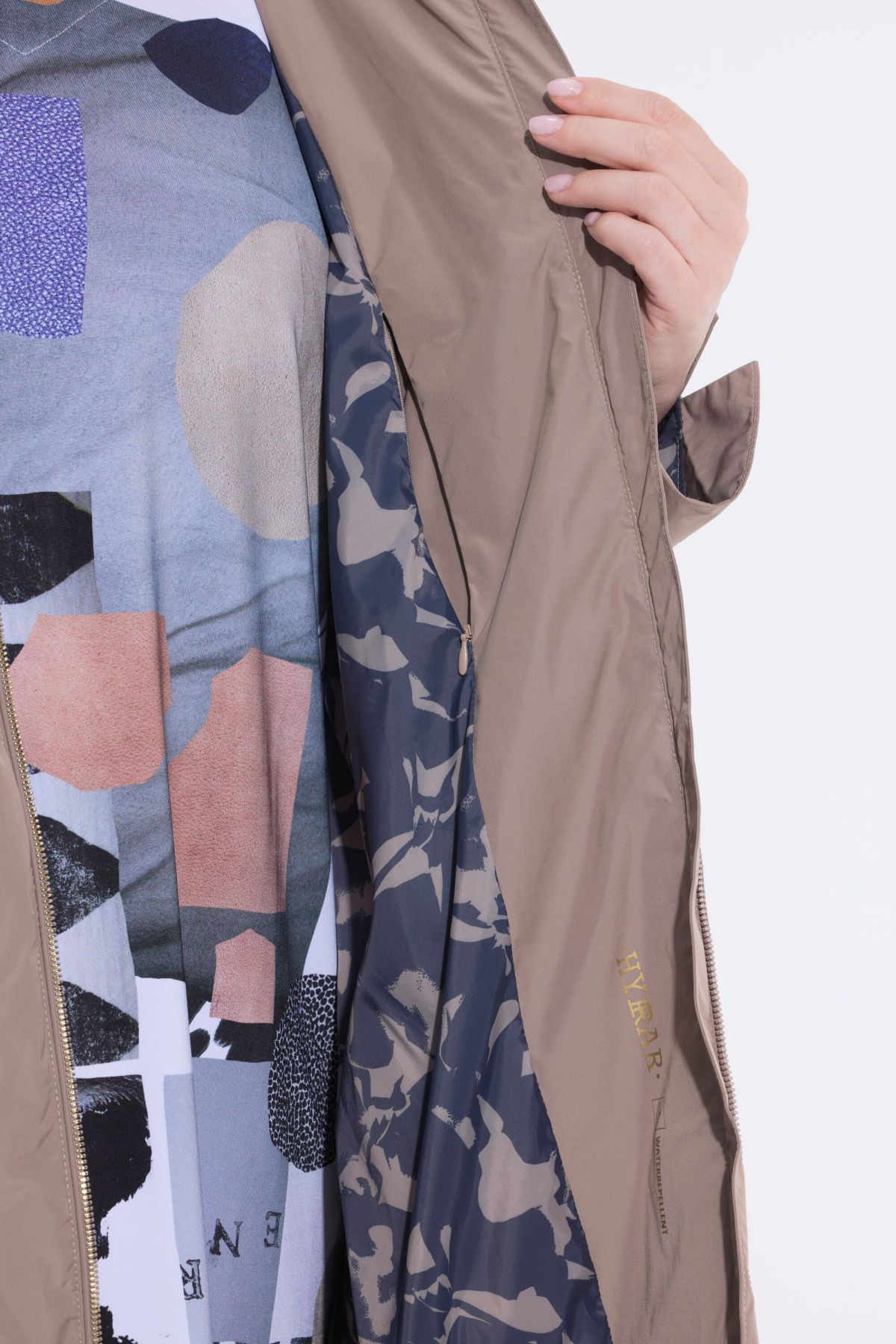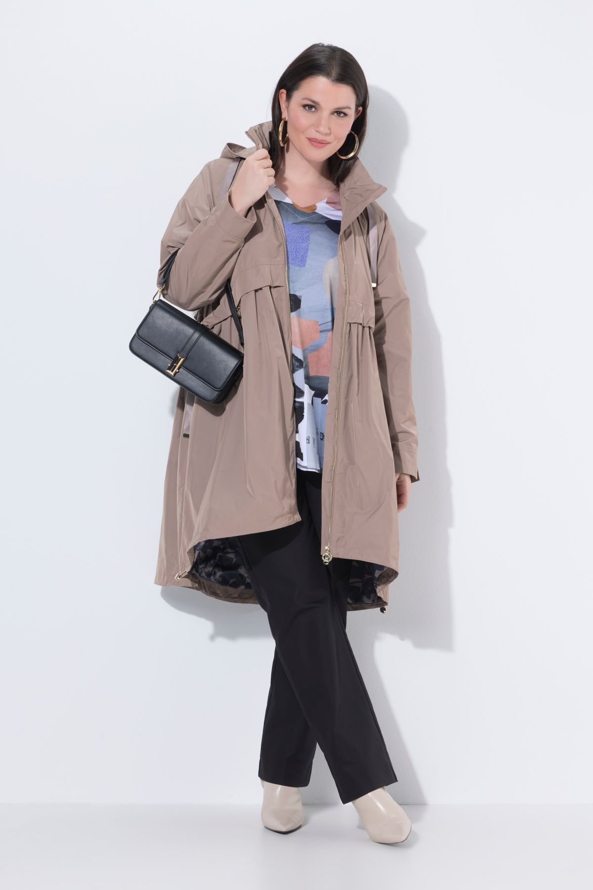 Палто за дъжд с кръстосващи се шевови акценти. Водонепромокаема материя с връзка на талията. Дизайн с качулка с връзка с метални детайли, цип отпред, странични шевови джобове и дълги ръкави. С А - линия на силуета.