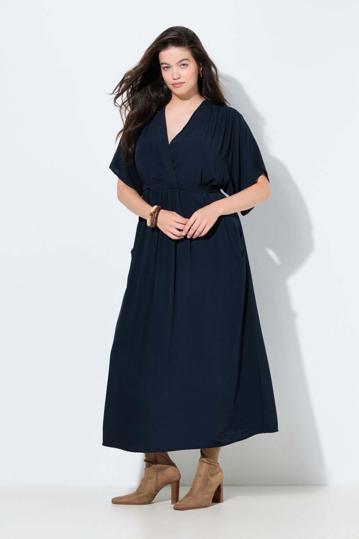 Рокля с визия тип прегърни ме и елегантен силует. С еластична лента на талията и къси ръкави. С А - линия на силуета. Стил и комфорт от прохладна вискоза.