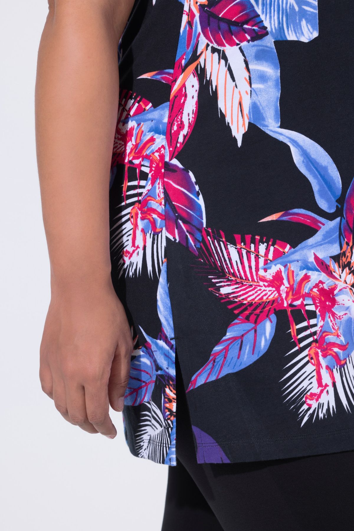 Туника с флорален мотив и къси ръкави с маншет. Класическа разкроена визия тип А-силует, широко кръгло деколте, от чист памук.