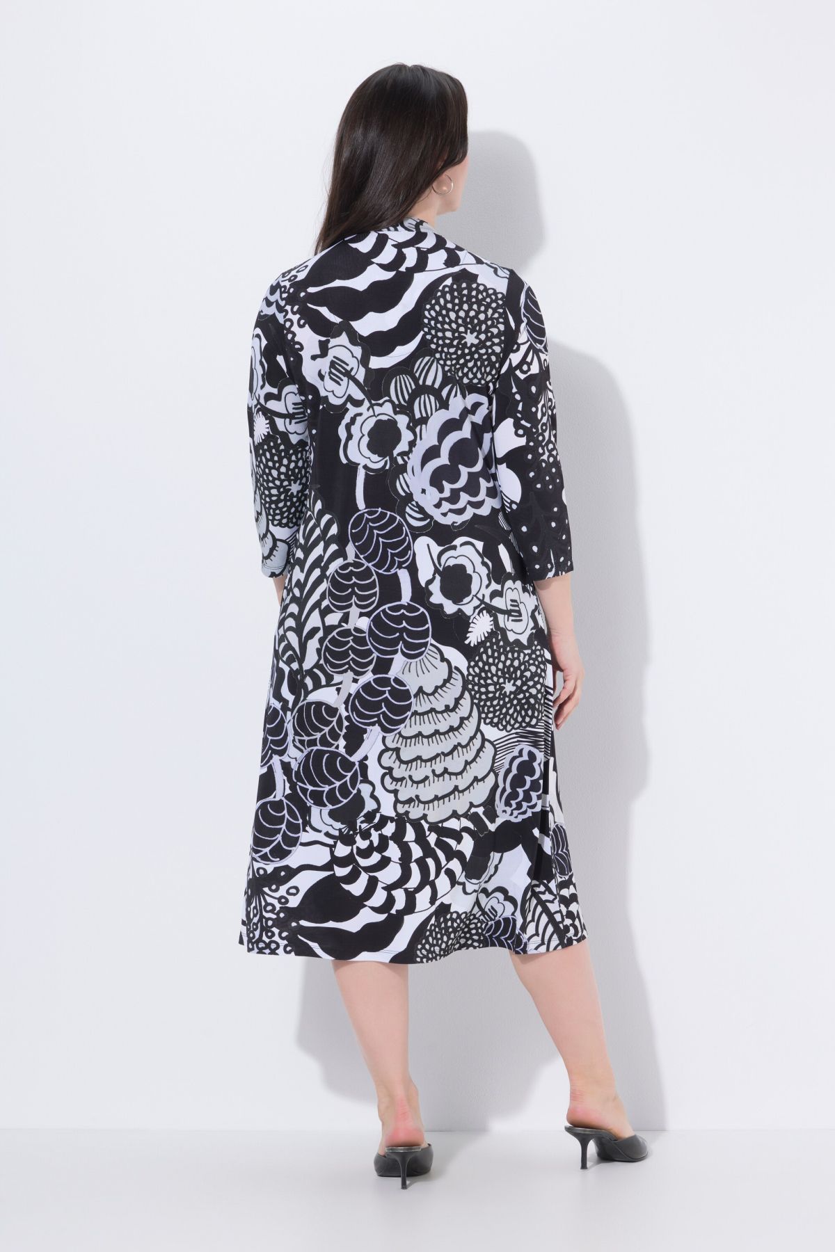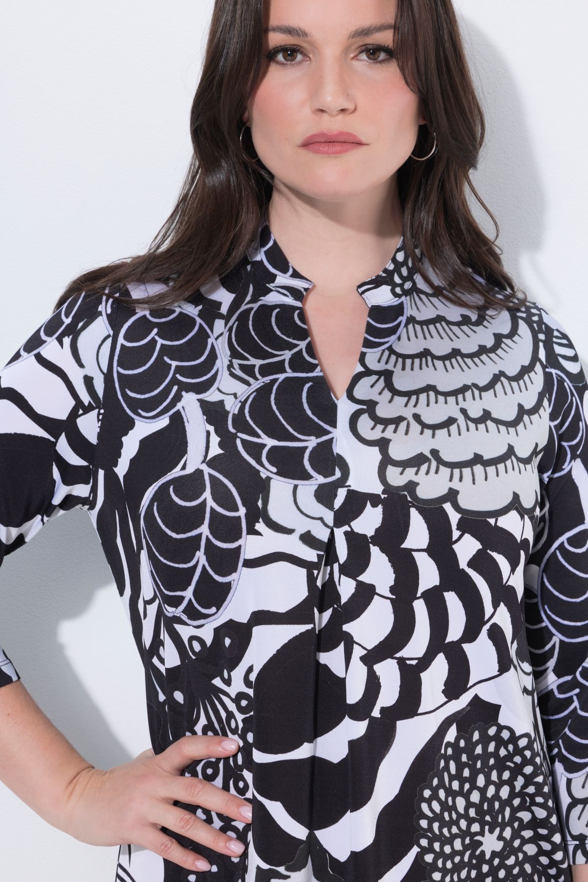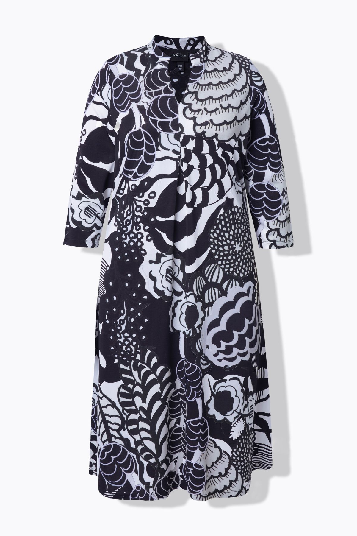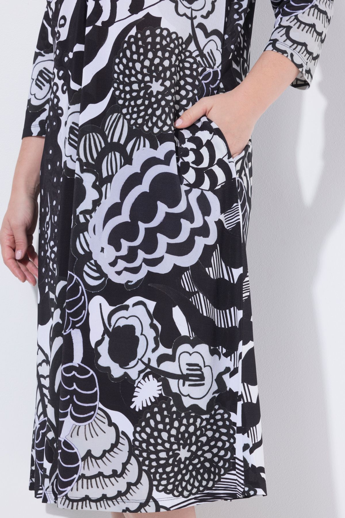 Рокля с графичен дизайн и столче яка с V-деколте. 3/4 ръкави с маншет, странични джобове, А-силует с предна плоха. Висококачествената, много гладка и малко по-тежко падаща естествена материя.