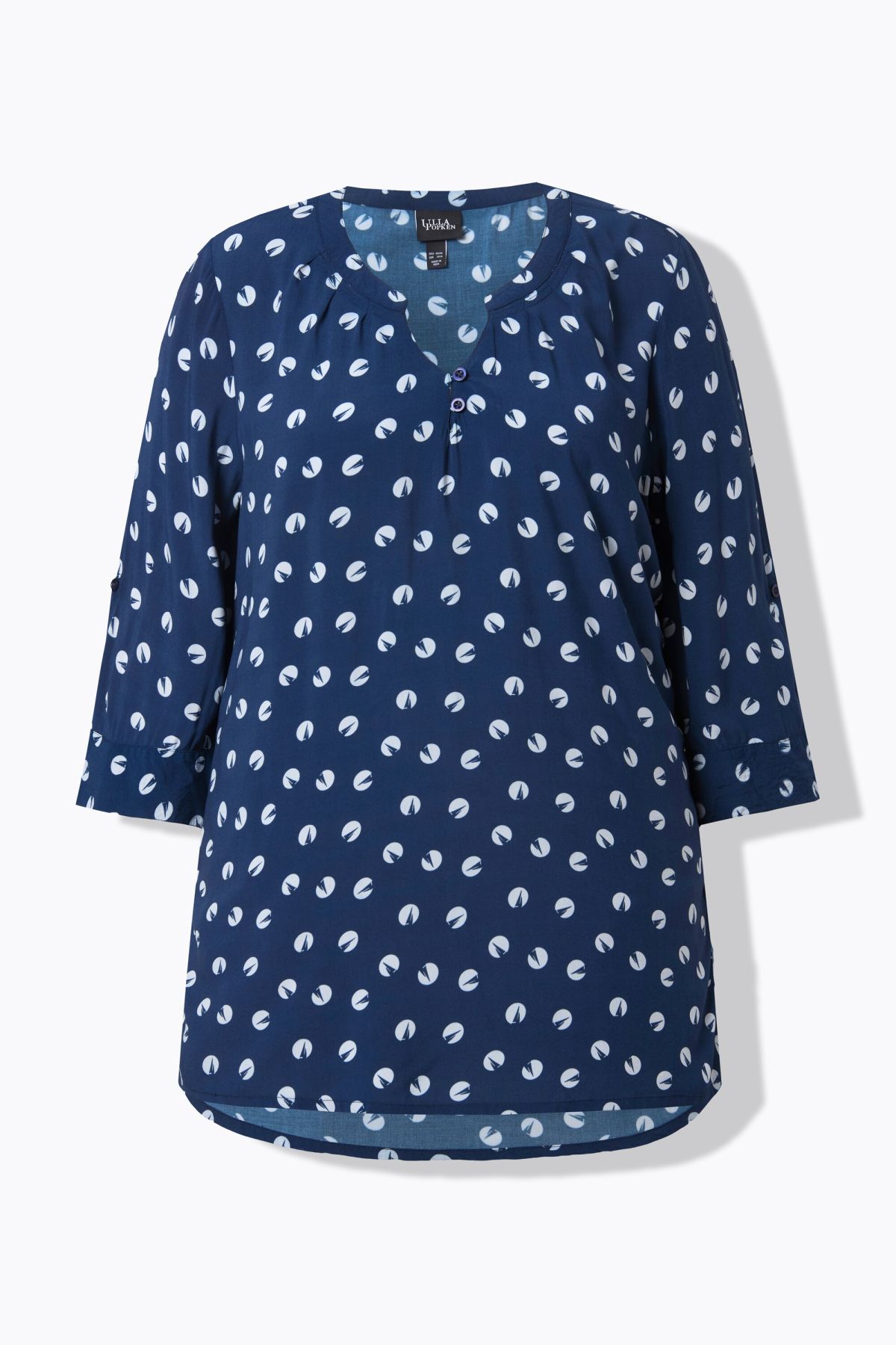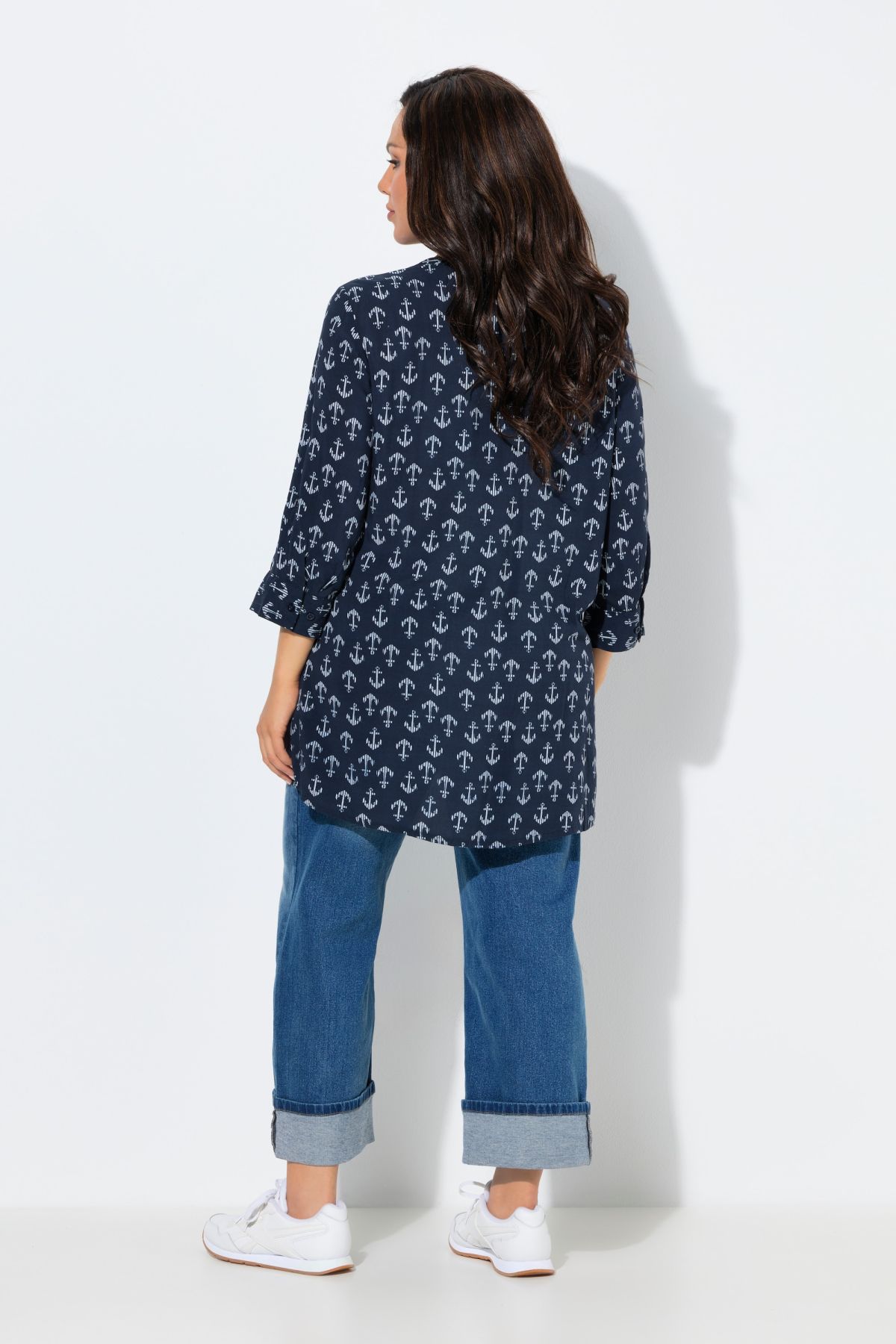 Туника с принт на котви, с кръгло деколте с V-образен завършек. 3/4 ръкави с маншет, свободен А-силует, странични цепки на подгъва. Изработена от мека вискоза, подходяща за топло време.
