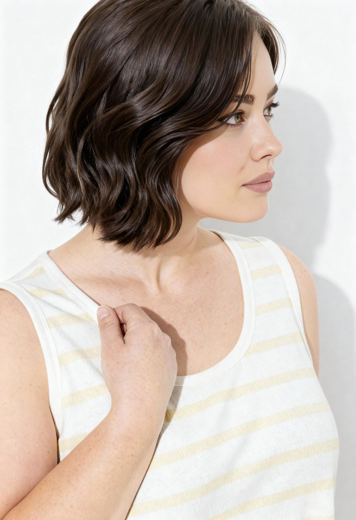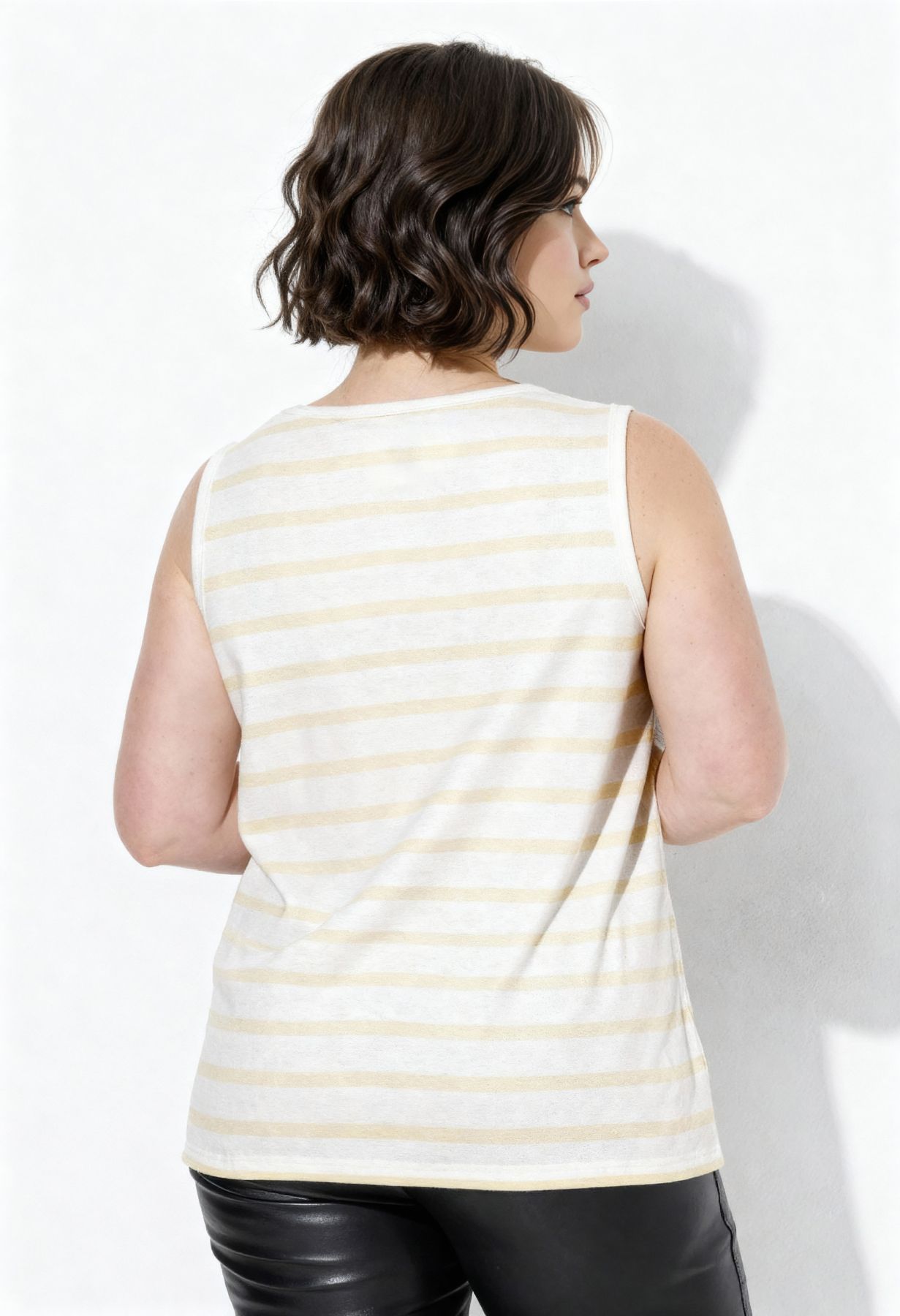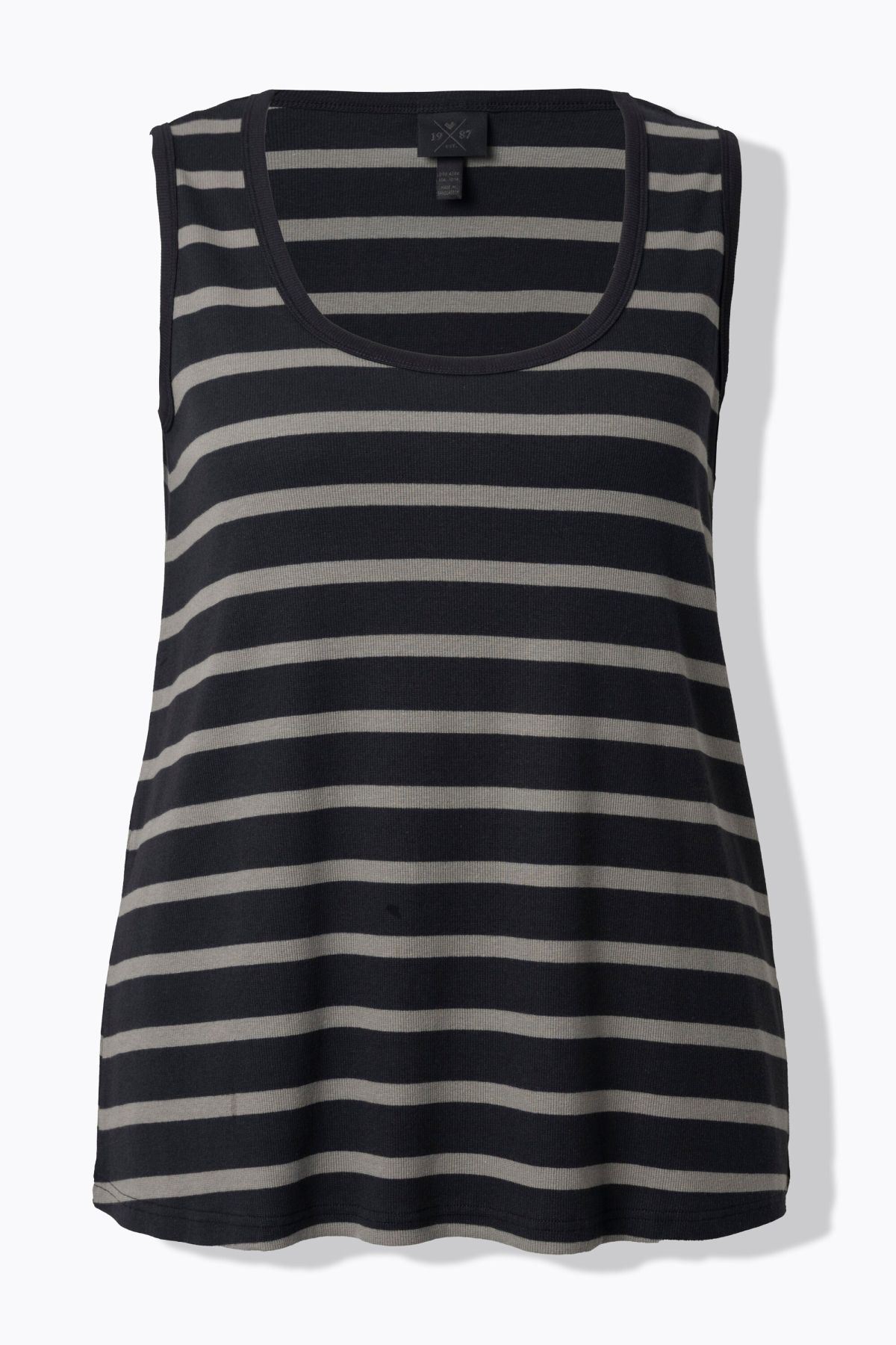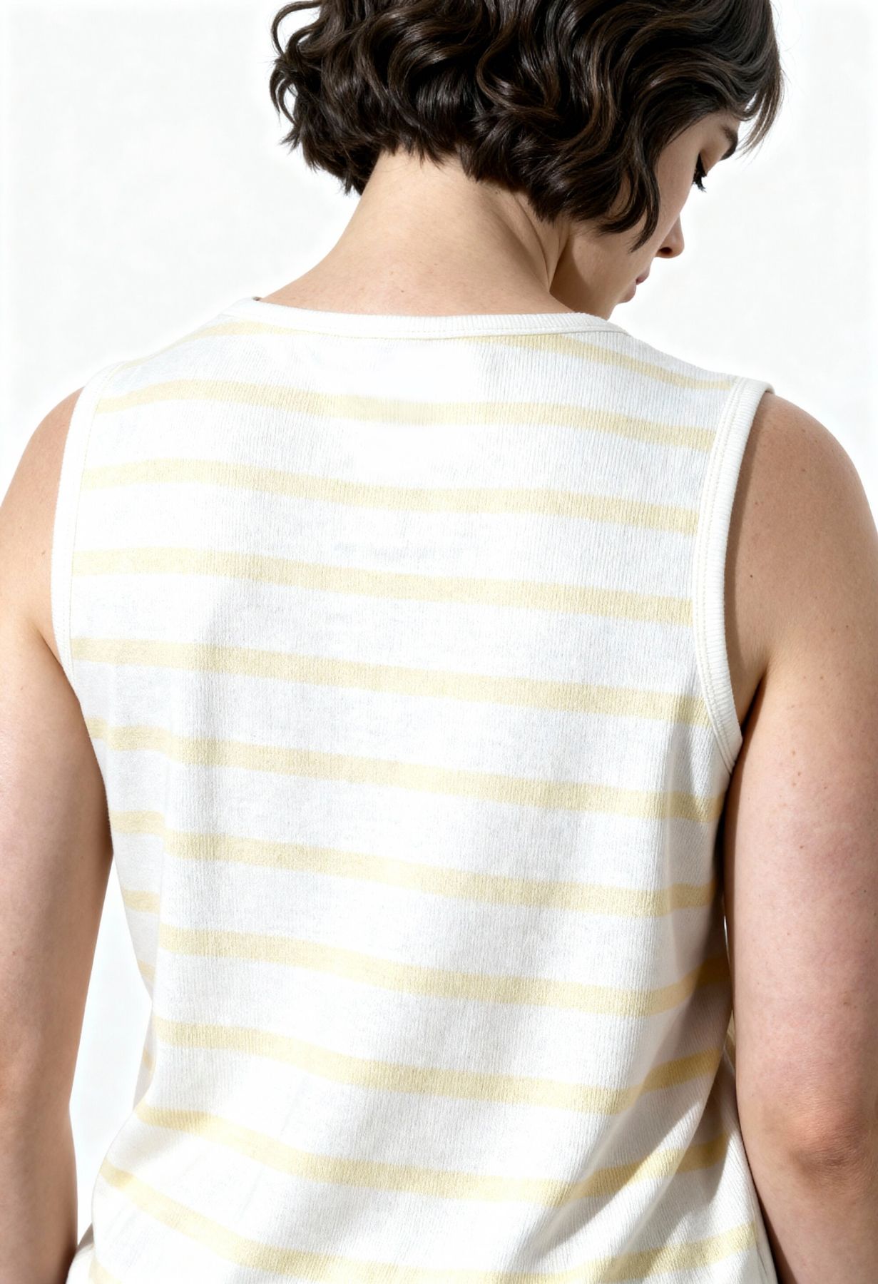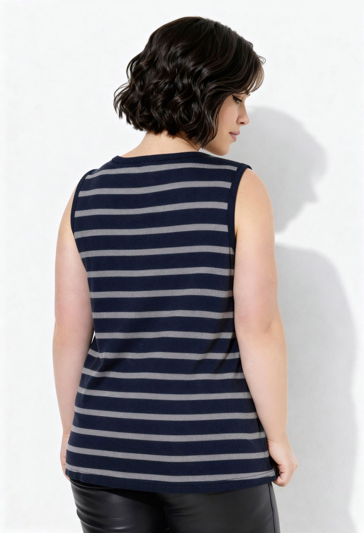 Потник с хоризонтално райе и широки презрамки. Свободно кръгло деколте, рипсени кантове и свободен А-силует. От мек и еластичен памучен плат.