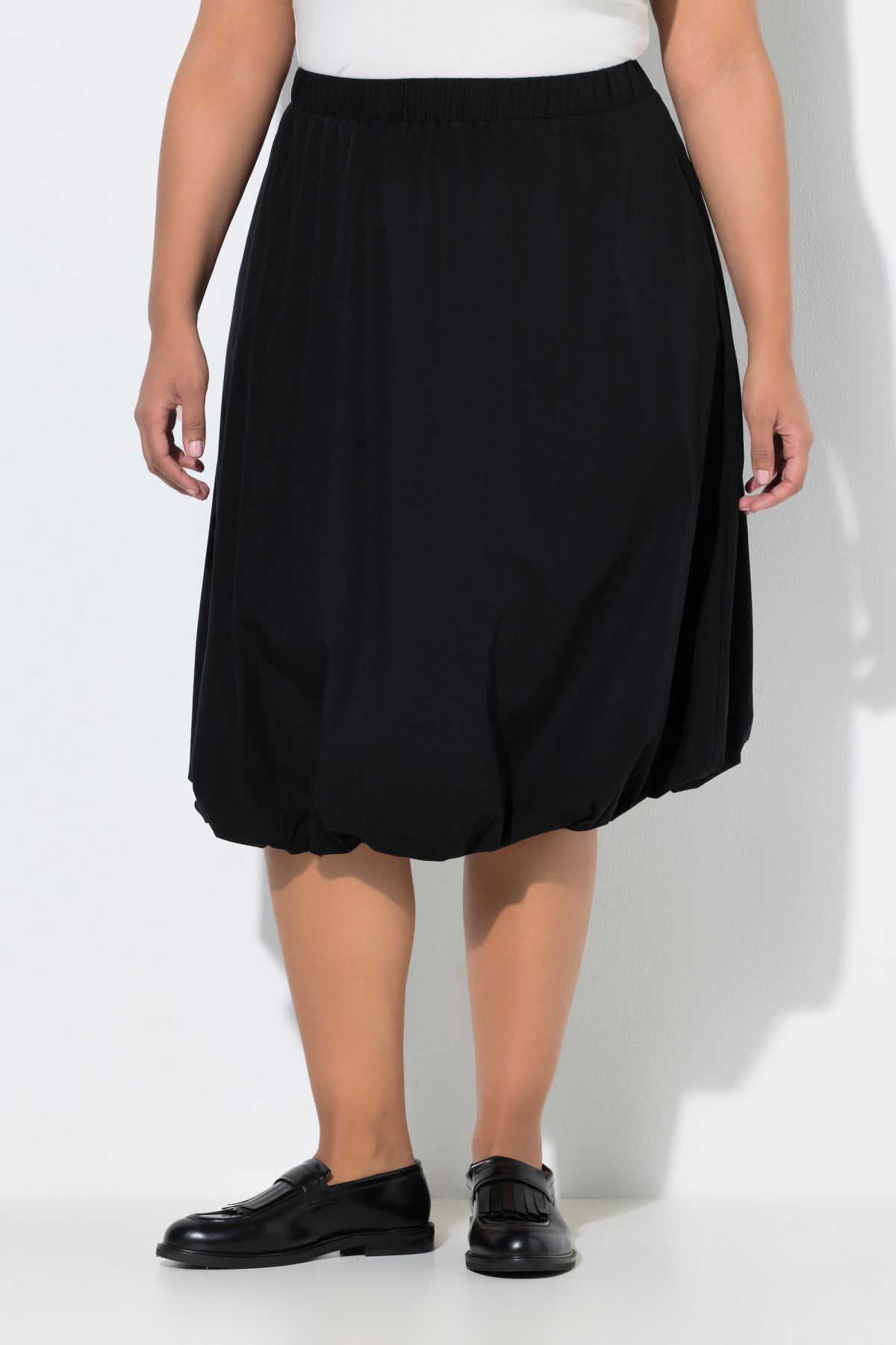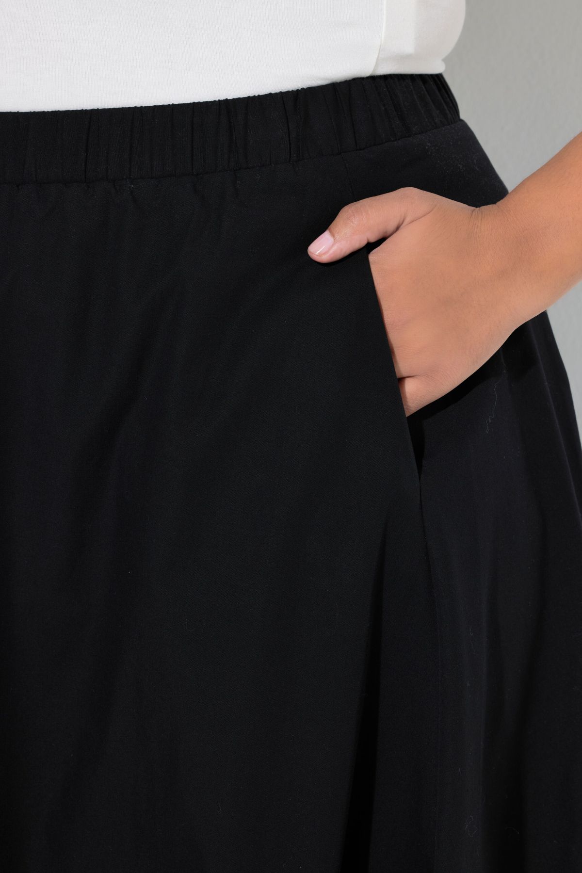 Миди пола с дължина до коленете, с подплата, еластичен подгъв и странични джобове. Изработена от памучен материал.
