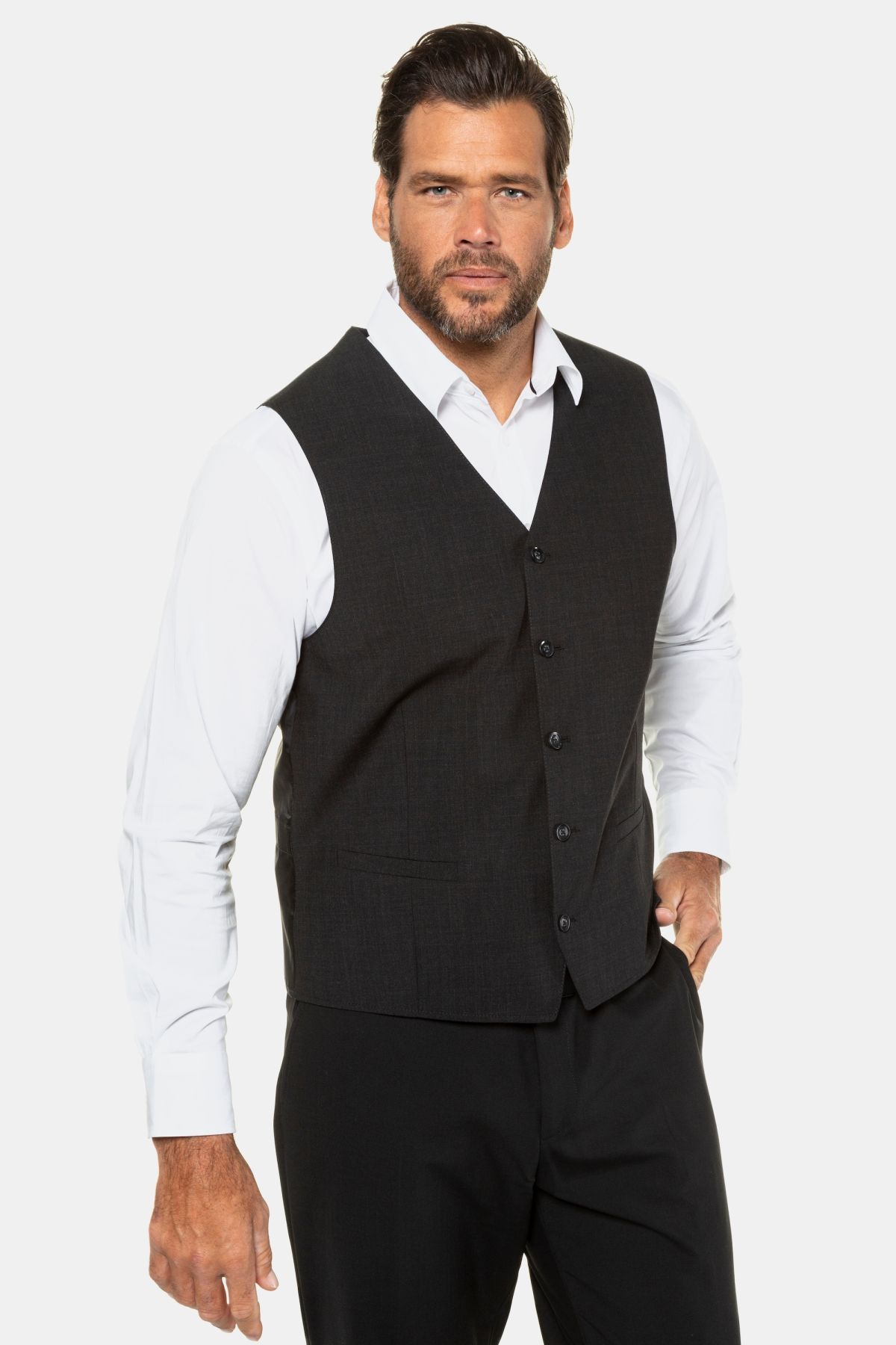 Жилетка с 5 копчета до размер 72/36, FLEXNAMIC® - патентован комфорт при носене, лесно поддържащо се качество от необработена вълна, първокласен строителен комплект Zeus, адаптирана към размера дължина приблизително 61-71 cm.